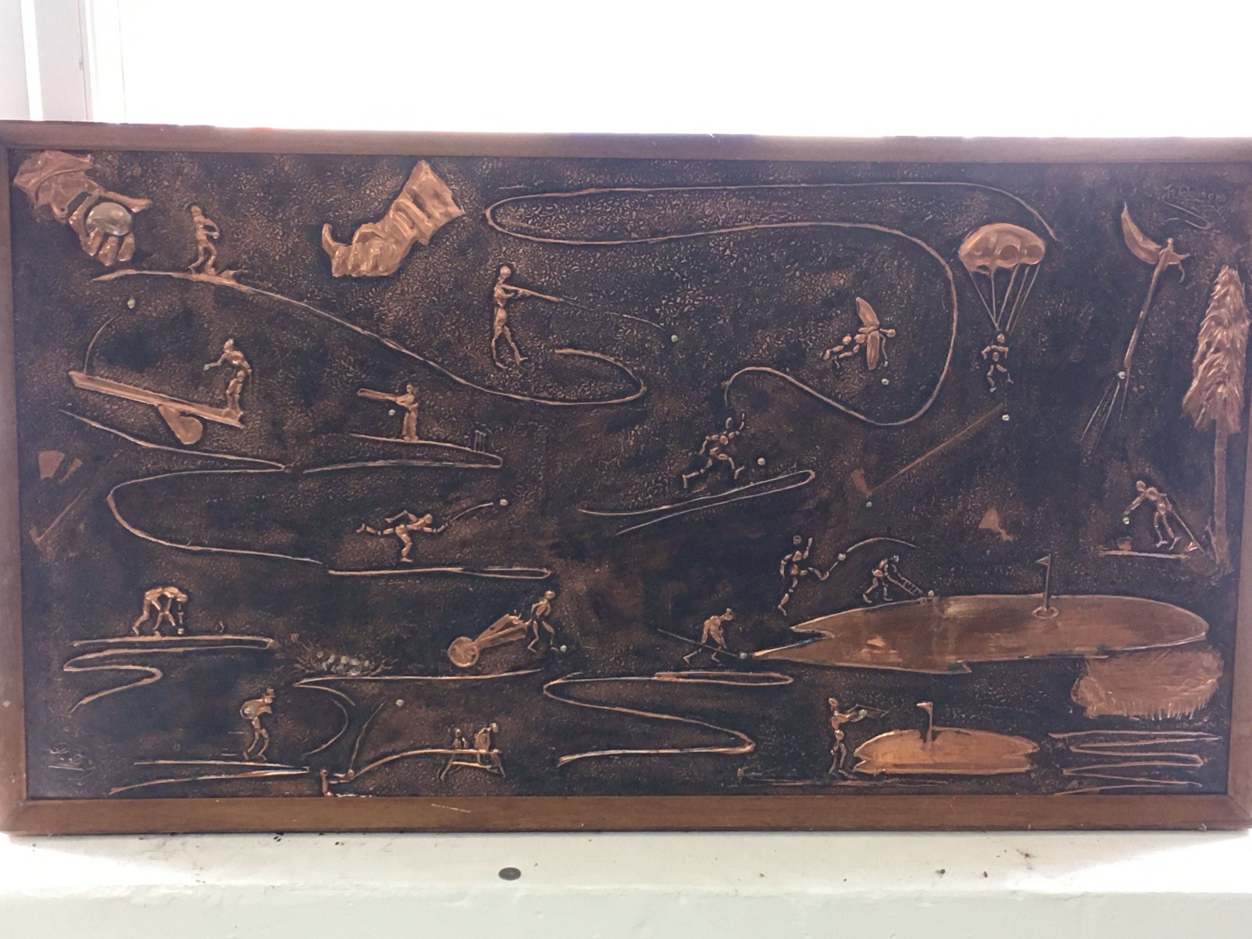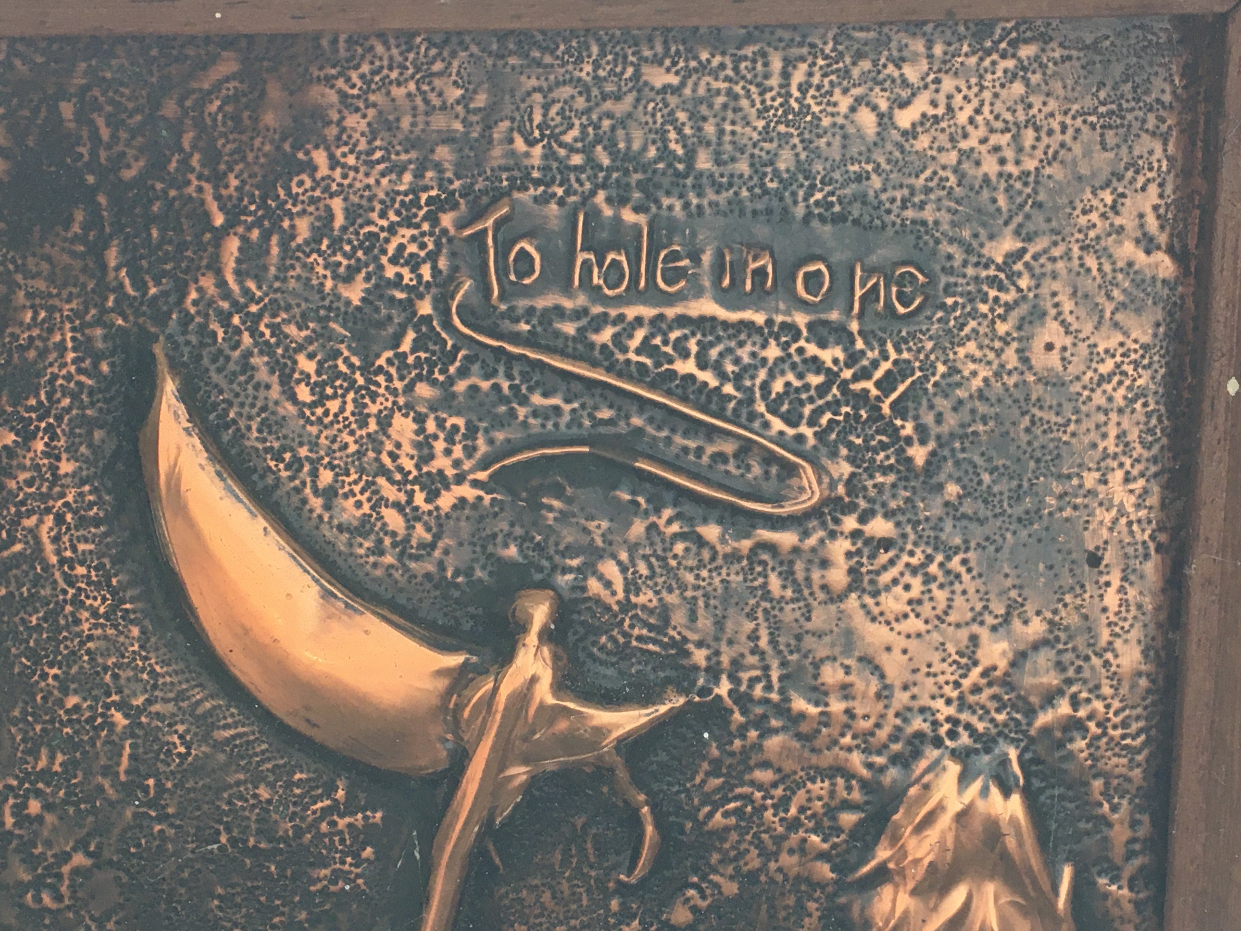 A large copper picture showing a number of sporting activities titled to hole in one. artists name is Richard Dent