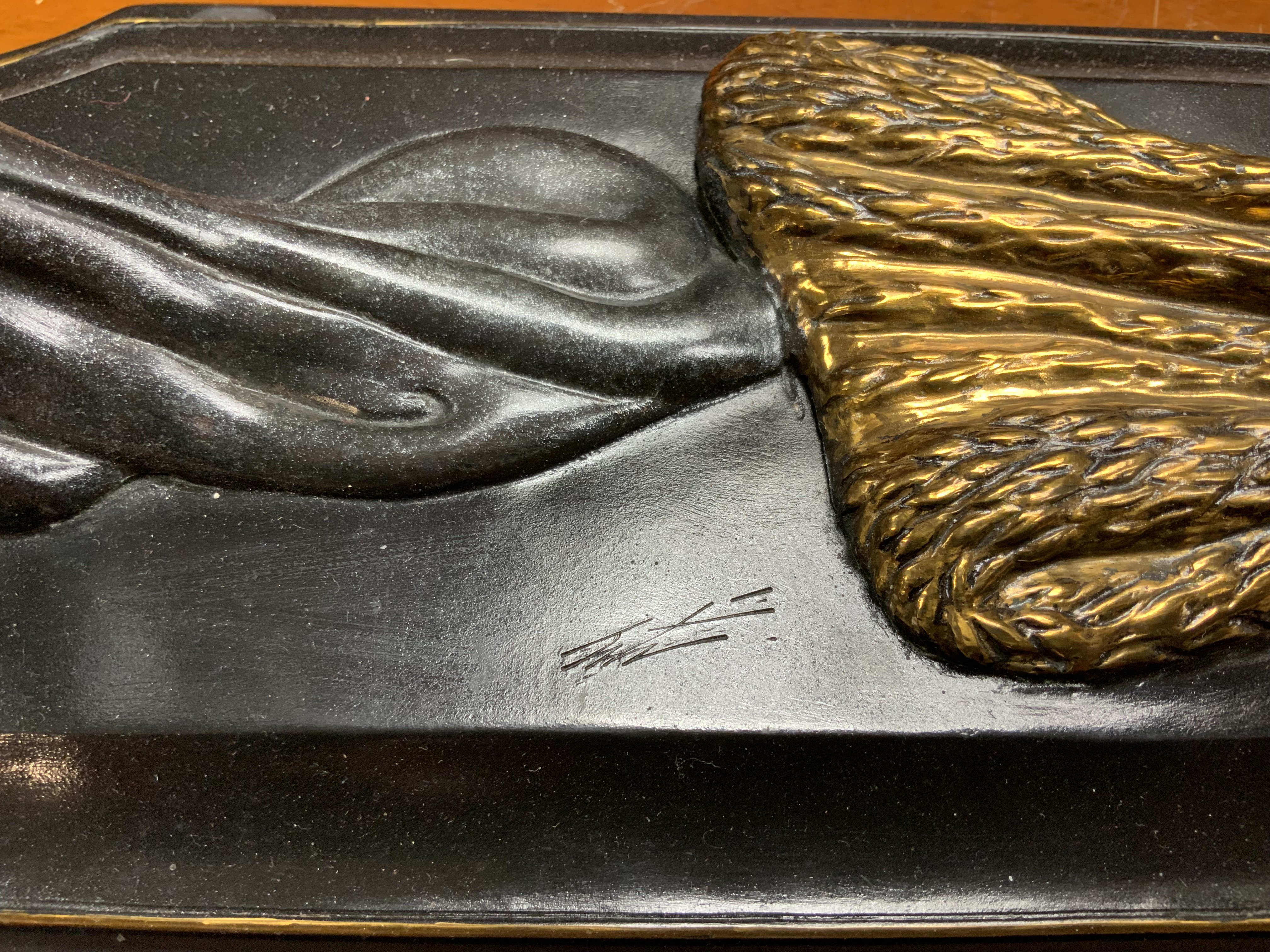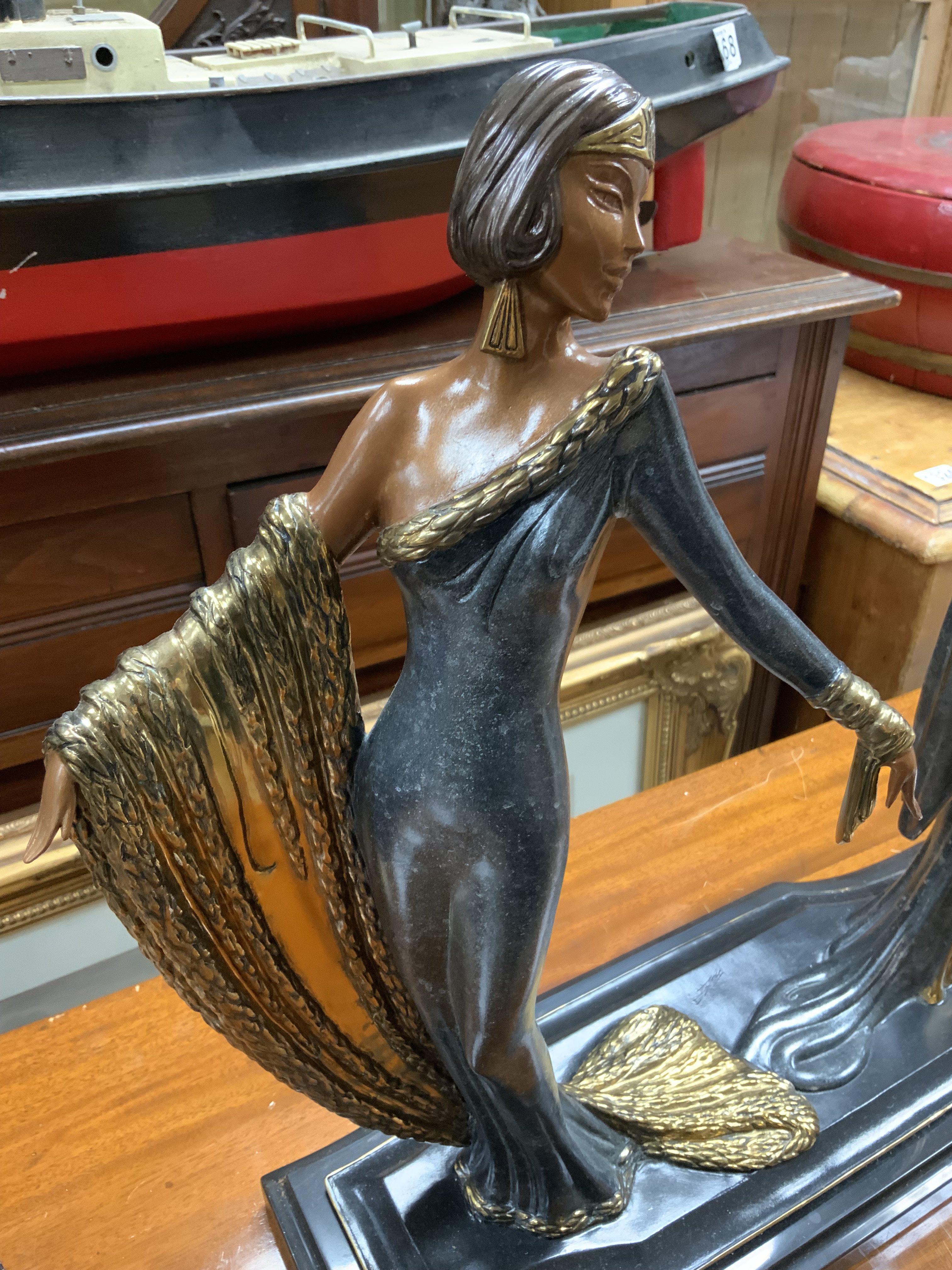 A cold painted bronze sculpture from Erte (Romain De Tirtoff 1892-1990): Duetto design, Stamped on reverse. AP (Artist Proof) 11/12 copyright 1989, Sevenarts Ltd London. 43cm x 48cm x 18.5cm.
