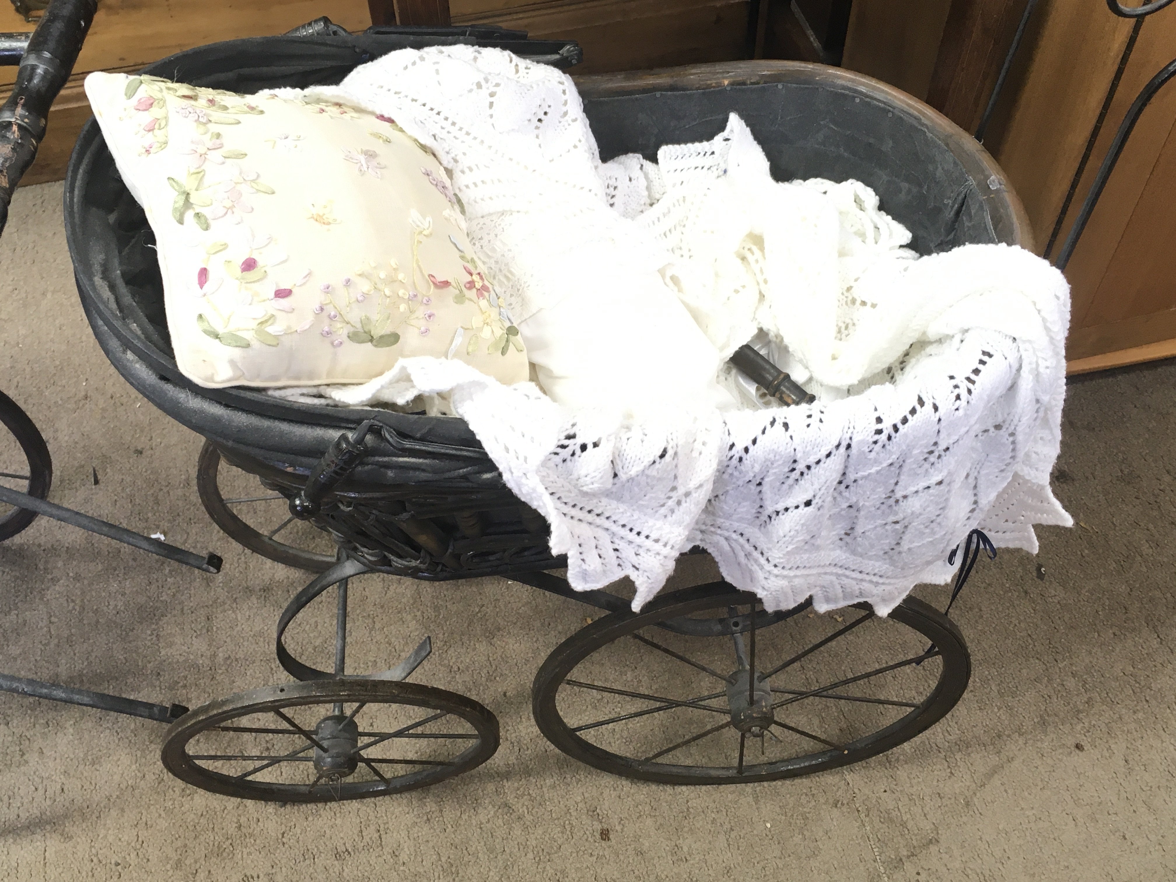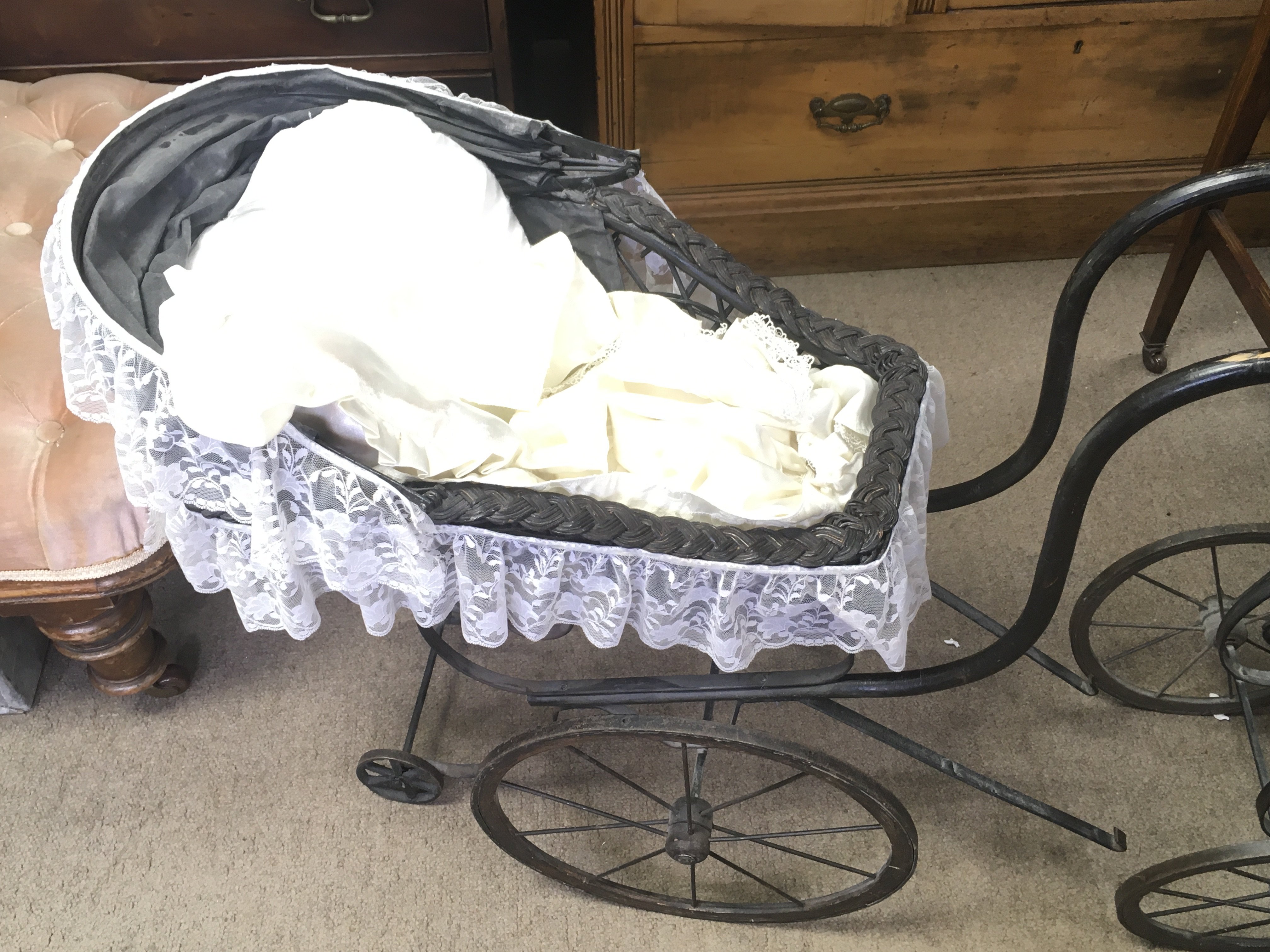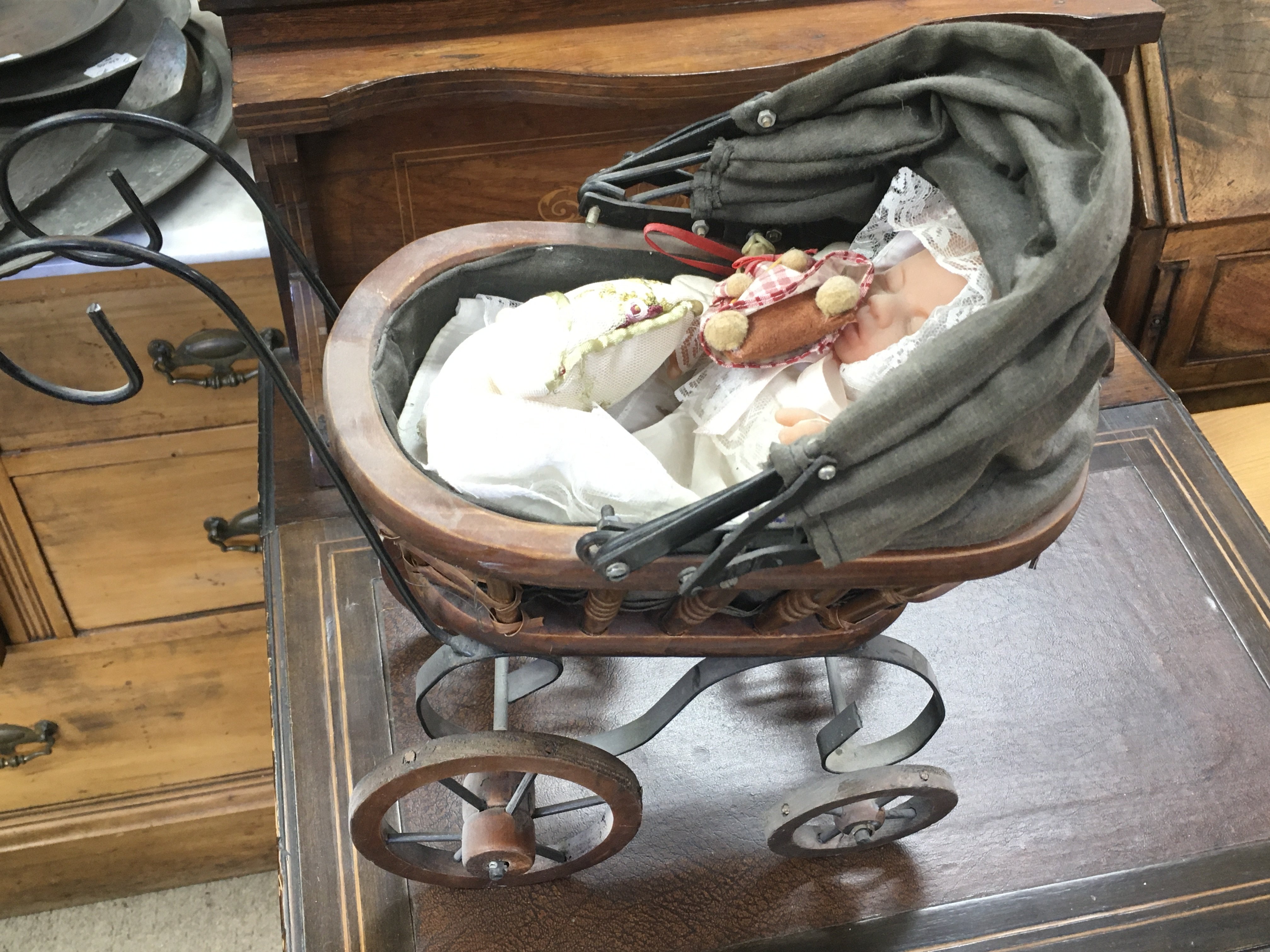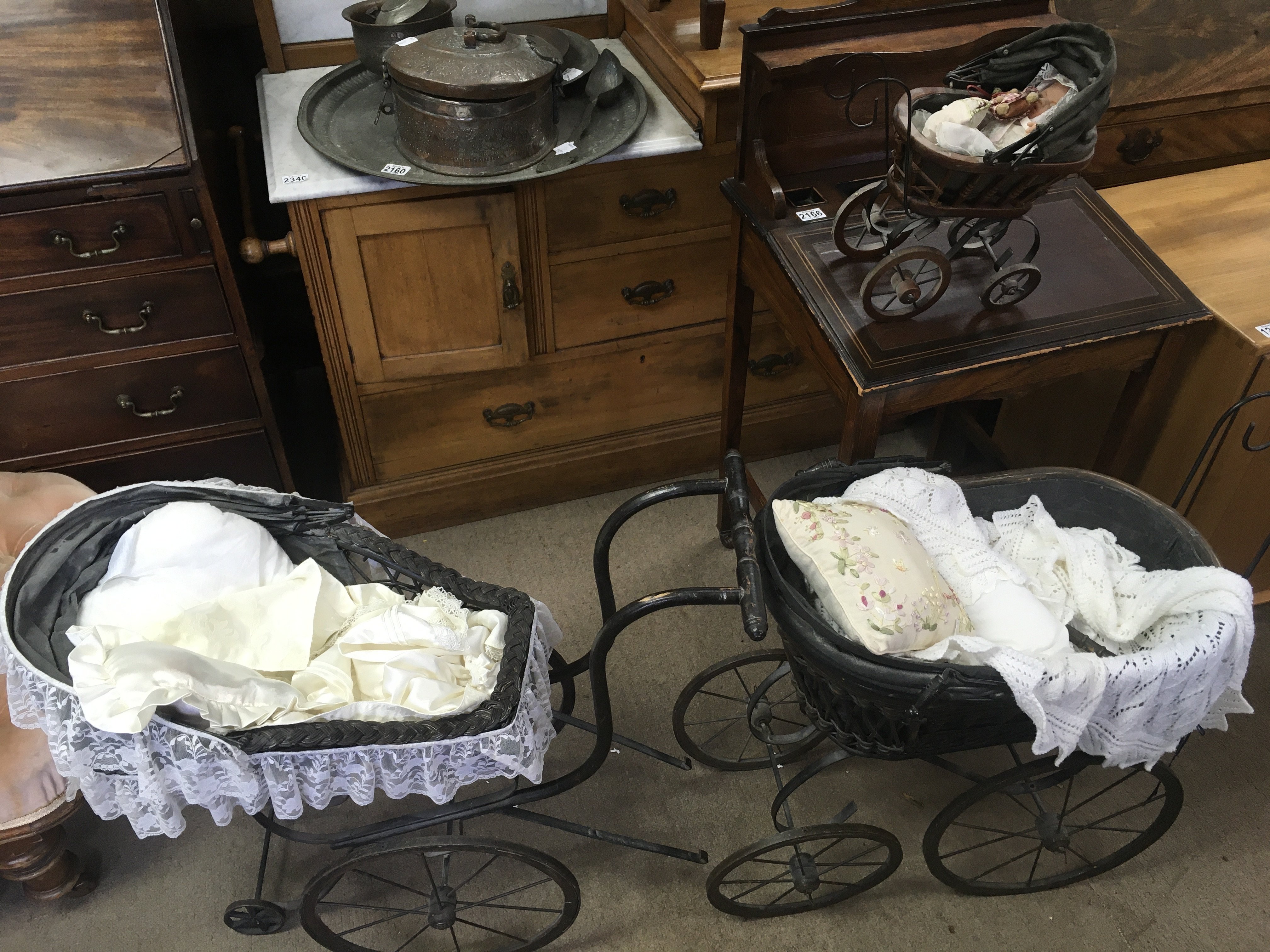 Two vintage dolls prams and a small pram with doll.