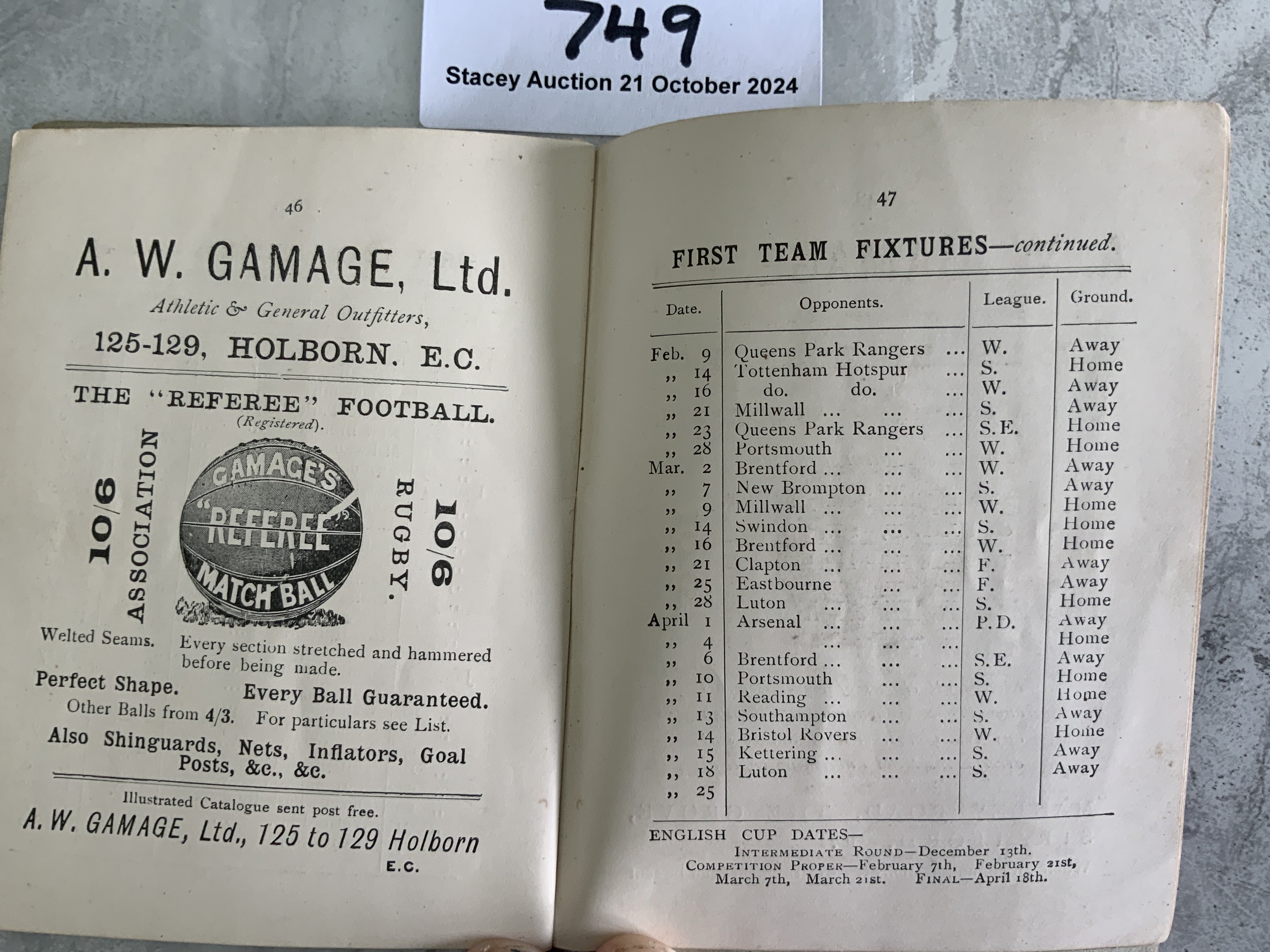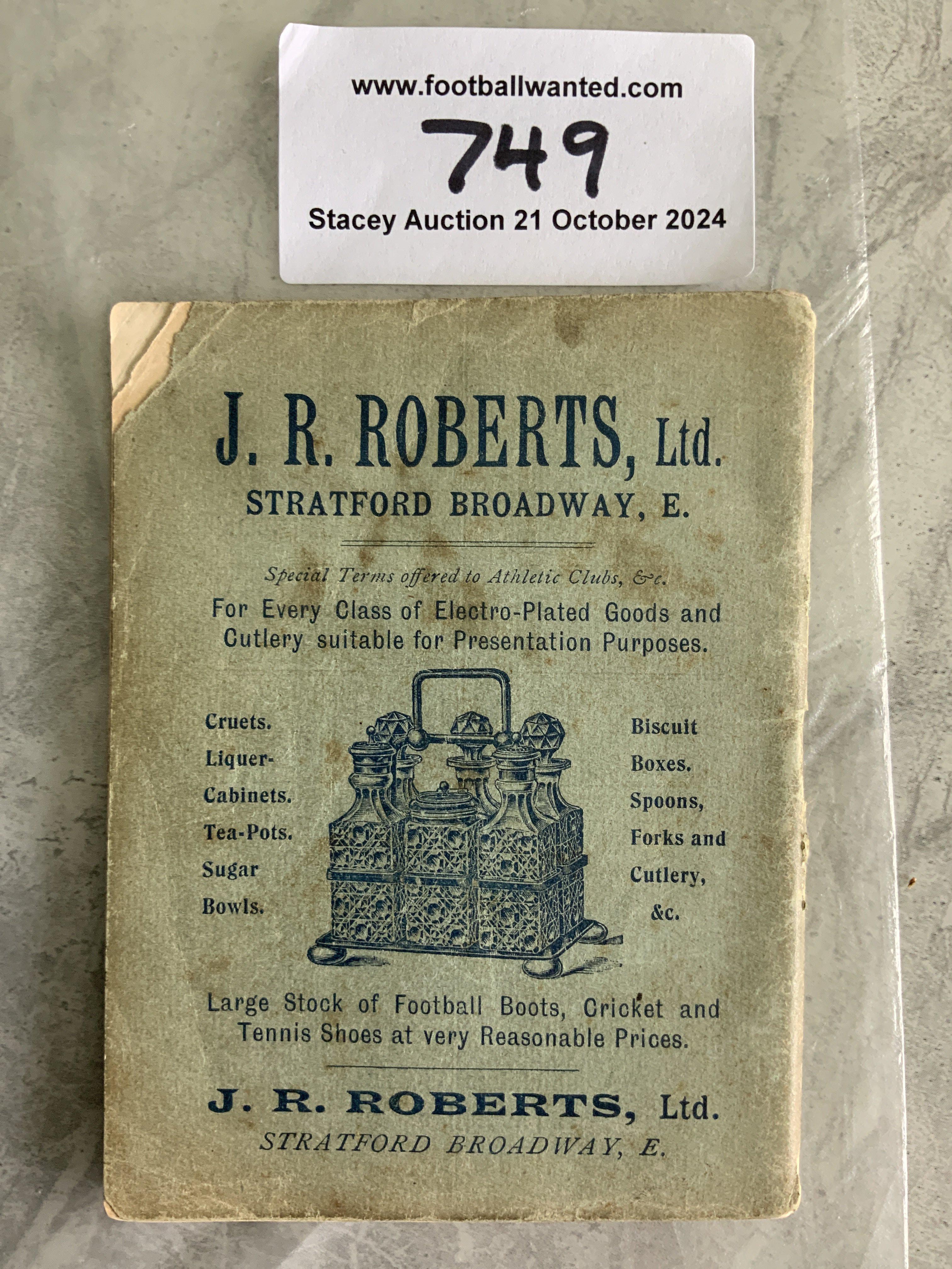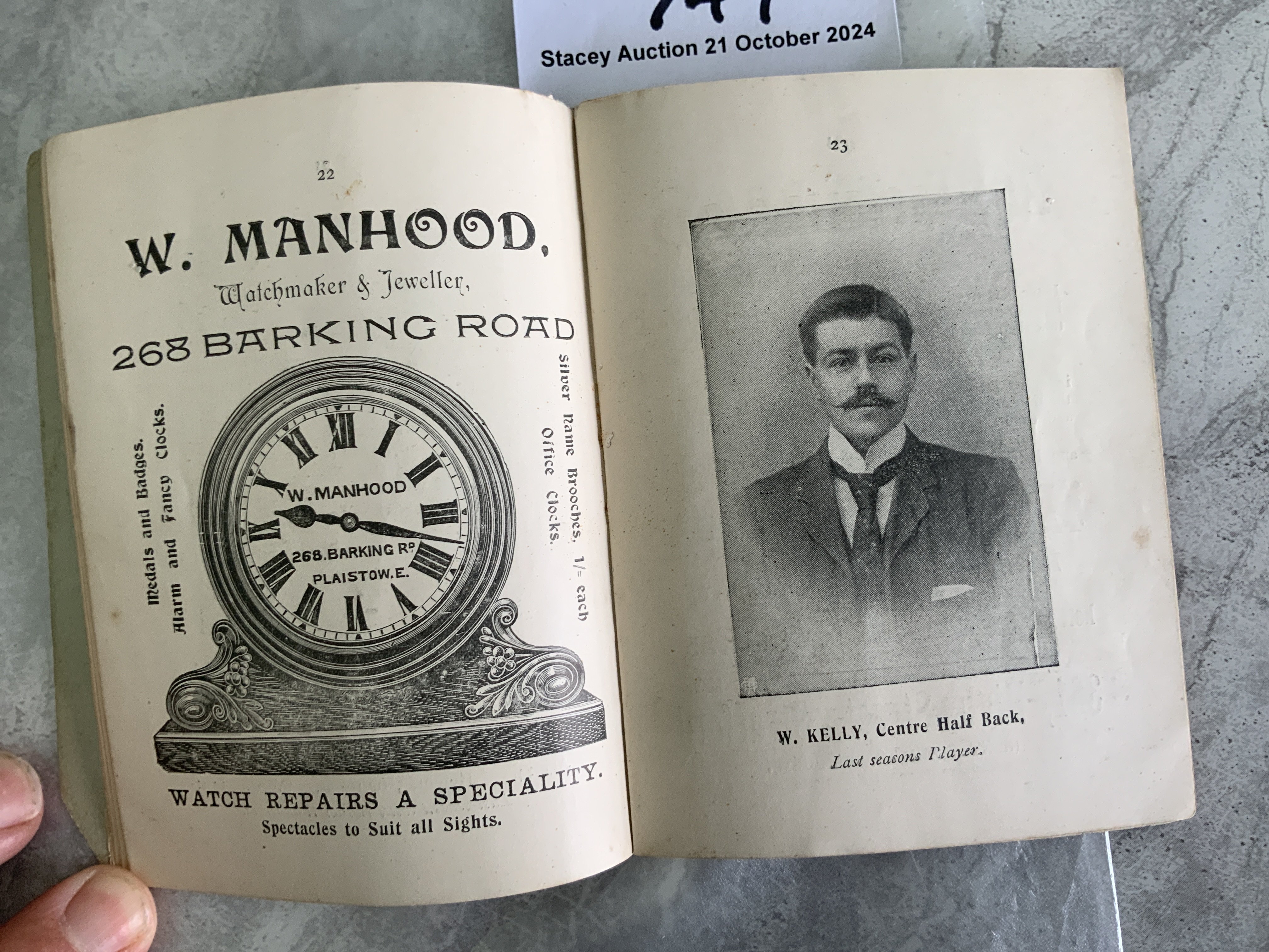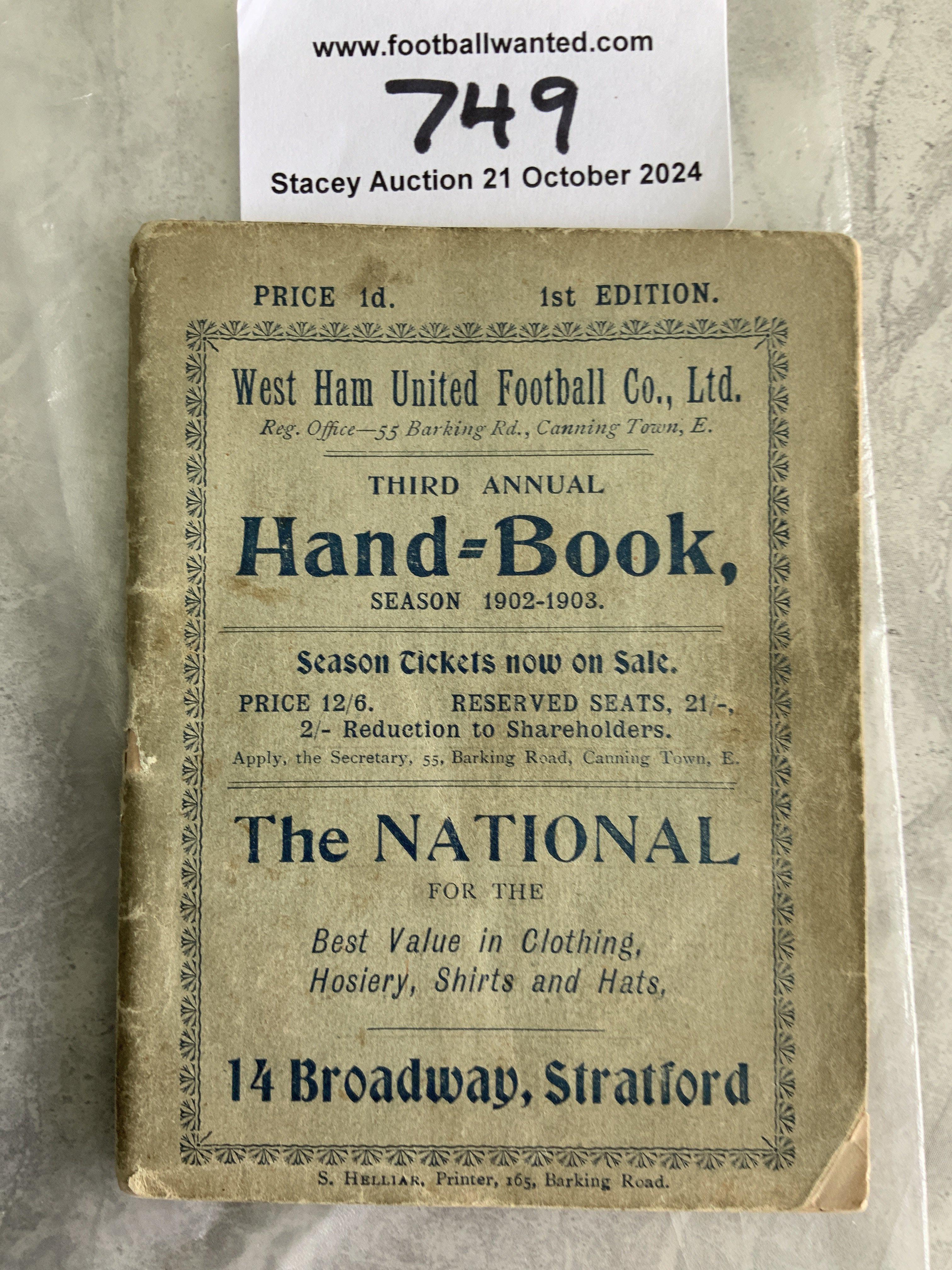 1902 - 1903 West Ham Football Handbook: Rare 58 page handbook in good condition with a tiny piece out of corner on front and back. Individual pictures of the players with some great adverts including Helliars printers who printed the handbook. Only the third handbook in their history.