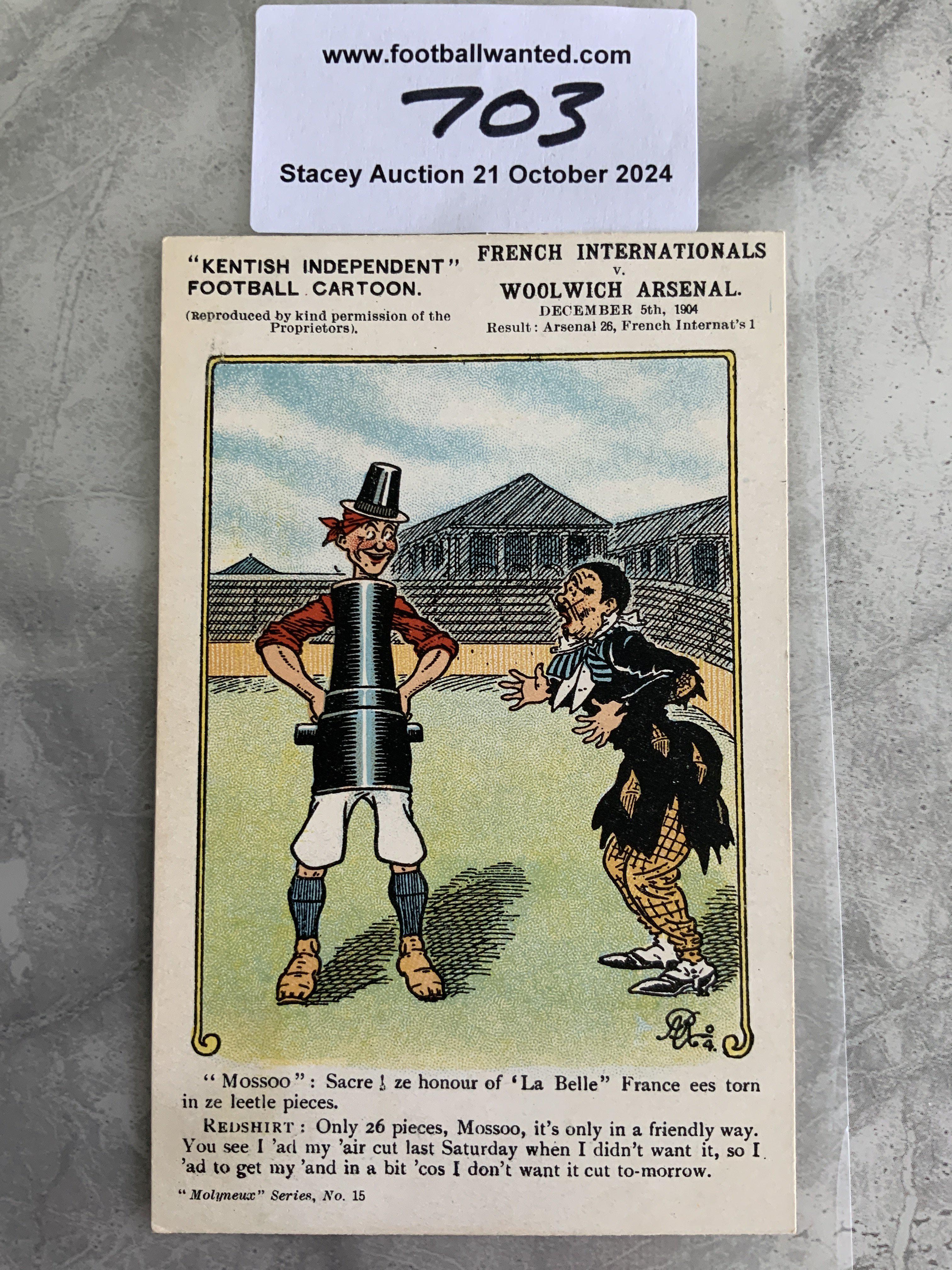 1904 Woolwich Arsenal v France Football Postcard: Cartoon postcard titled French Internationals v Woolwich Arsenal issued by the Kentish Independent. Arsenal won the match by a record score of 26-1. Very good condition.
