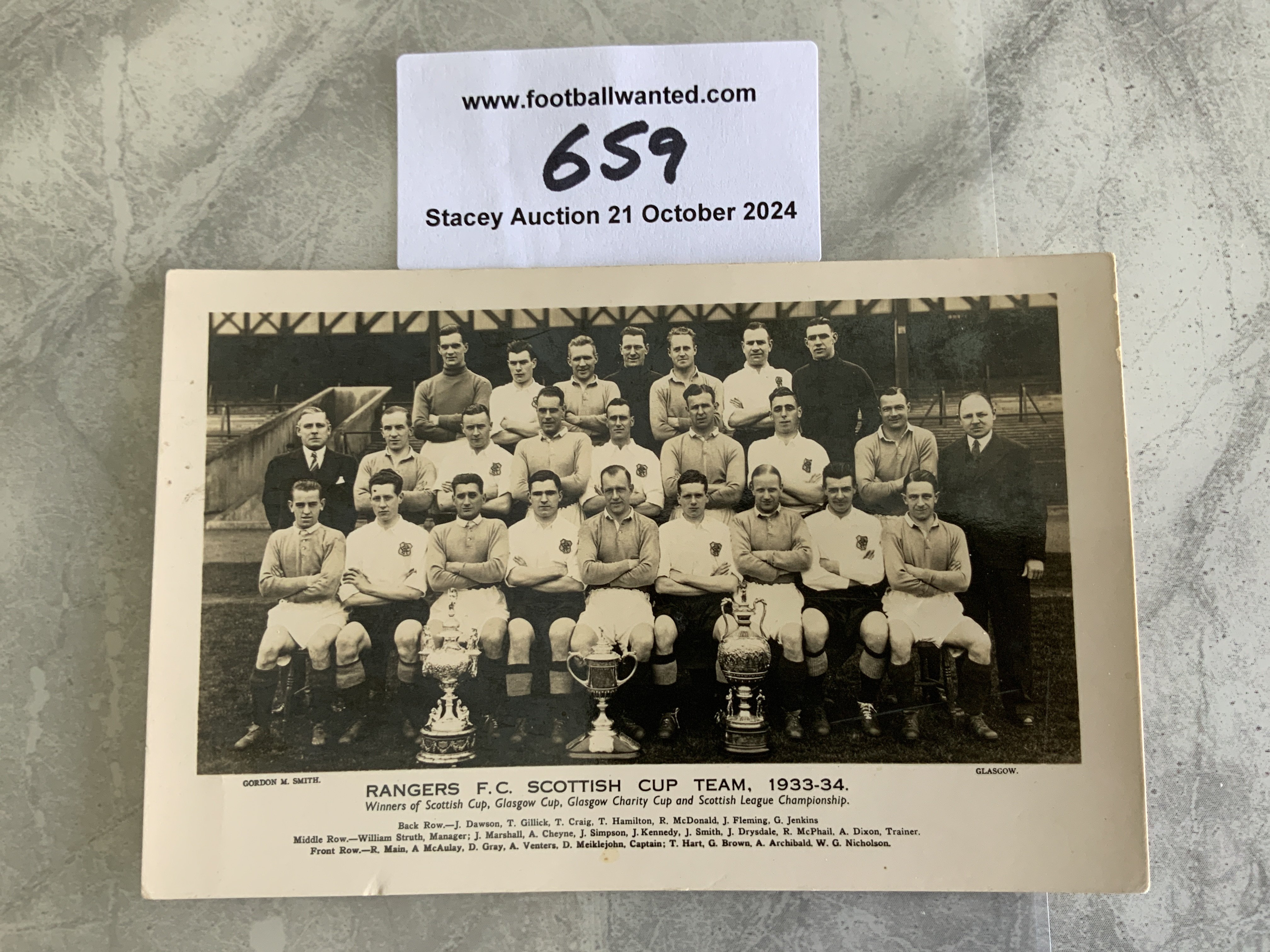 Glasgow Rangers 33/34 Football Team Group Postcard: Squad pictured with 3 cups with title stating Rangers FC Scottish Cup Team. Good condition with unwritten back.