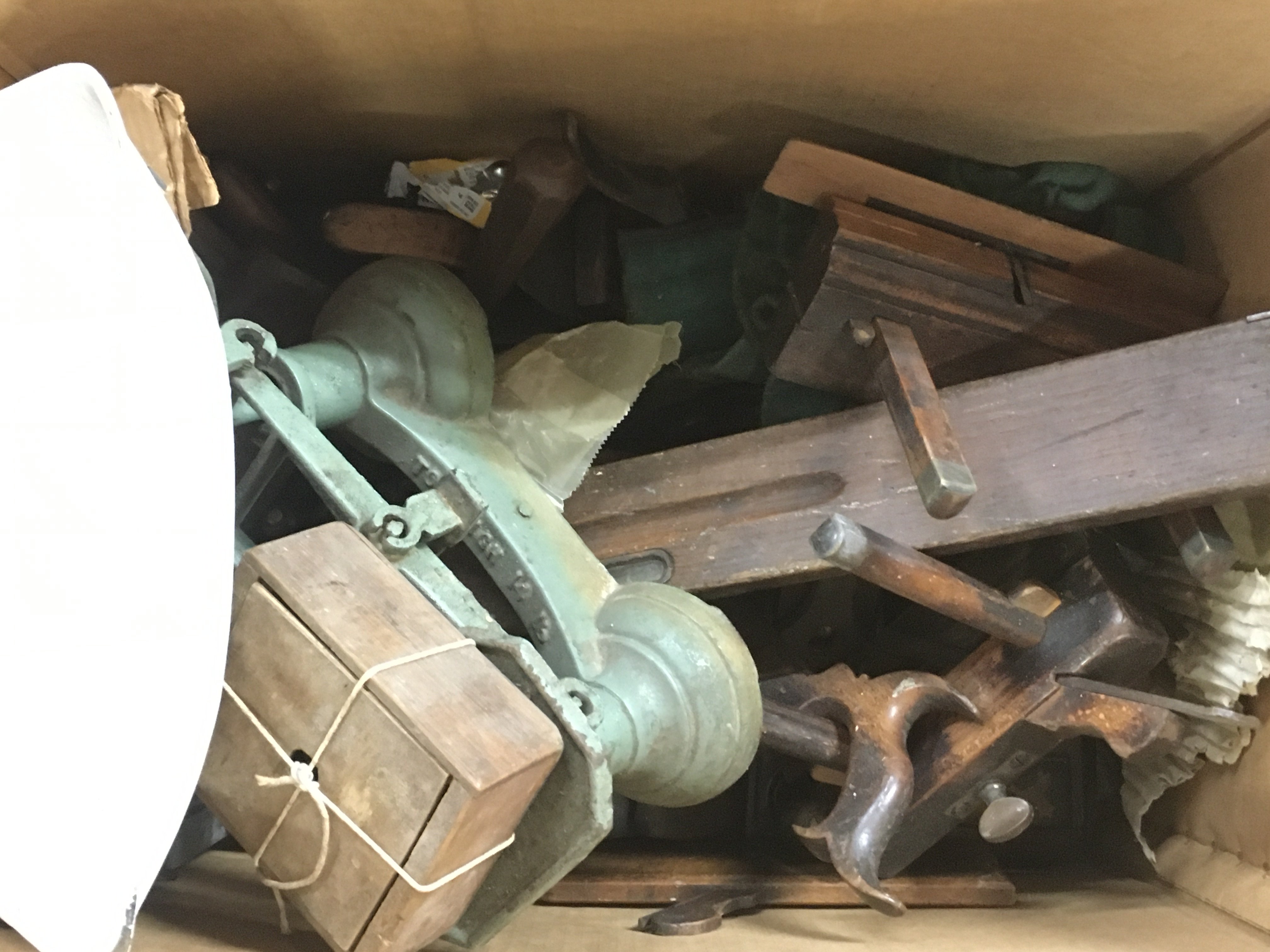 A large collection of vintage woodworking tools including wood planes and a set of scales