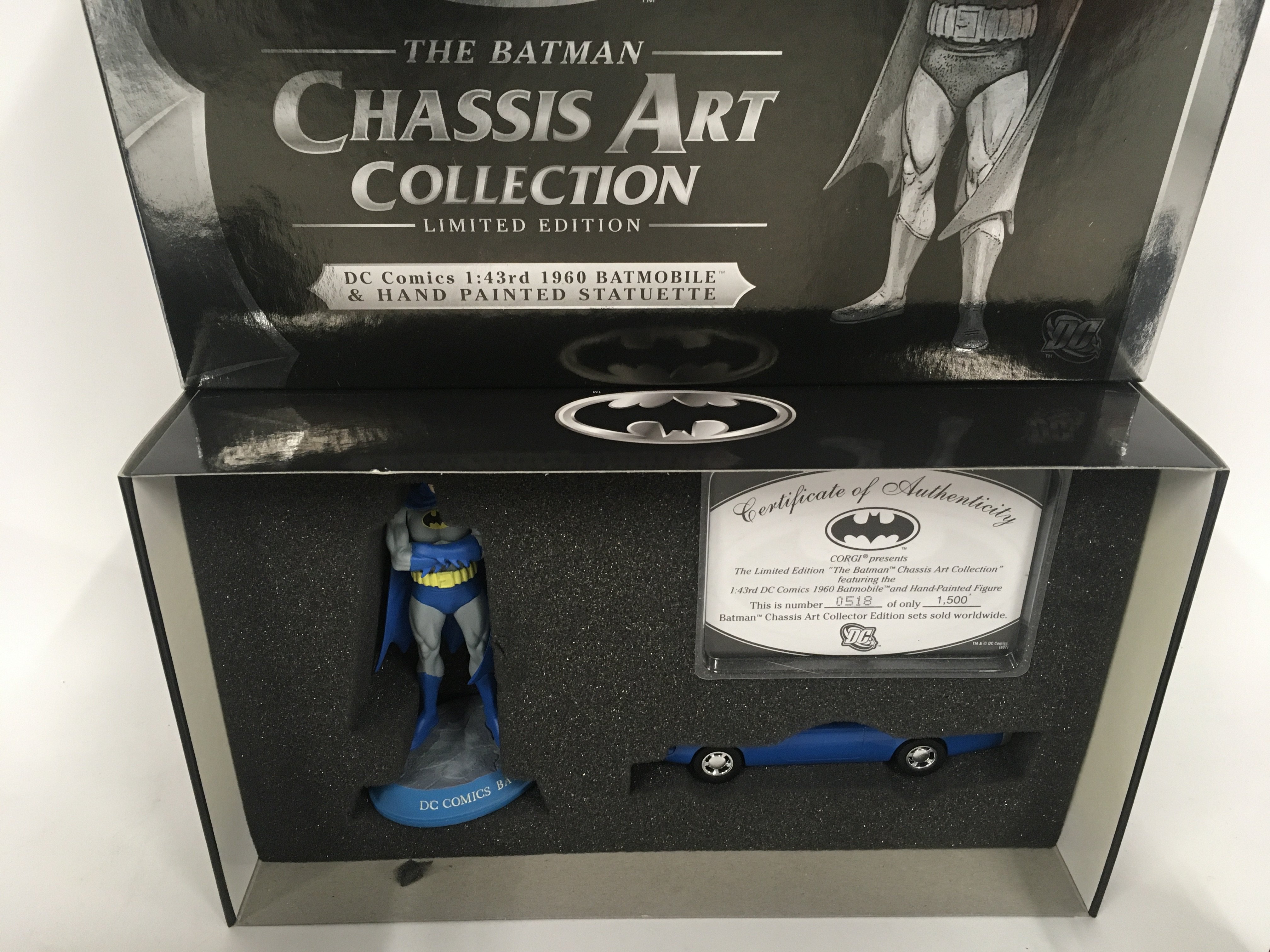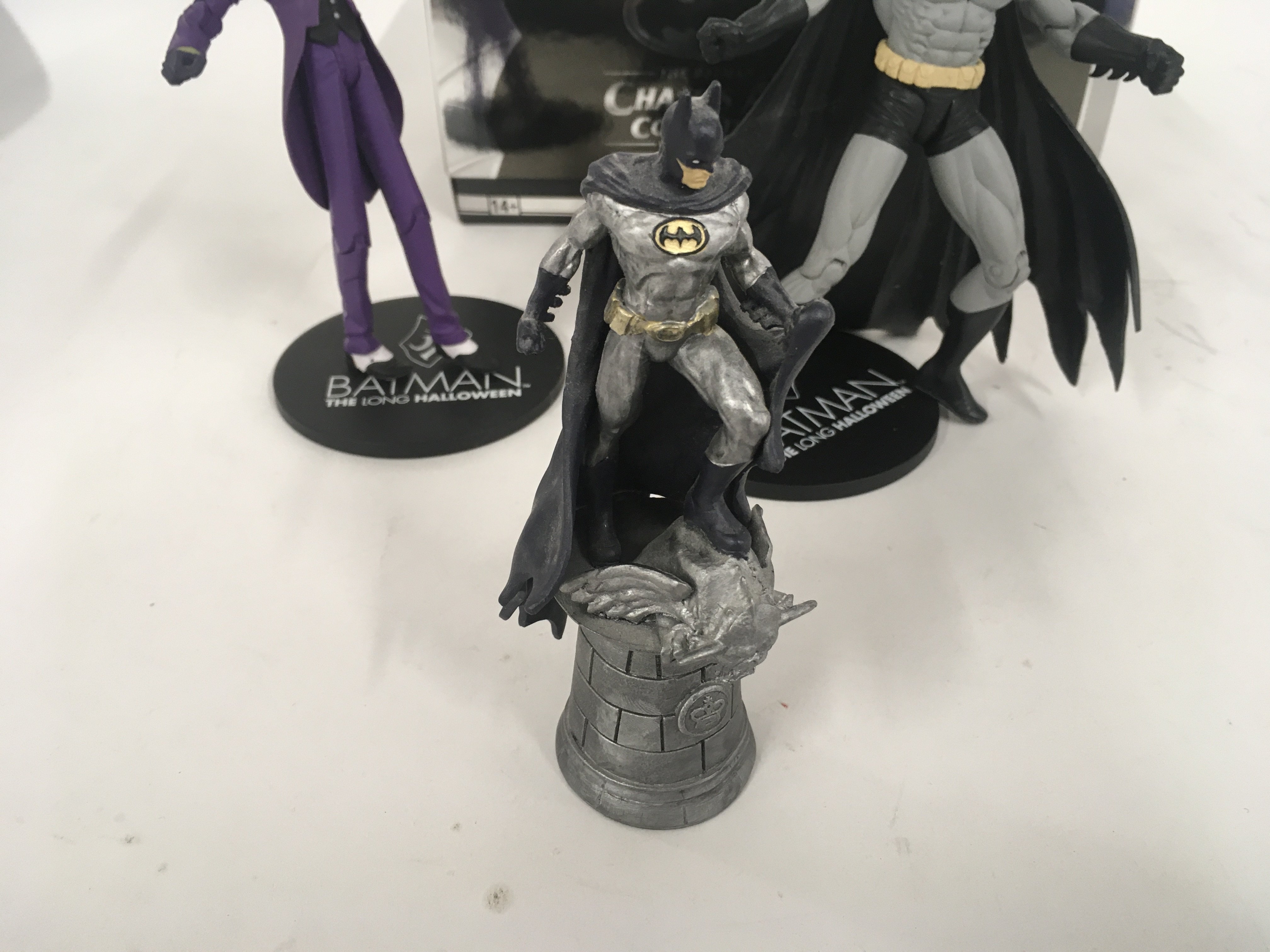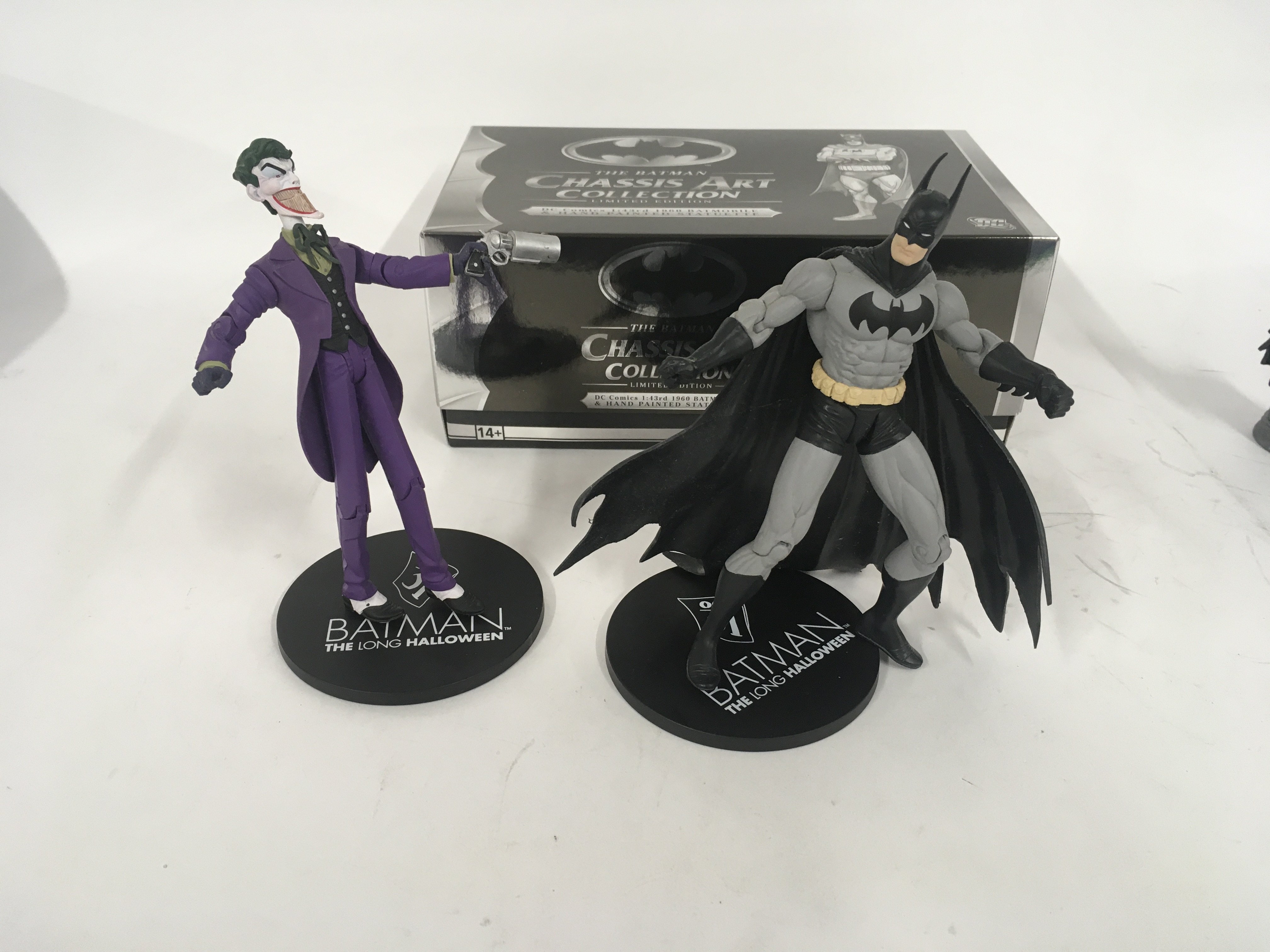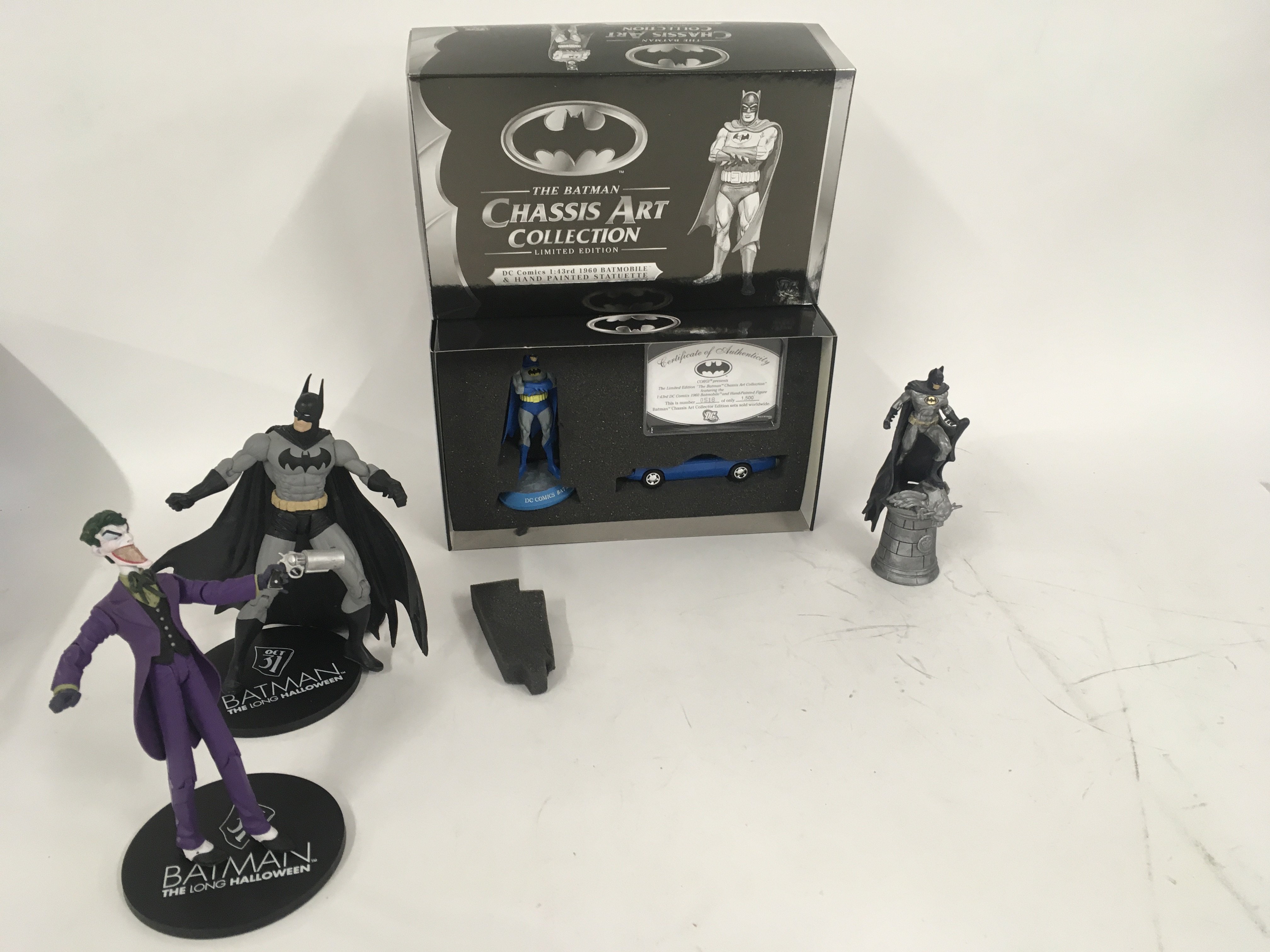 A collection of Batman figures including boxed limited edition Chassis Art Batman and 1960 Batmobile.. The Long Halloween Batman and joker and Batman Chess piece. NO RESERVE