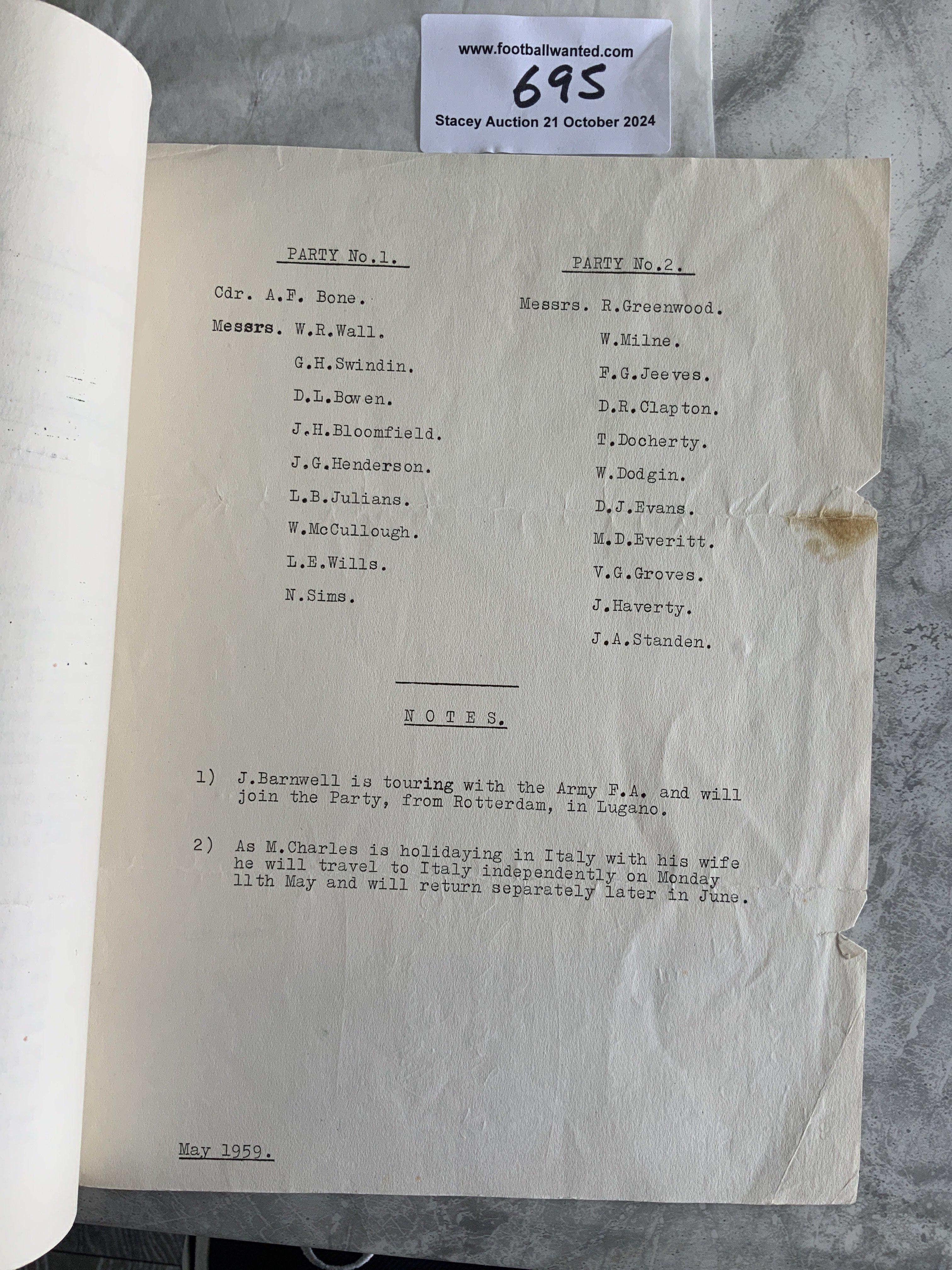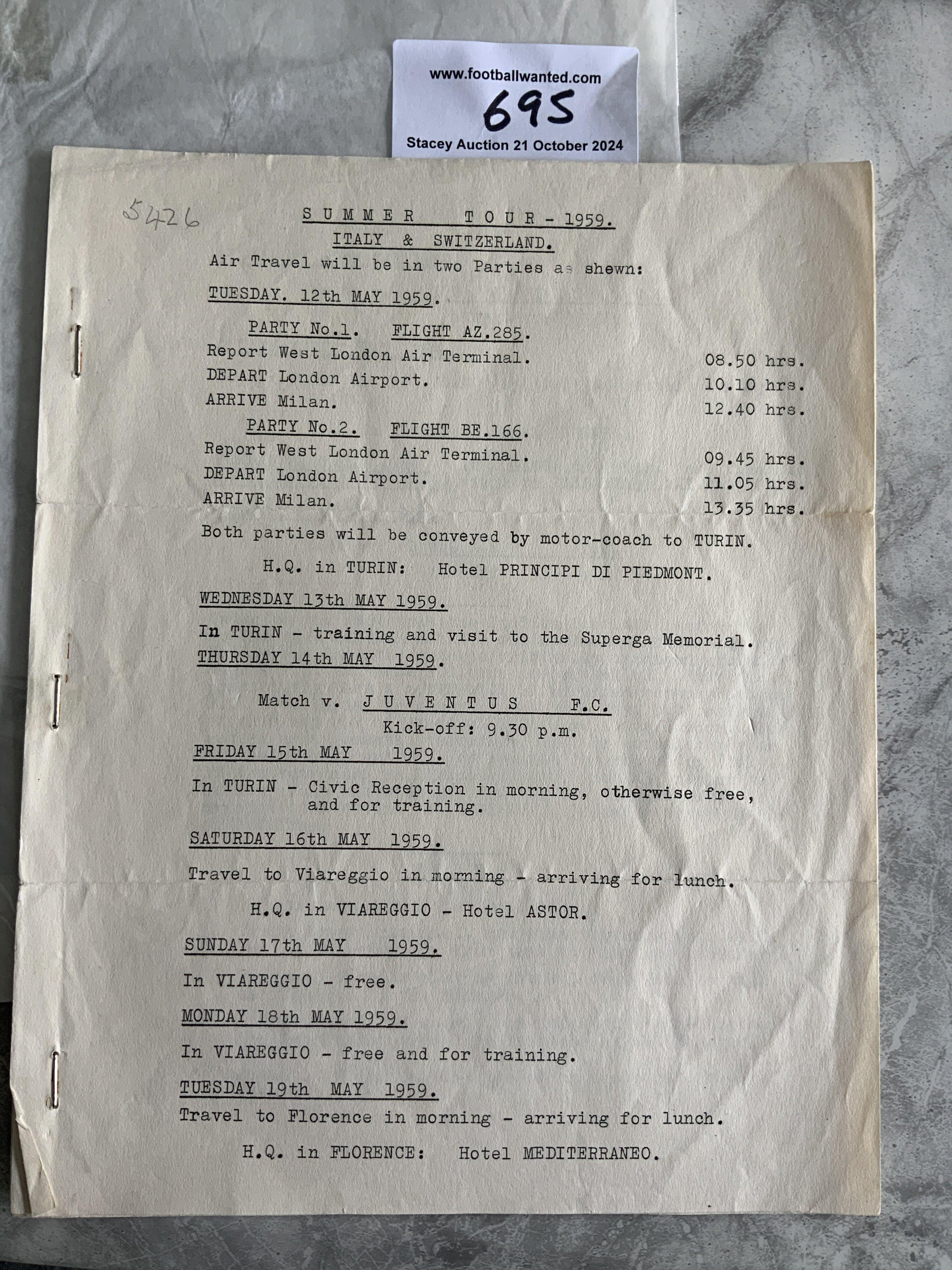 Arsenal 1959 Football Tour Itinerary + Photos: Italy and Switzerland players Itinerary for May 1959. 3 typed pages giving information of travelling party flights matches and speaks of postponed fixtures and possible matches also on this tour. C/W 7 privately taken photos including possibly unseen team groups.