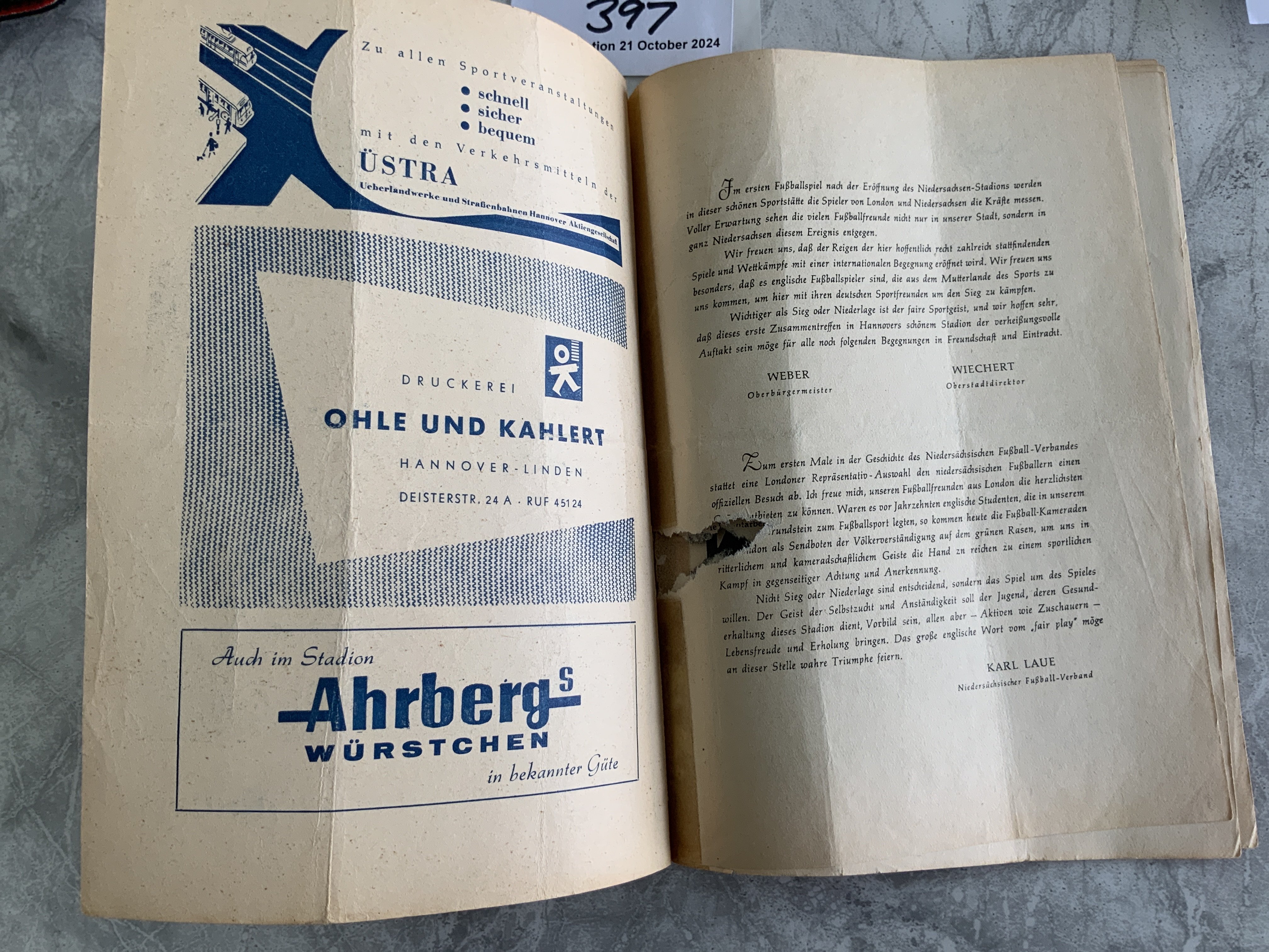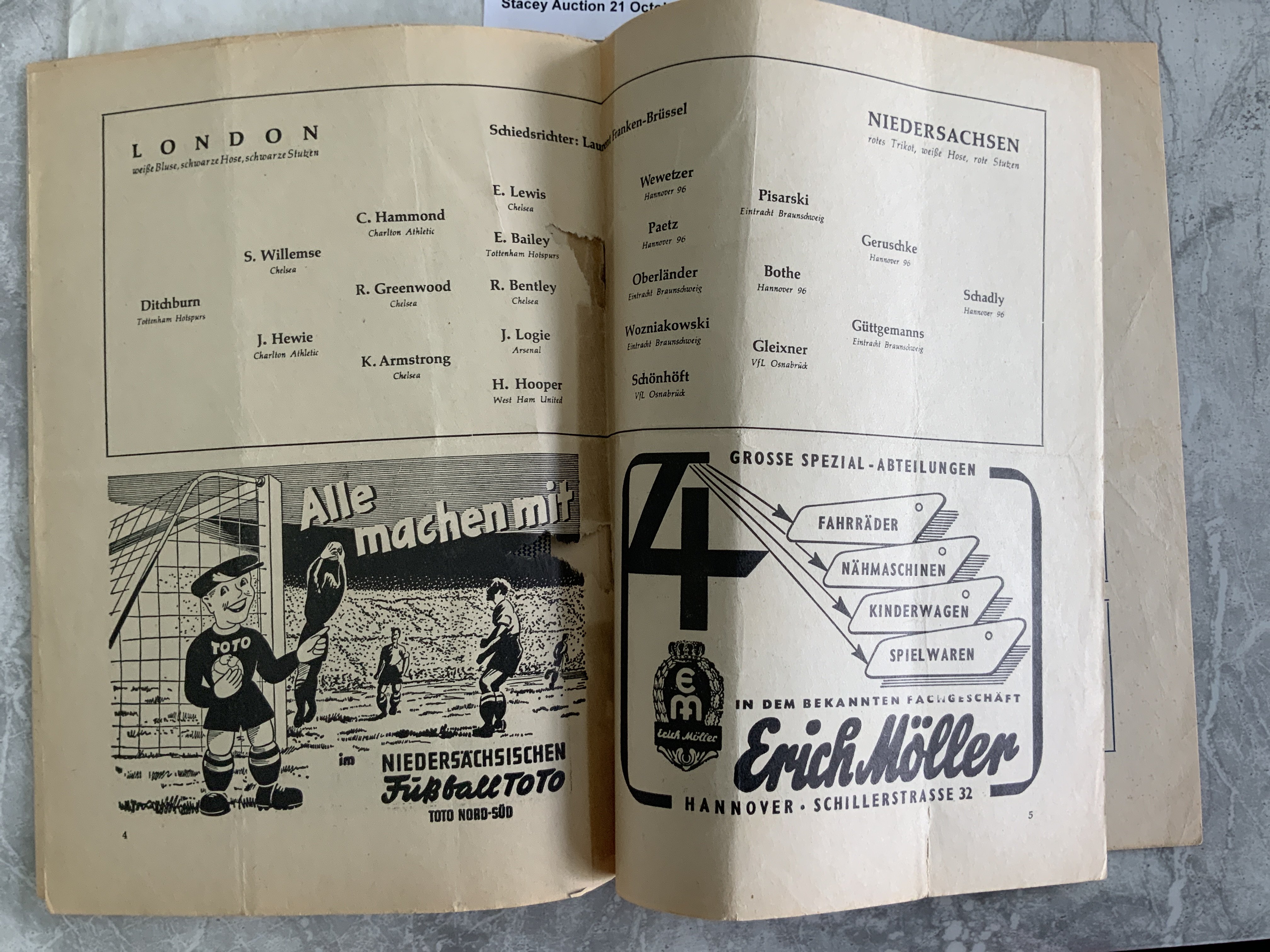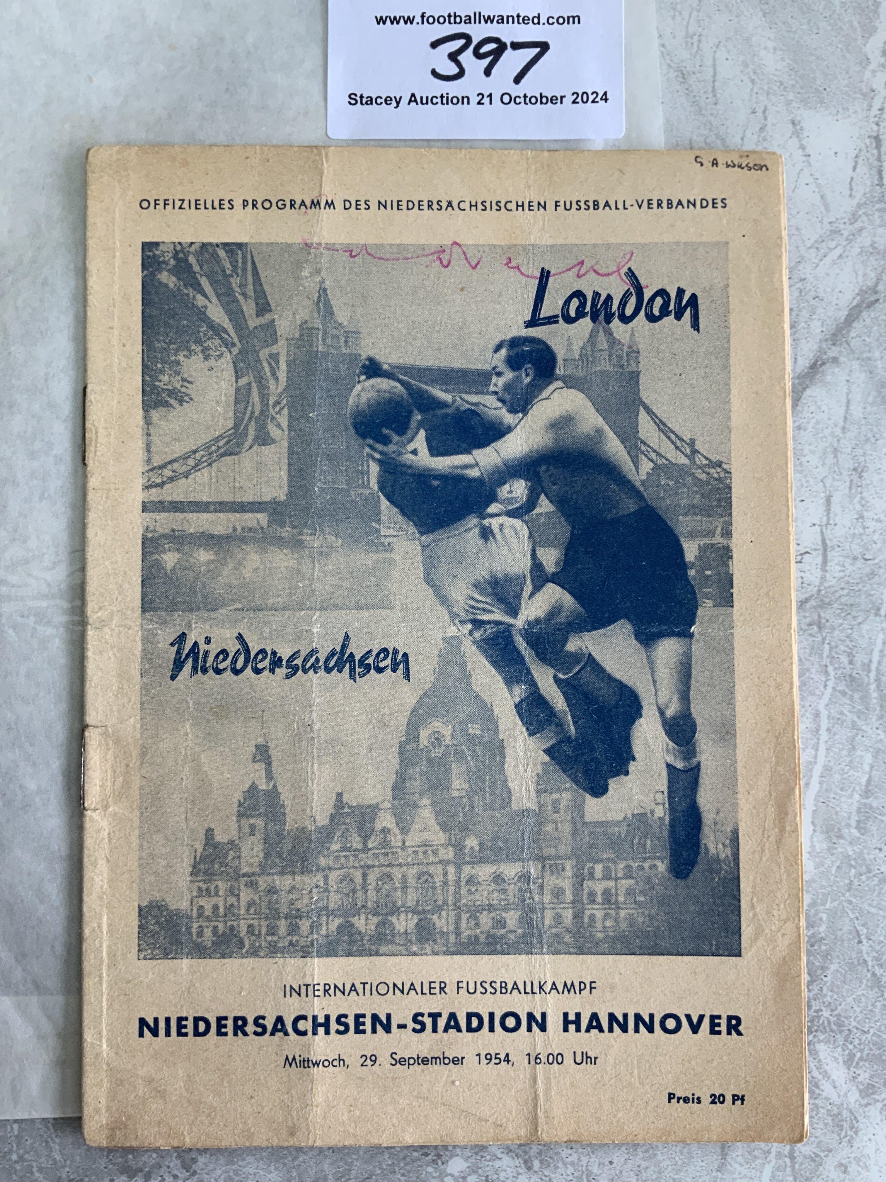 1954 N/W Germany v London Football Programme: Dated 29 9 1954 and billed as Niedersachsen v London in Hannover. Some great players representing London including players from West Ham Chelsea Charlton Tottenham and Arsenal. Autograph to cover but poor inside with tears and tape.