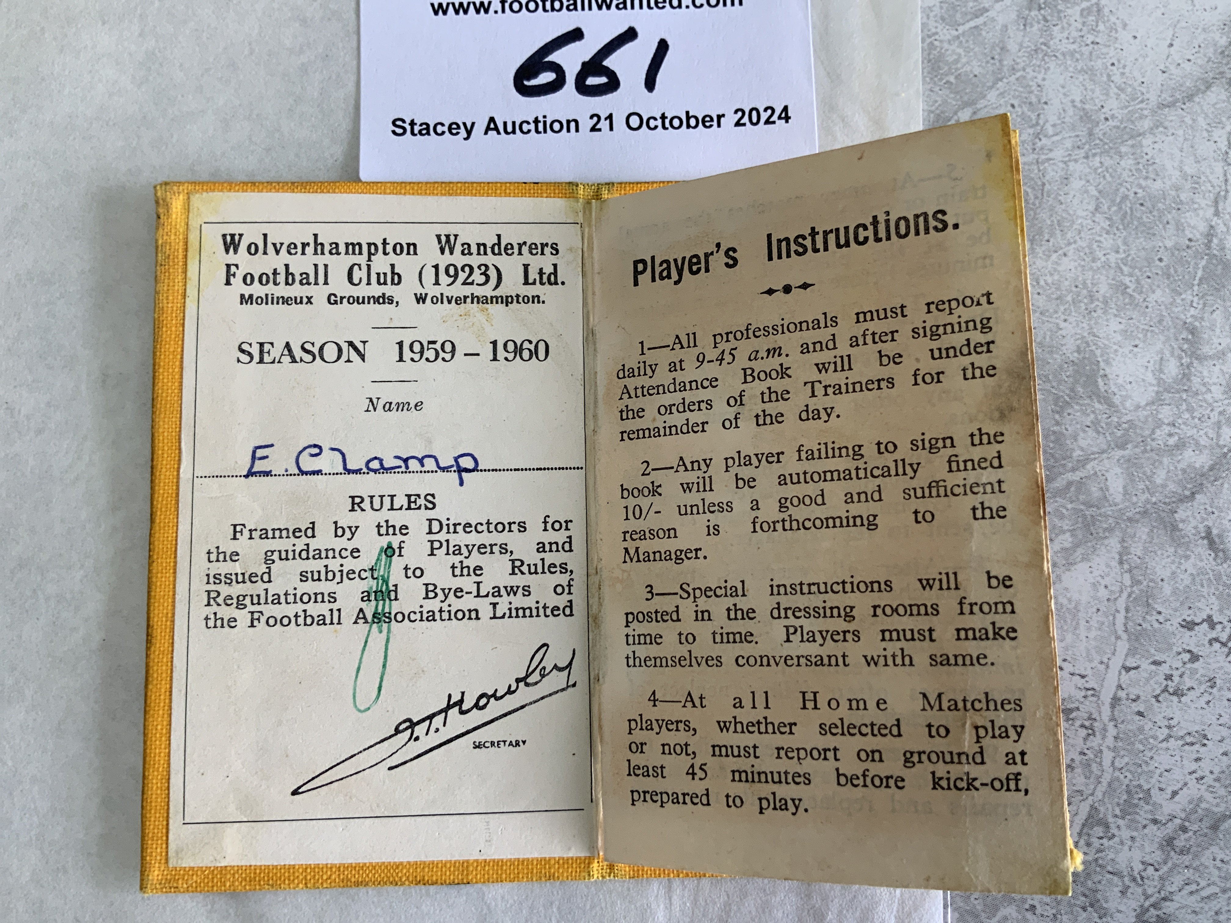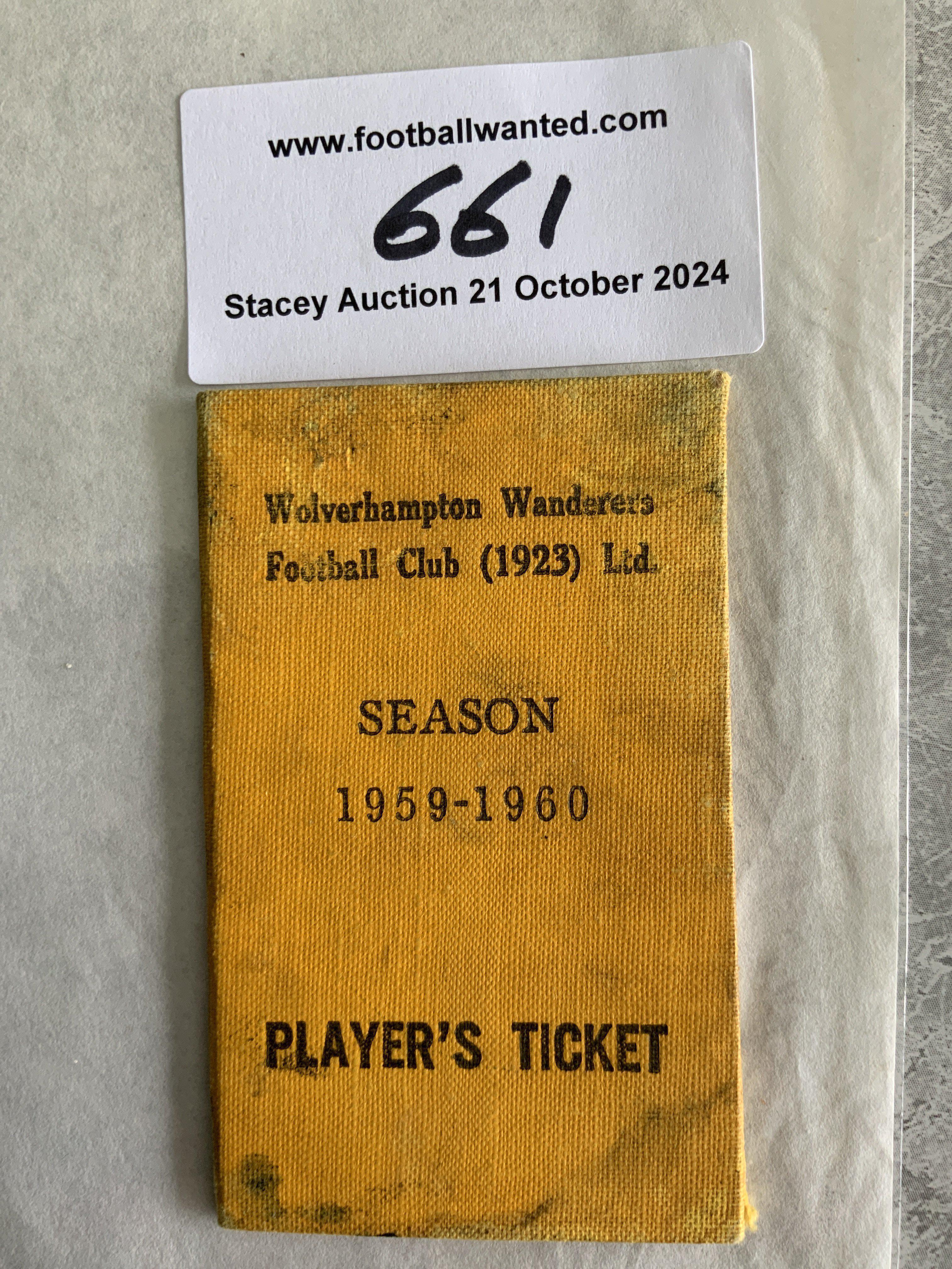 59/60 Wolves Football Players Ticket: From arguably the best ever Wolves team that won the FA Cup and Charity Shield but also came 2nd in Division One and went deep into the European Cup. Small gold hardback players pass has players rules inside. Former property of Eddie Clamp with dirty handling marks.