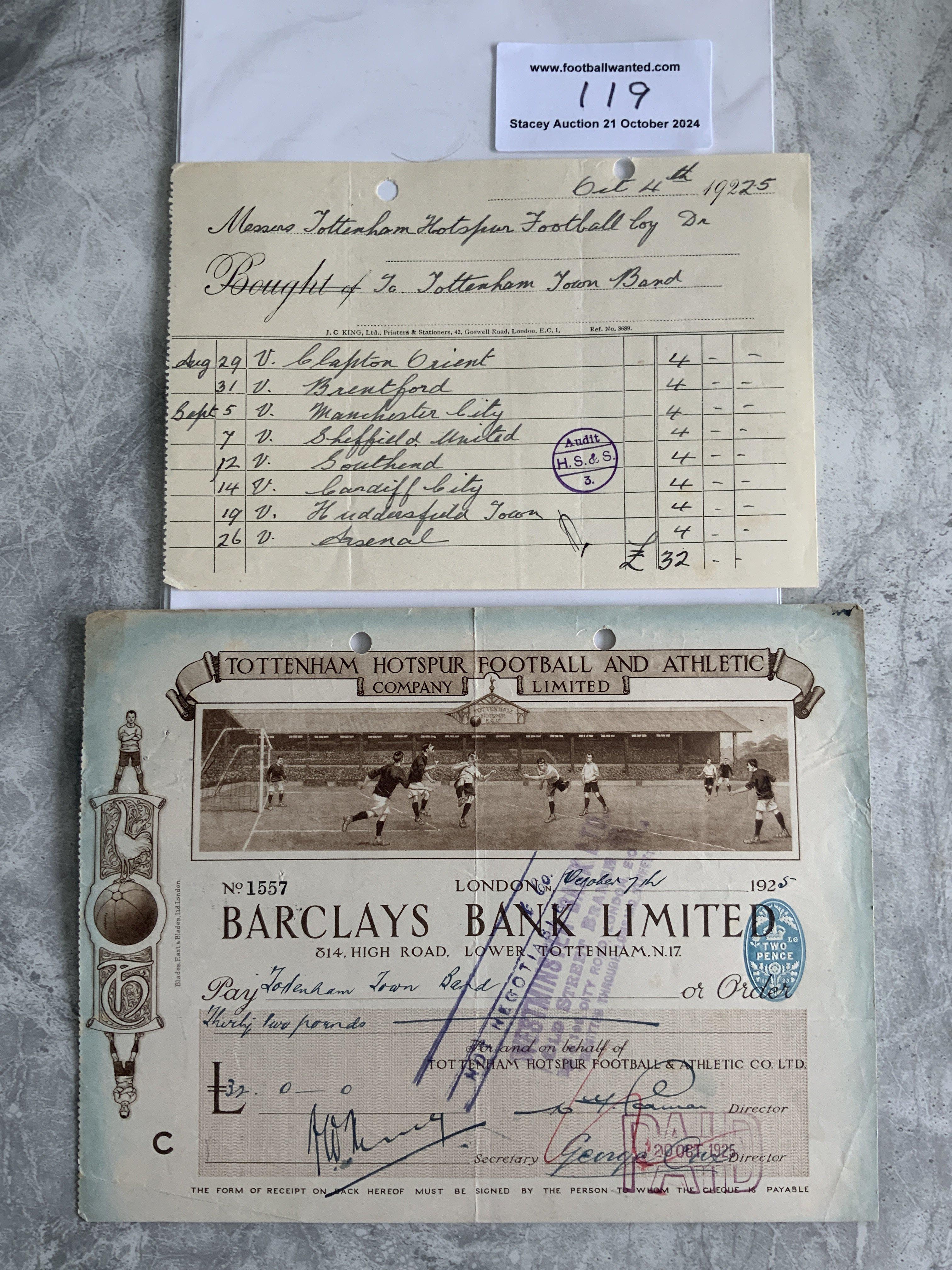 1925 Tottenham Decorative Cheque: Stunning 99 year old cheque issued by Tottenham to the Tottenham Town Band. Receipt lists all the games they played at White hard Lane in August and September for which the band was paid 4 pounds each time. Cheque for 32 pounds has match action printed to top. Excellent. (2)