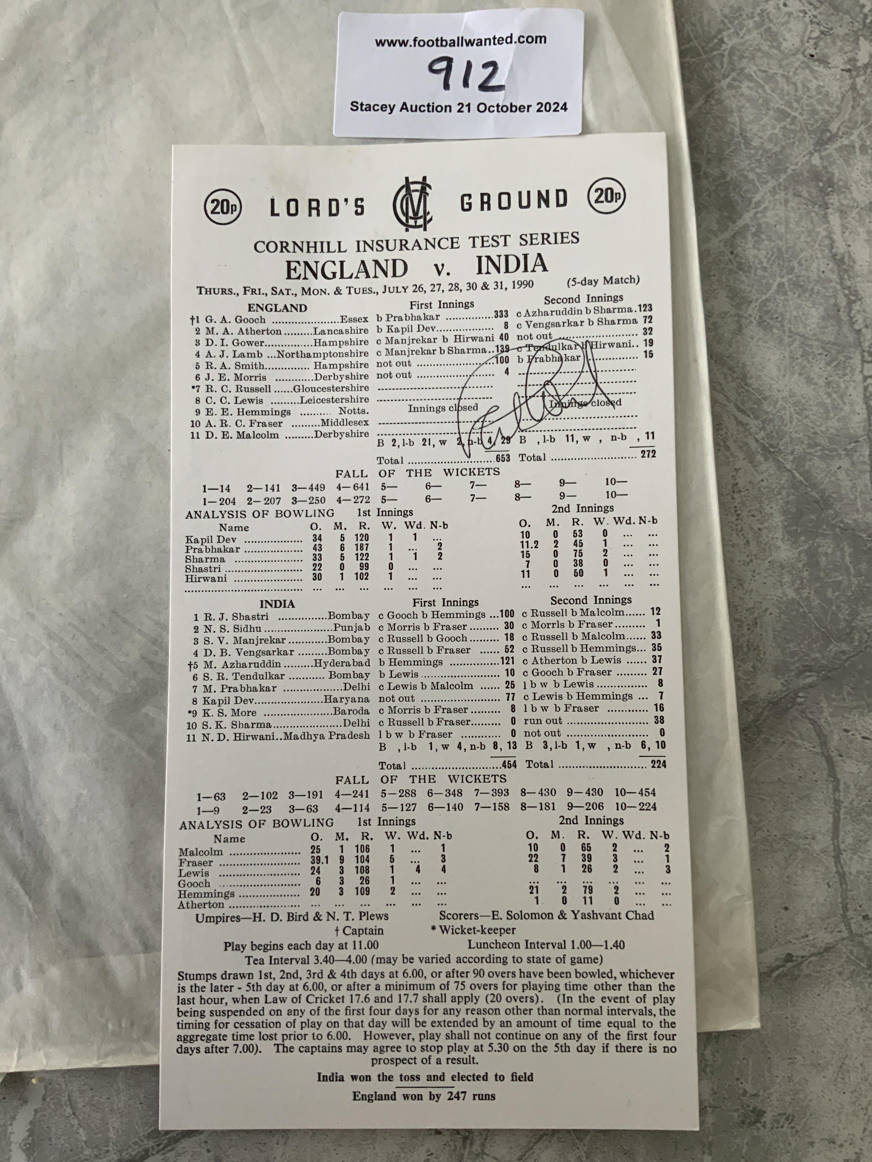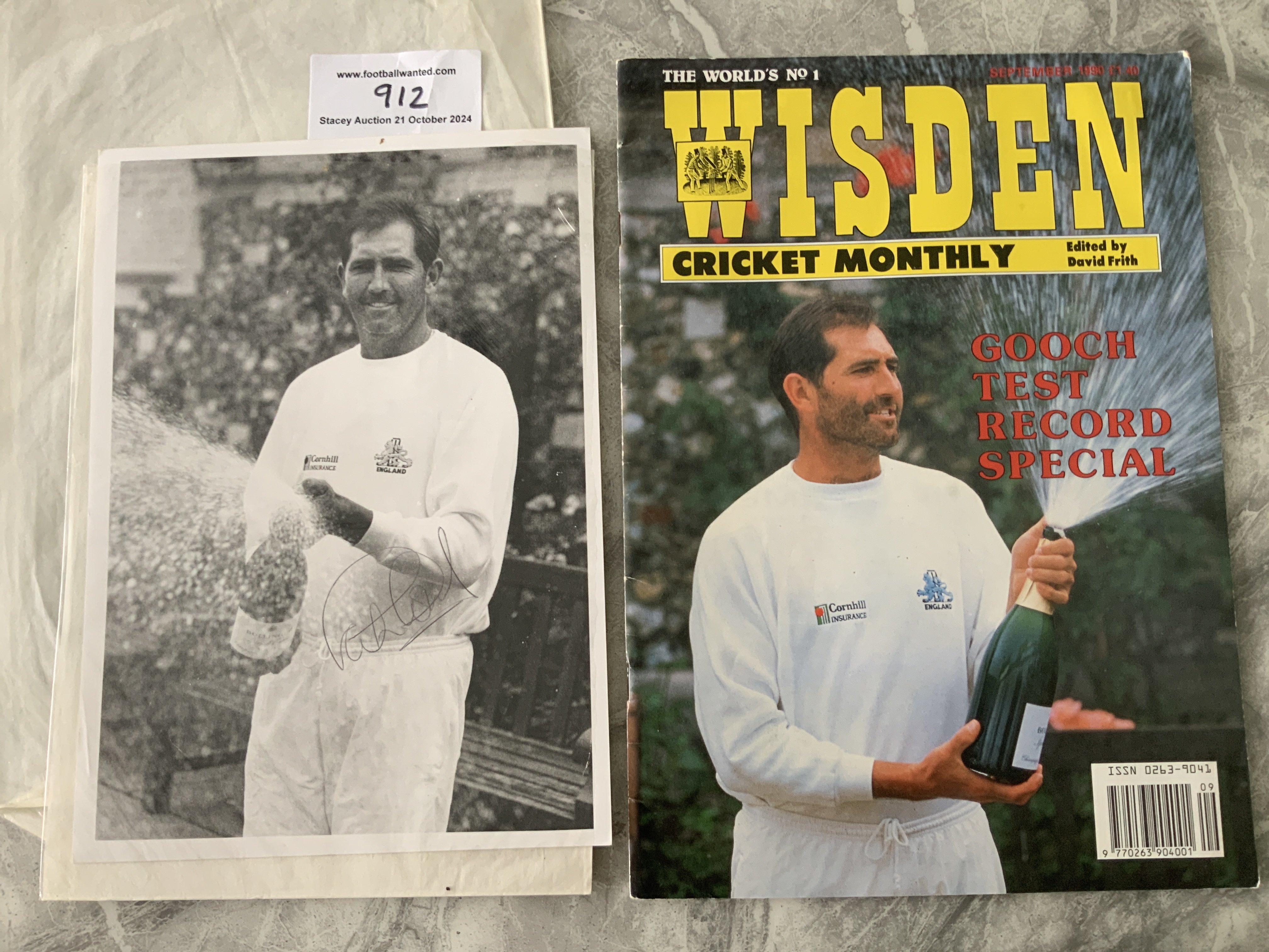 Graham Gooch 333 England Cricket Memorabilia: Scorecard for the famous match v India in 1990 which has been signed by Gooch. C/W a signed press photo of him opening champagne wearing England kit and a similar picture of him on the front cover of Wisden Monthly. (3)