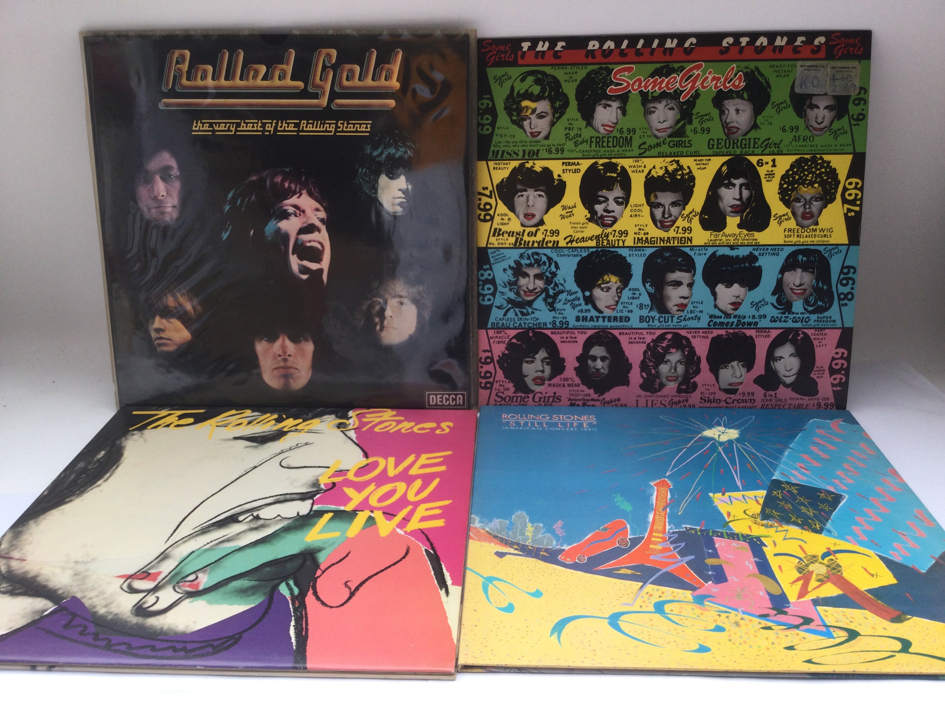 Four Rolling Stones LPs comprising 'Some Girls', 'Love You Live', 'Still Life' and 'Rolled Gold'.