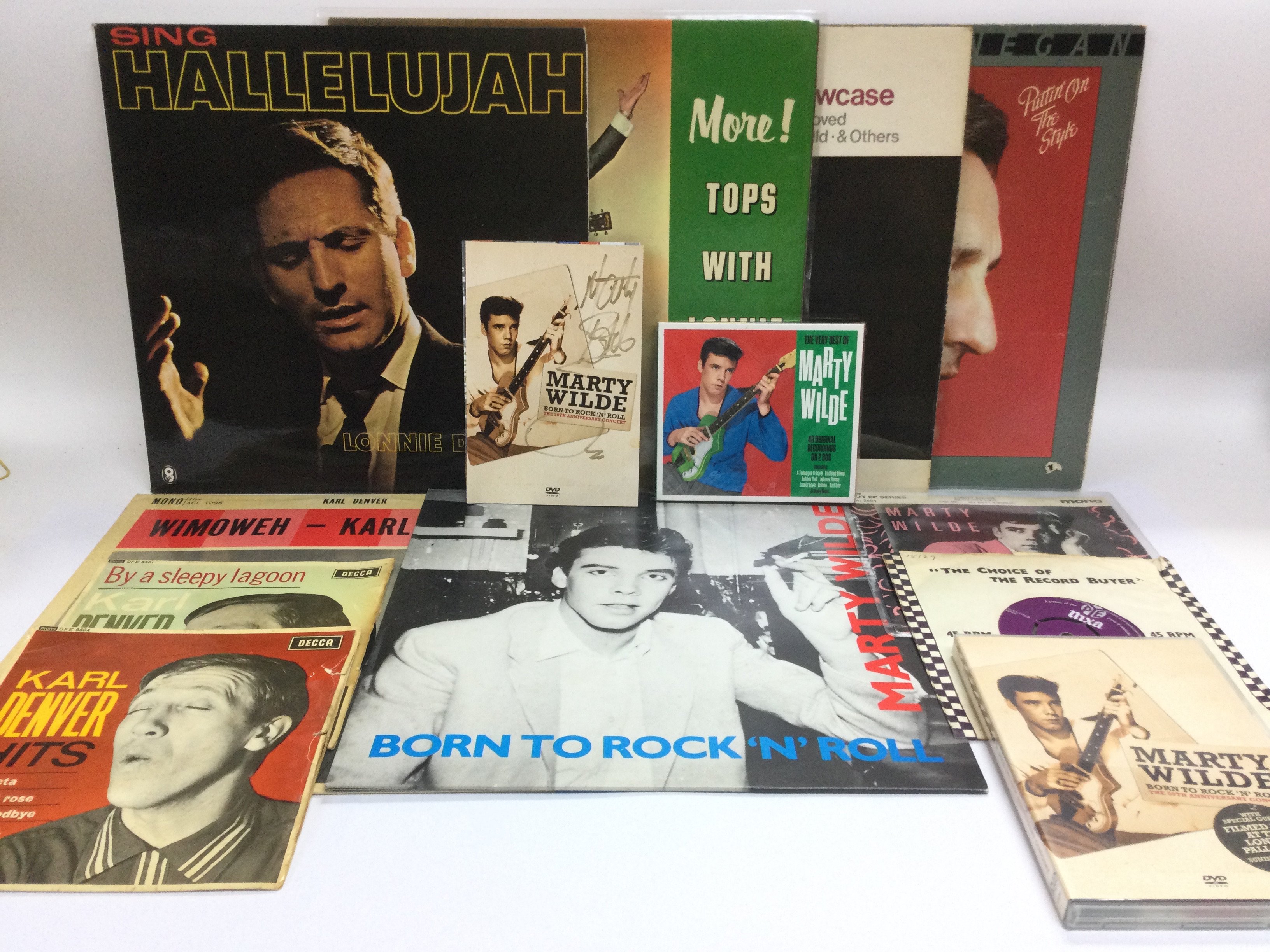 A collection of LPs, CDs and DVDs relating to Marty Wilde, Karl Denver and Lonnie Donegan. Includes a signed Marty Wilde DVD.