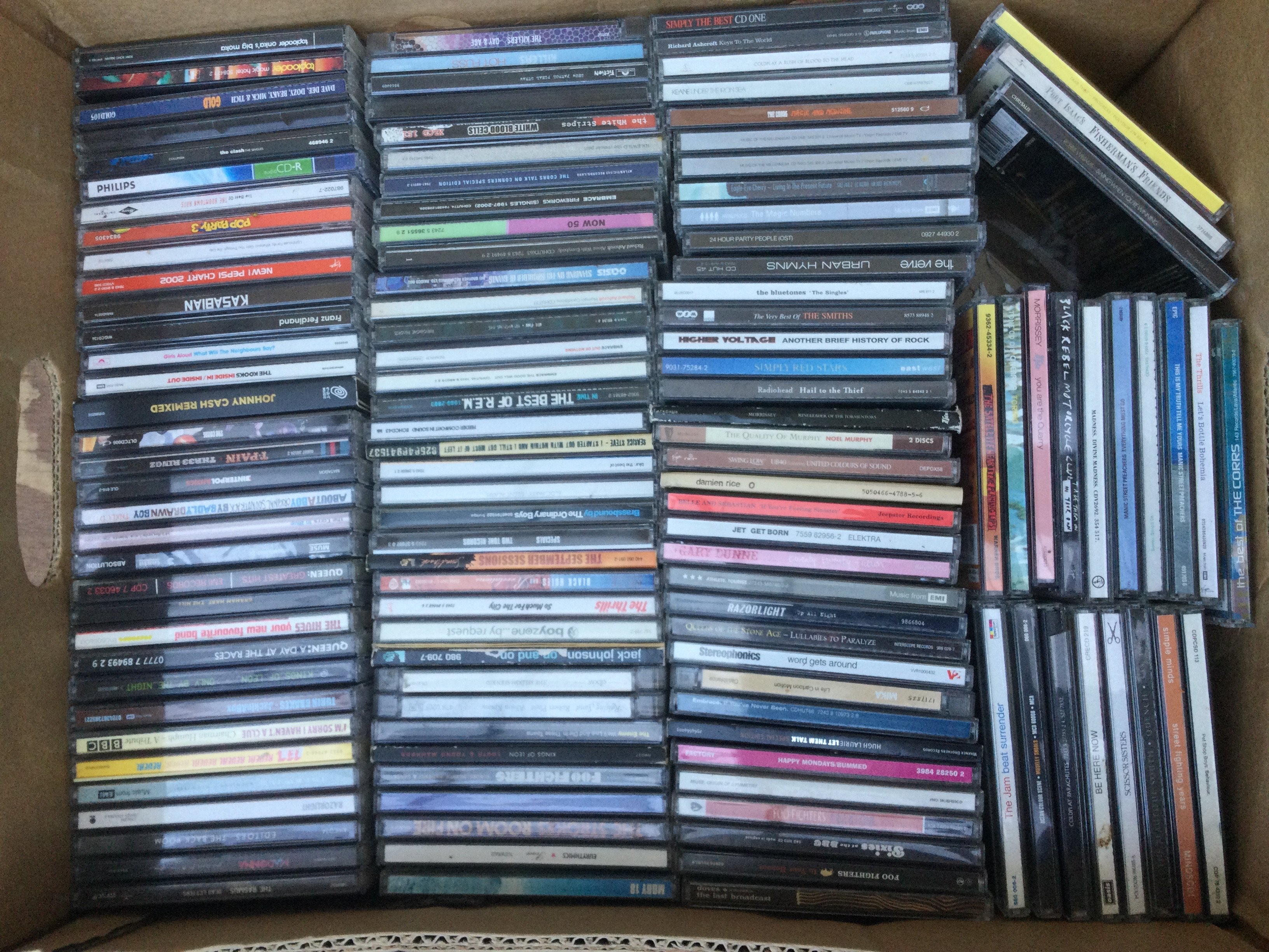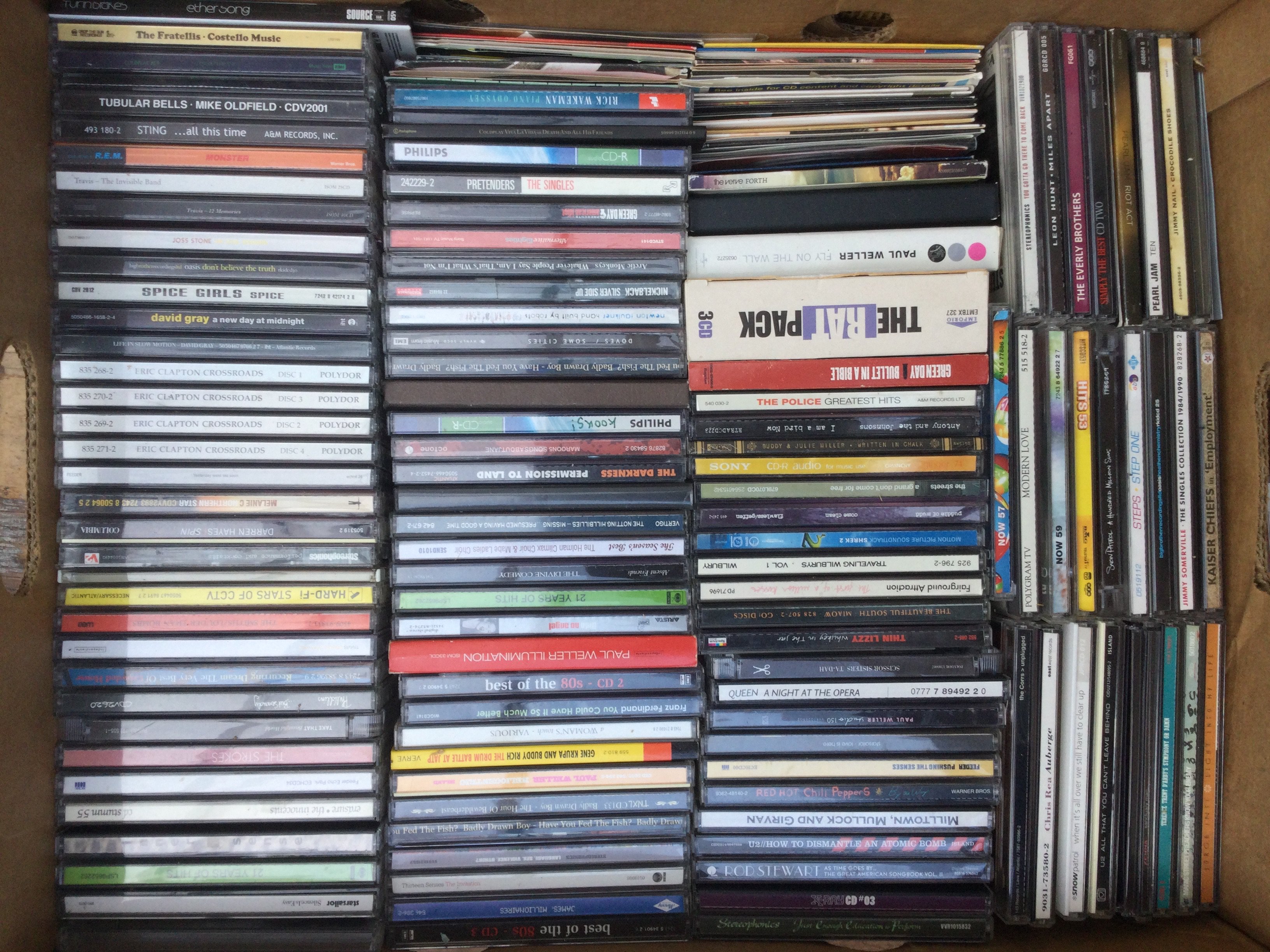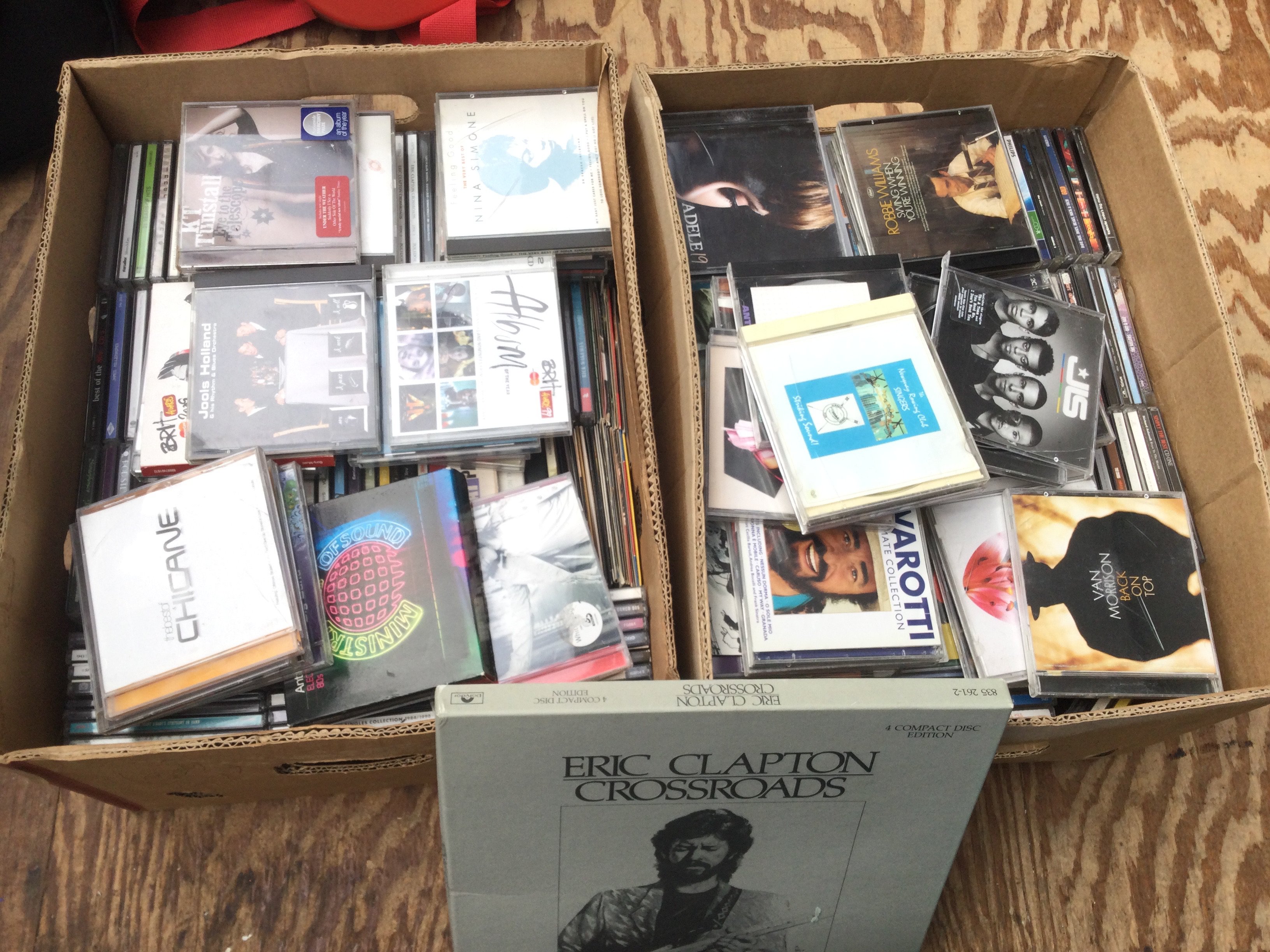 Two boxes of CDs by various artists including an Eric Clapton 'Crossroads' 4CD set, Adele, Pearl Jam, Green Day, Paul Weller and many more.