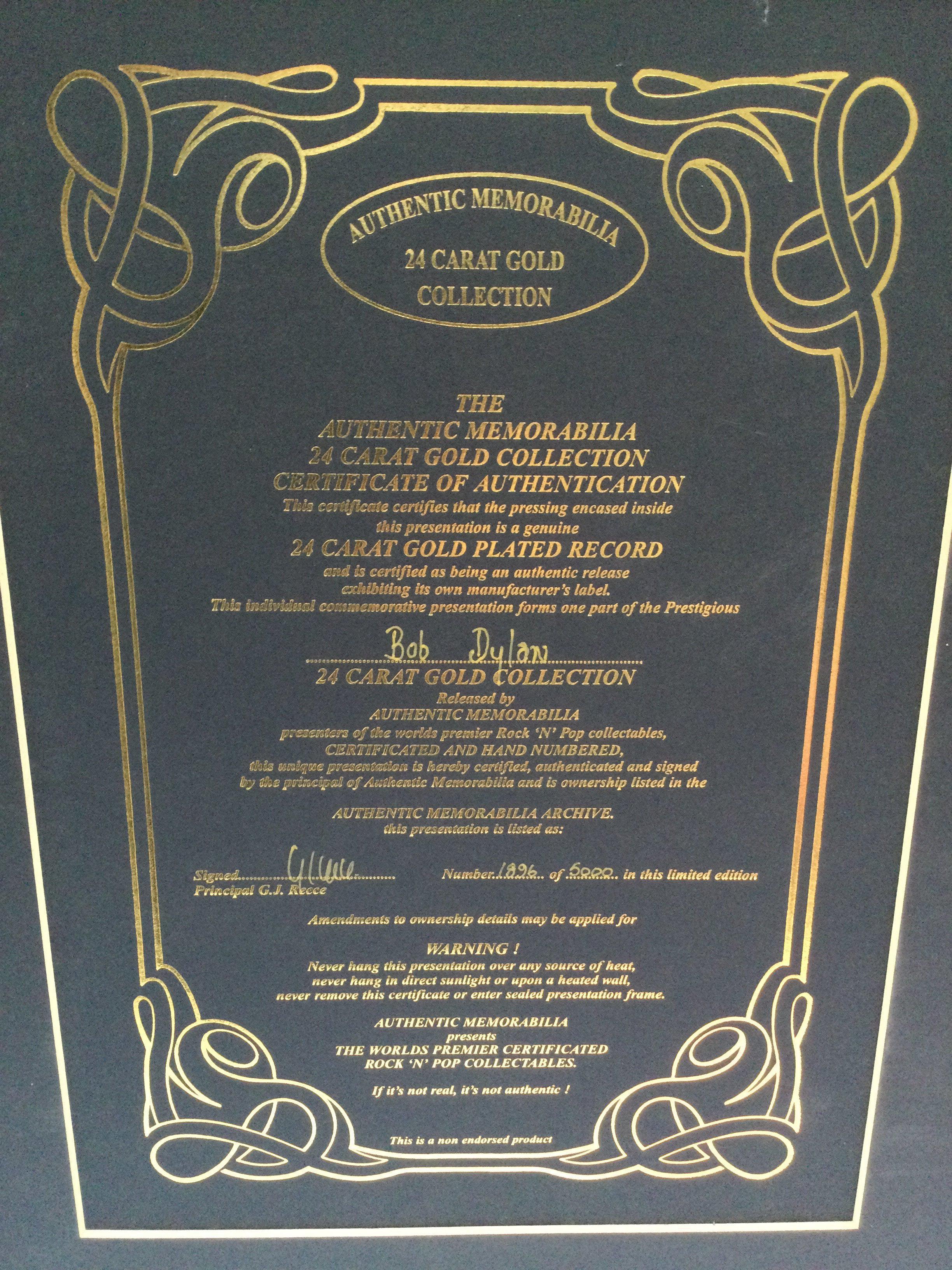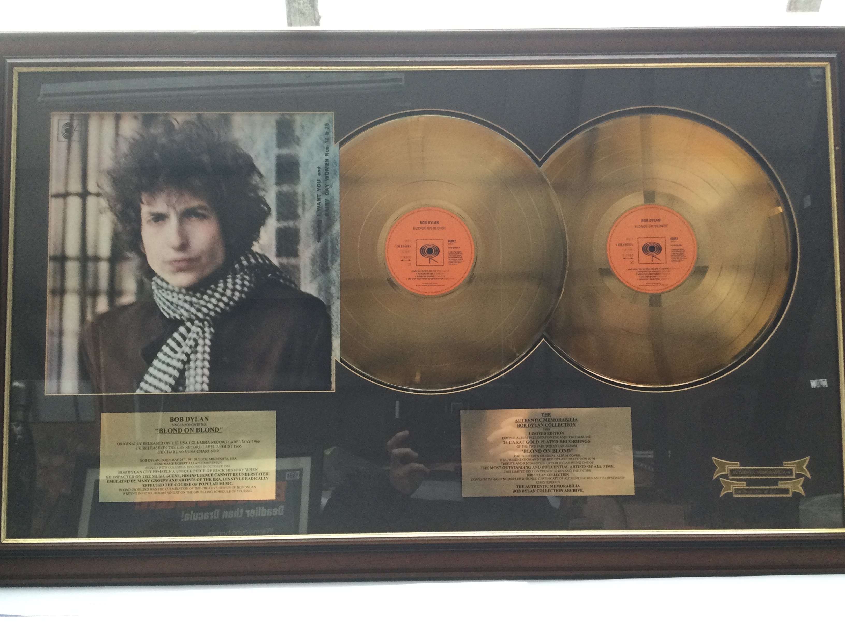 A framed and glazed limited edition double gold disc display for the Bob Dylan LP 'Blonde On Blonde'. Comes with hand numbered and signed COA. Approx 98cm x 60cm.