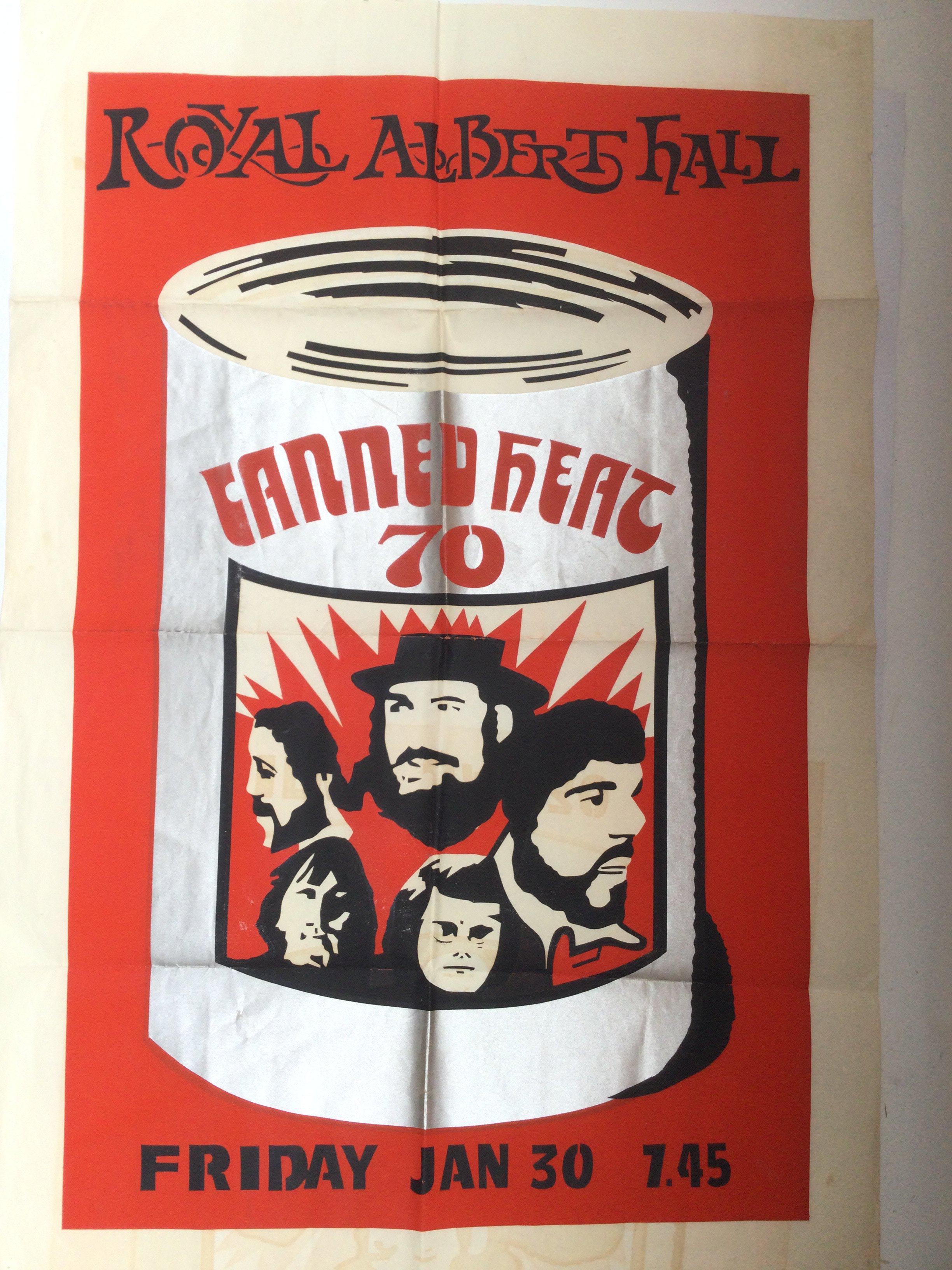 An original 1970 concert poster for Canned Heat purchased by the vendor at their Royal Albert Hall performance on Friday, 30th January 1970. Approx 76cm x 51cm. Folded with pin holes.