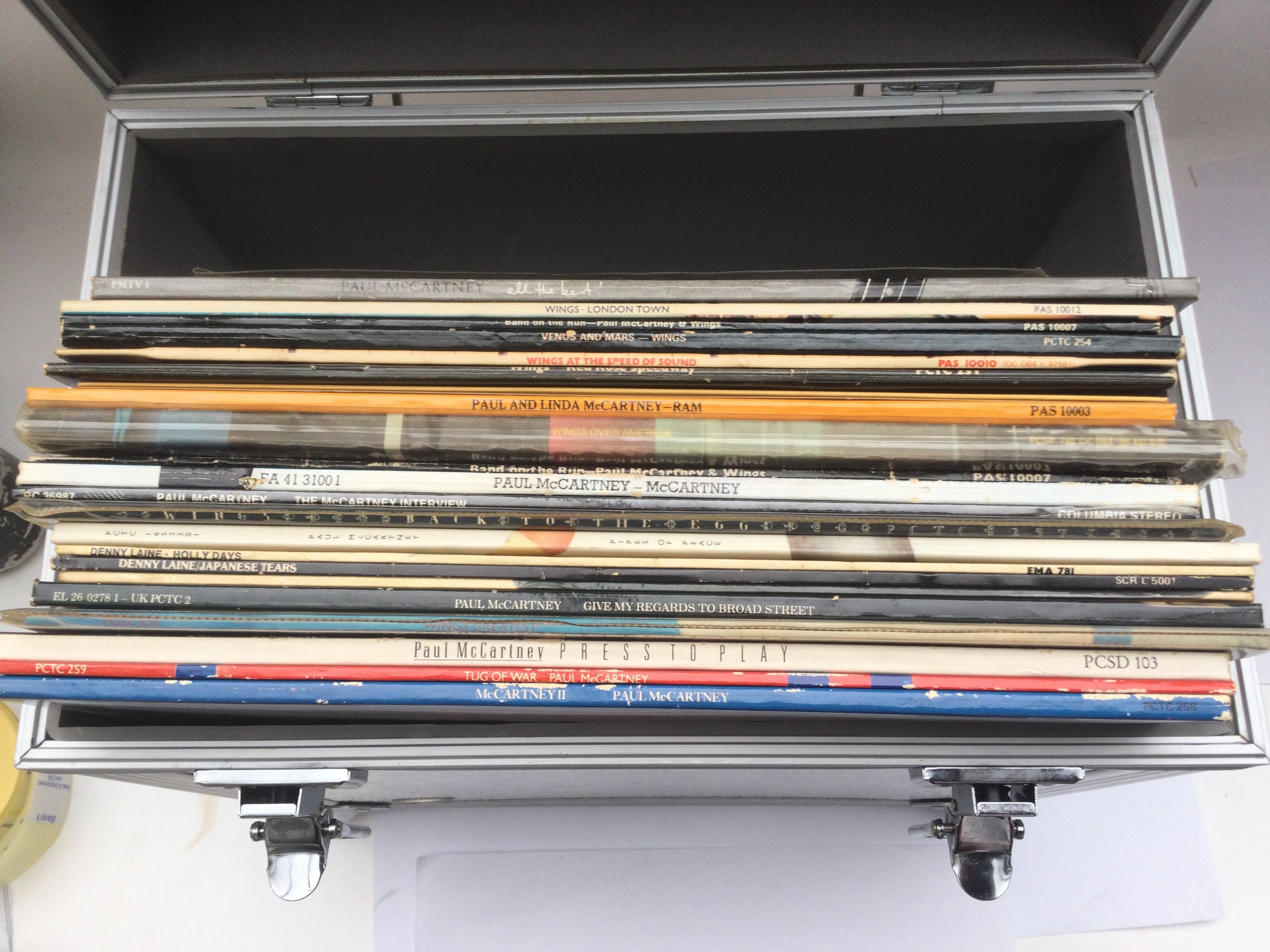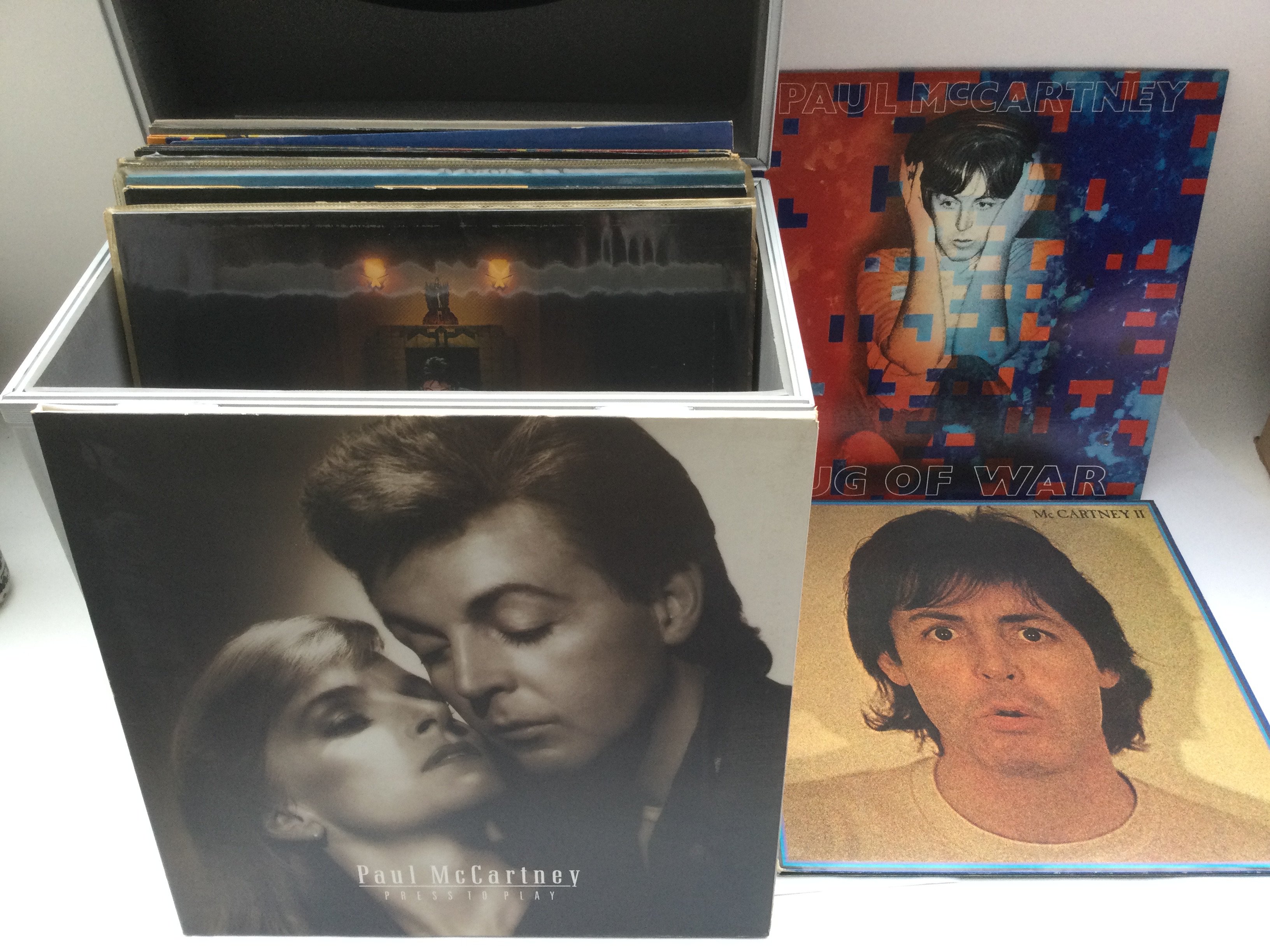 A record case of Paul McCartney, Wings and related LPs including 'Press To Play', 'Ram', 'McCartney' and others.