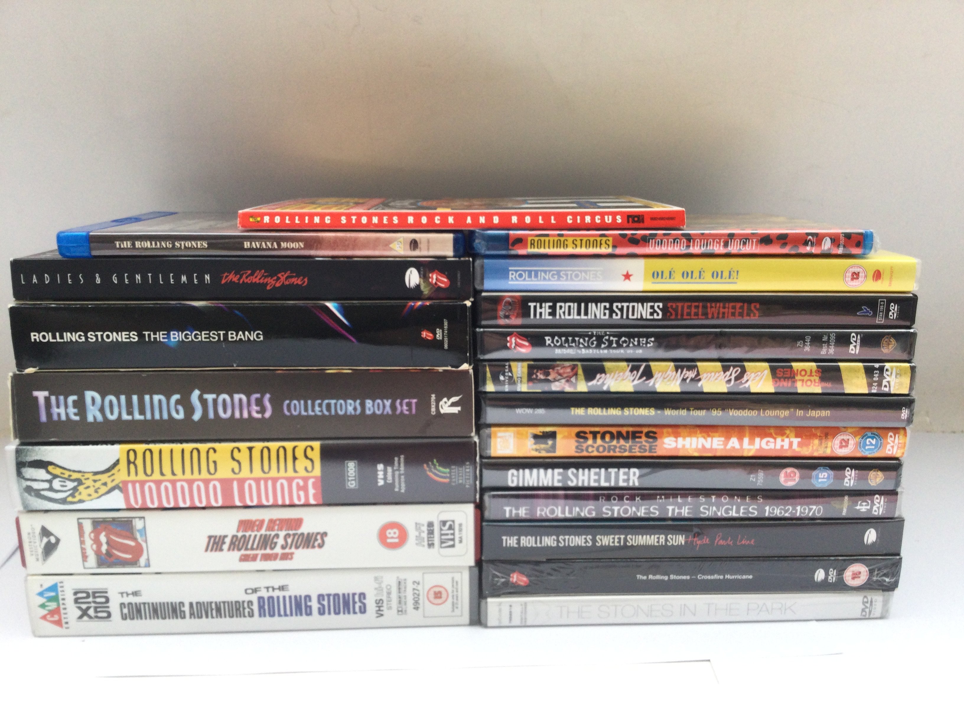 A collection of Rolling Stones DVDs, BluRays and VHS tapes.