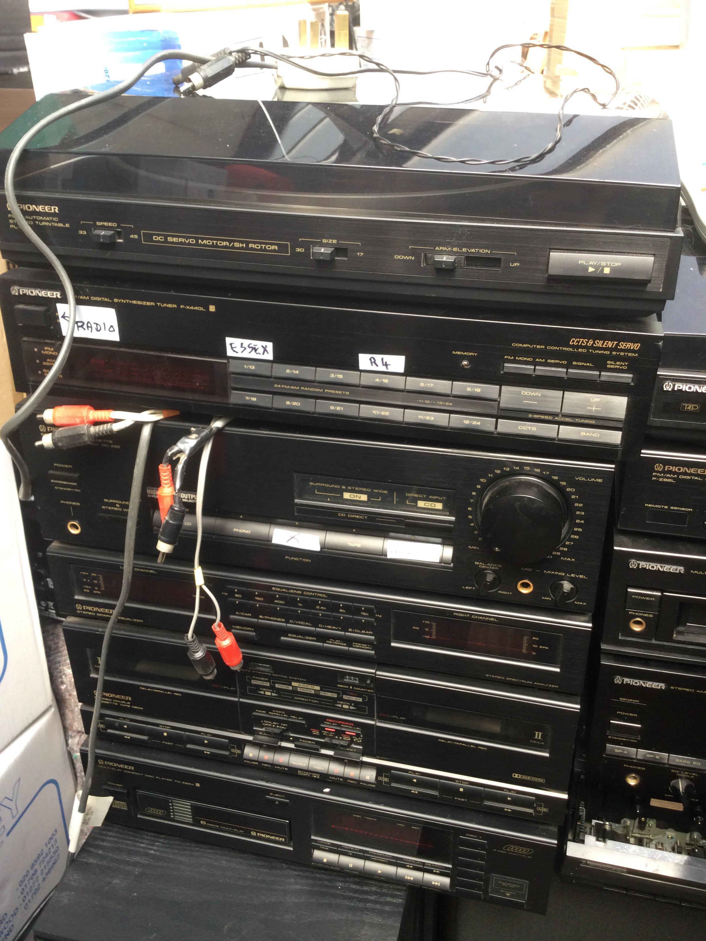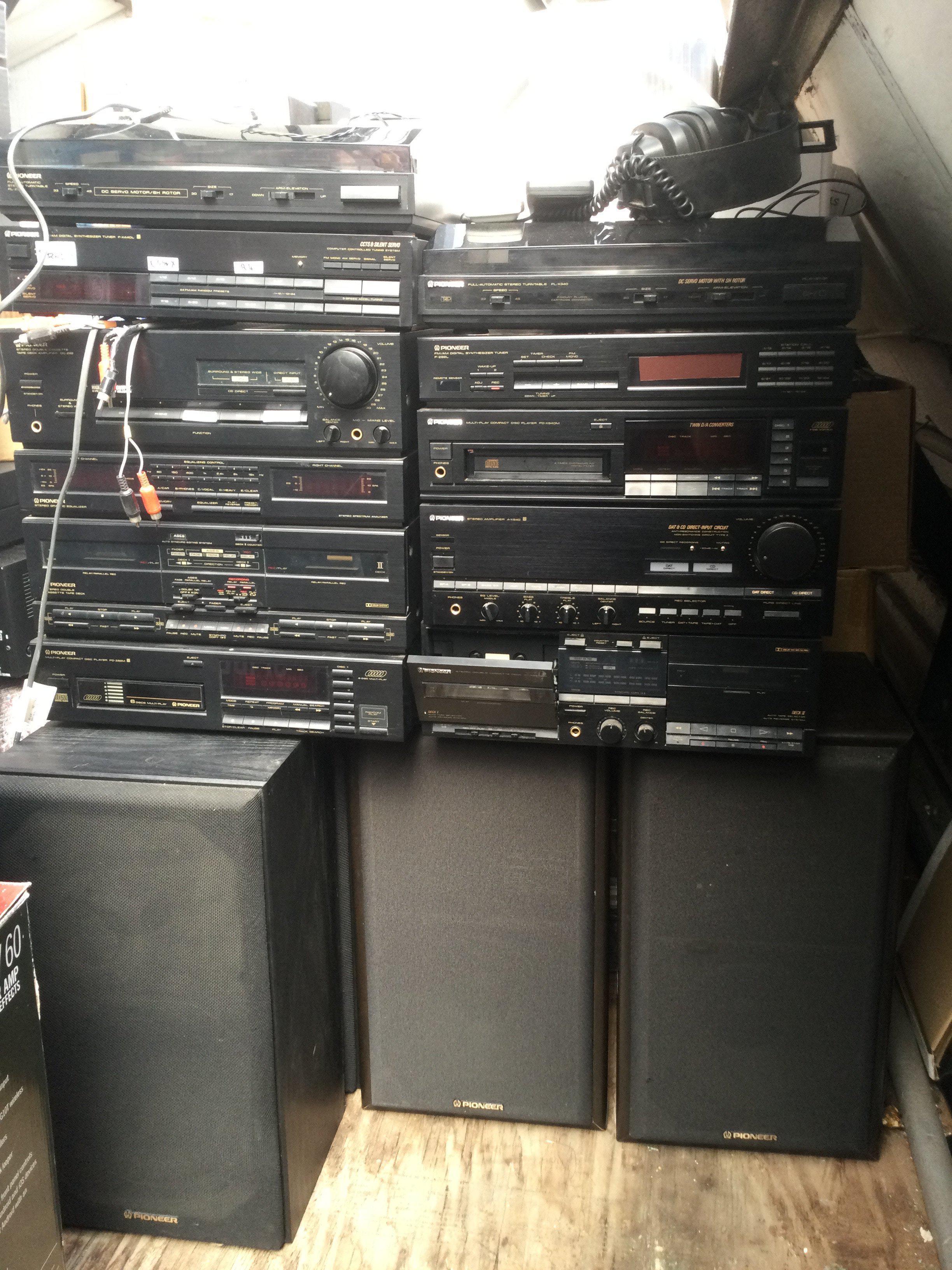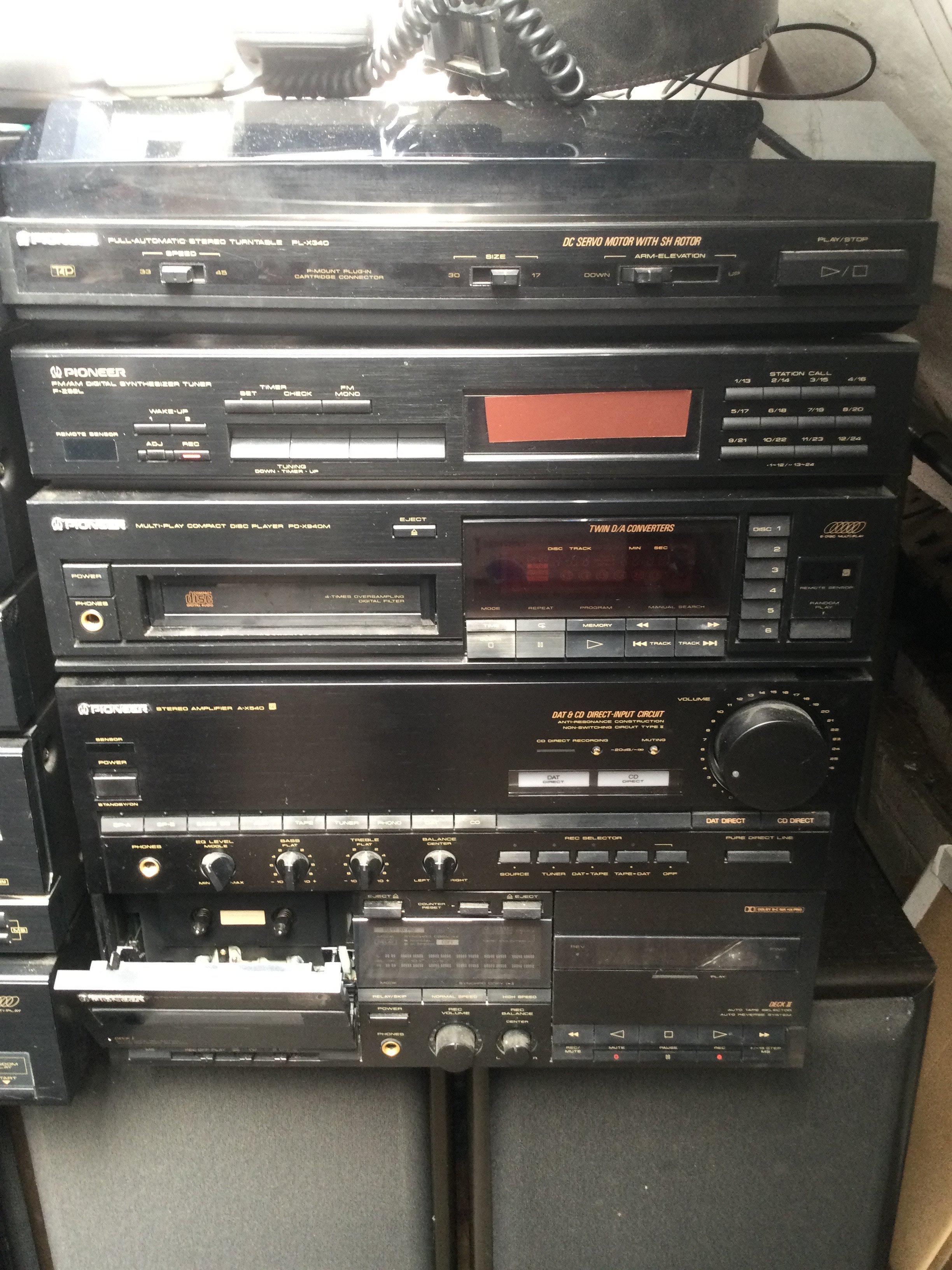 Two Pioneer stacking hi fi units plus two pairs of Pioneer speakers including some manuals, remote controls and a pair of headphones..