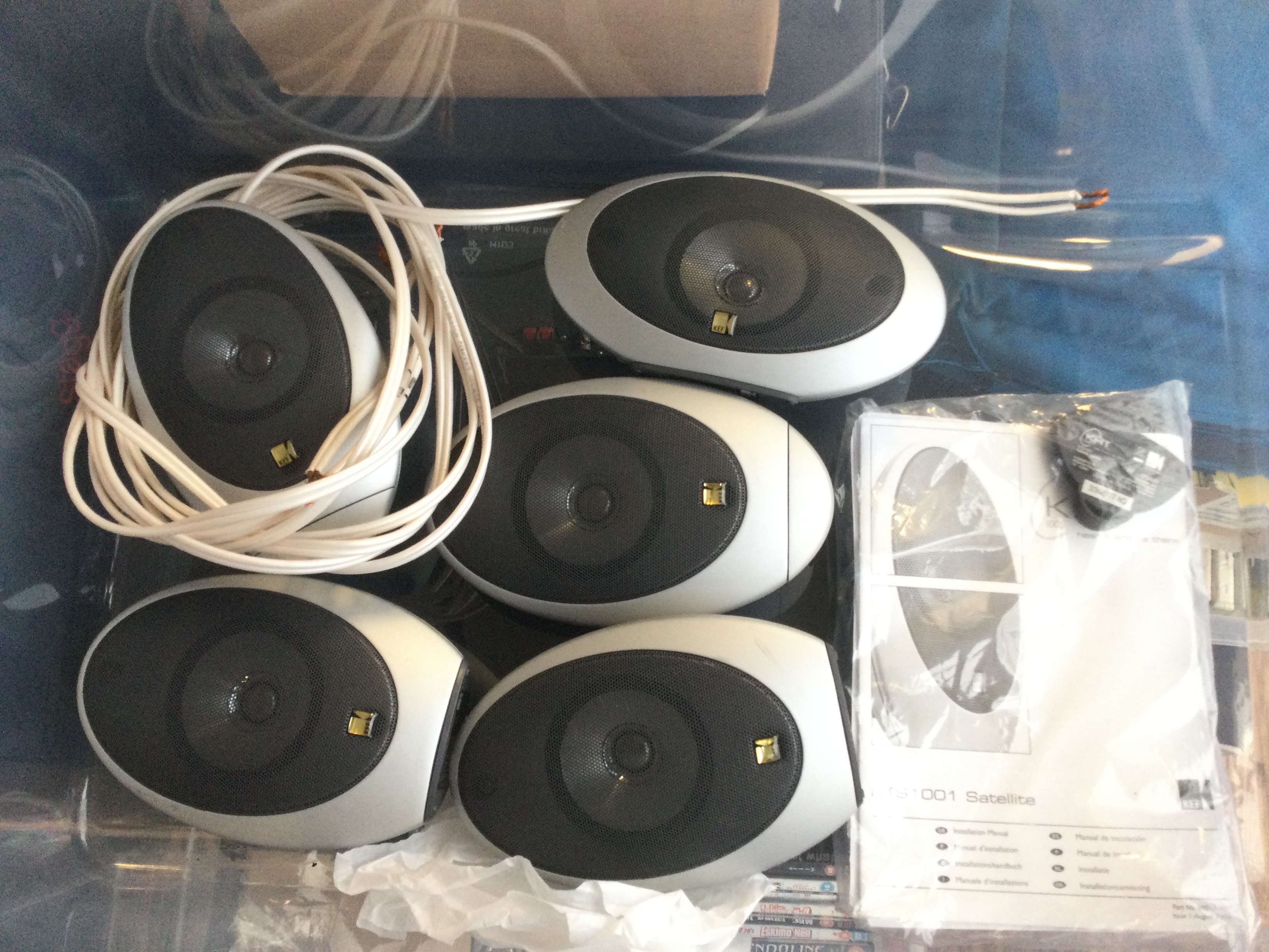 A set of KEF cinema surround speakers (missing subwoofer).