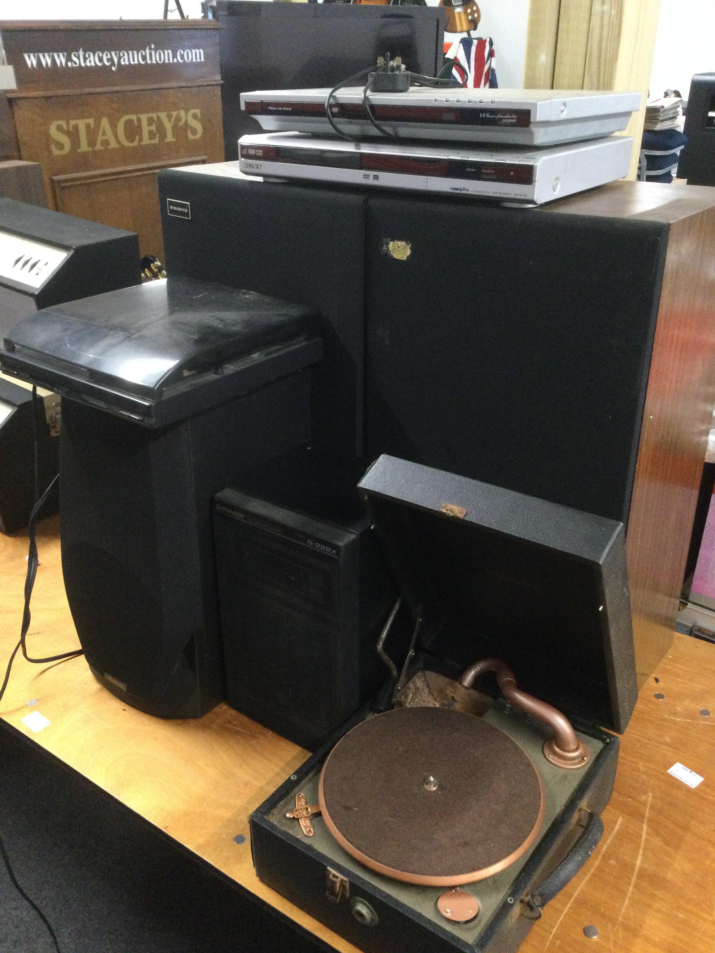 A collection of audio visual equipment comprising a pair of floorstanding Sanyo speakers, a Kenwood record player, a Brunswick gramophone, two DVD players etc.