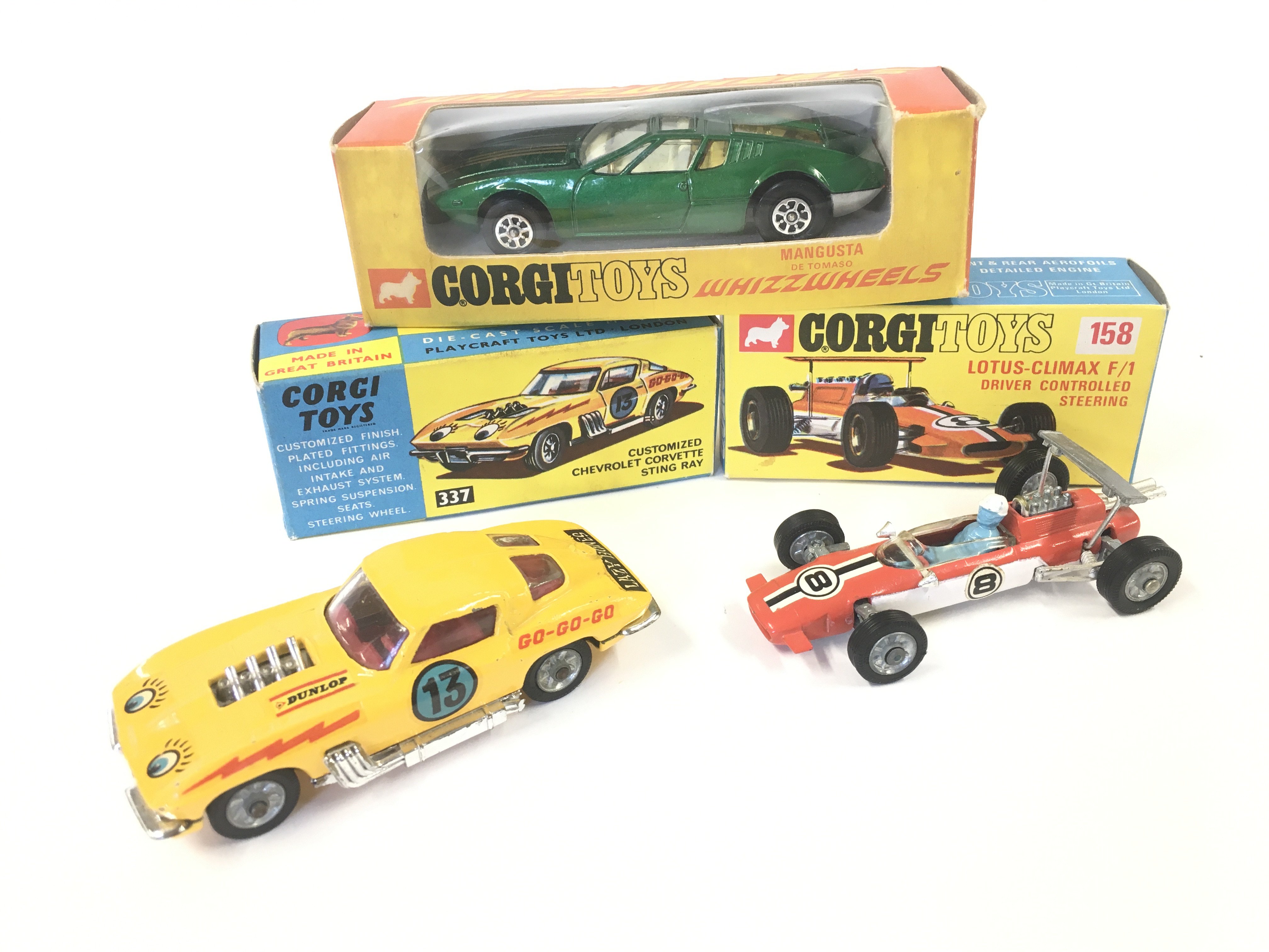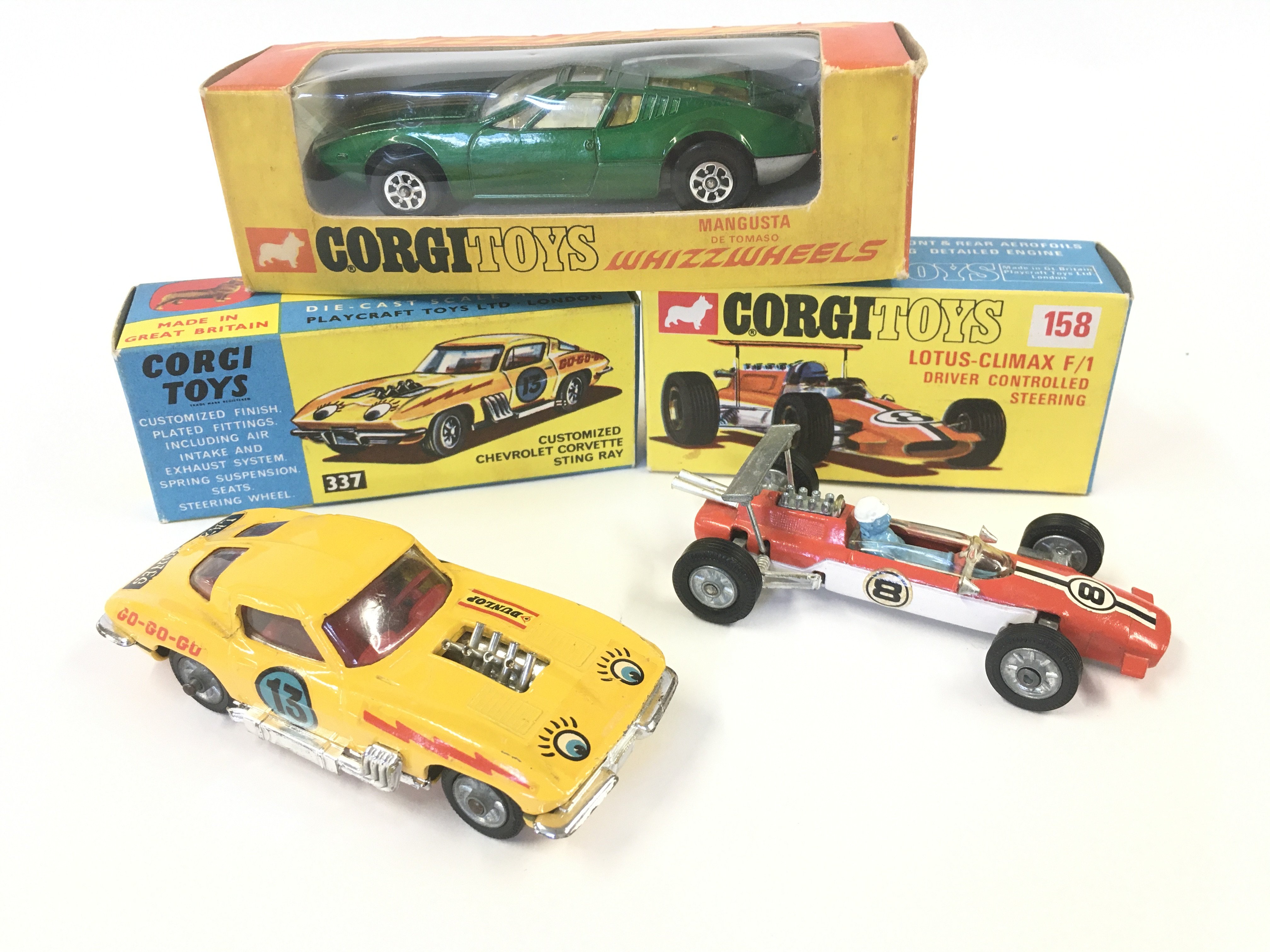 3 X Boxed Corgi Diecast Vehicles. A Customised Chevrolet Corvette Sting Ray #337. A Lotus-Climax F/1 #158 and a Whizzwheels Mangusta #203.