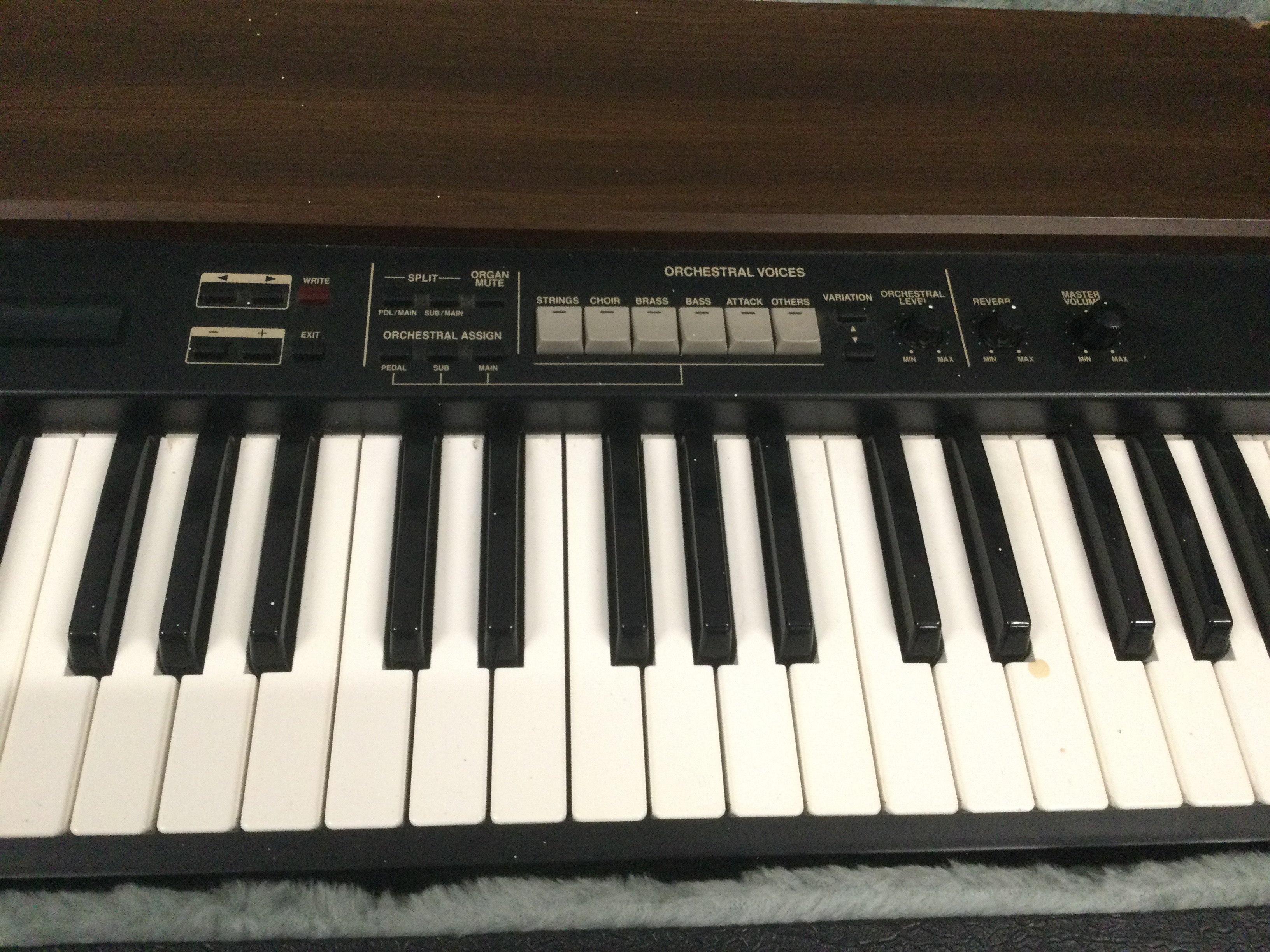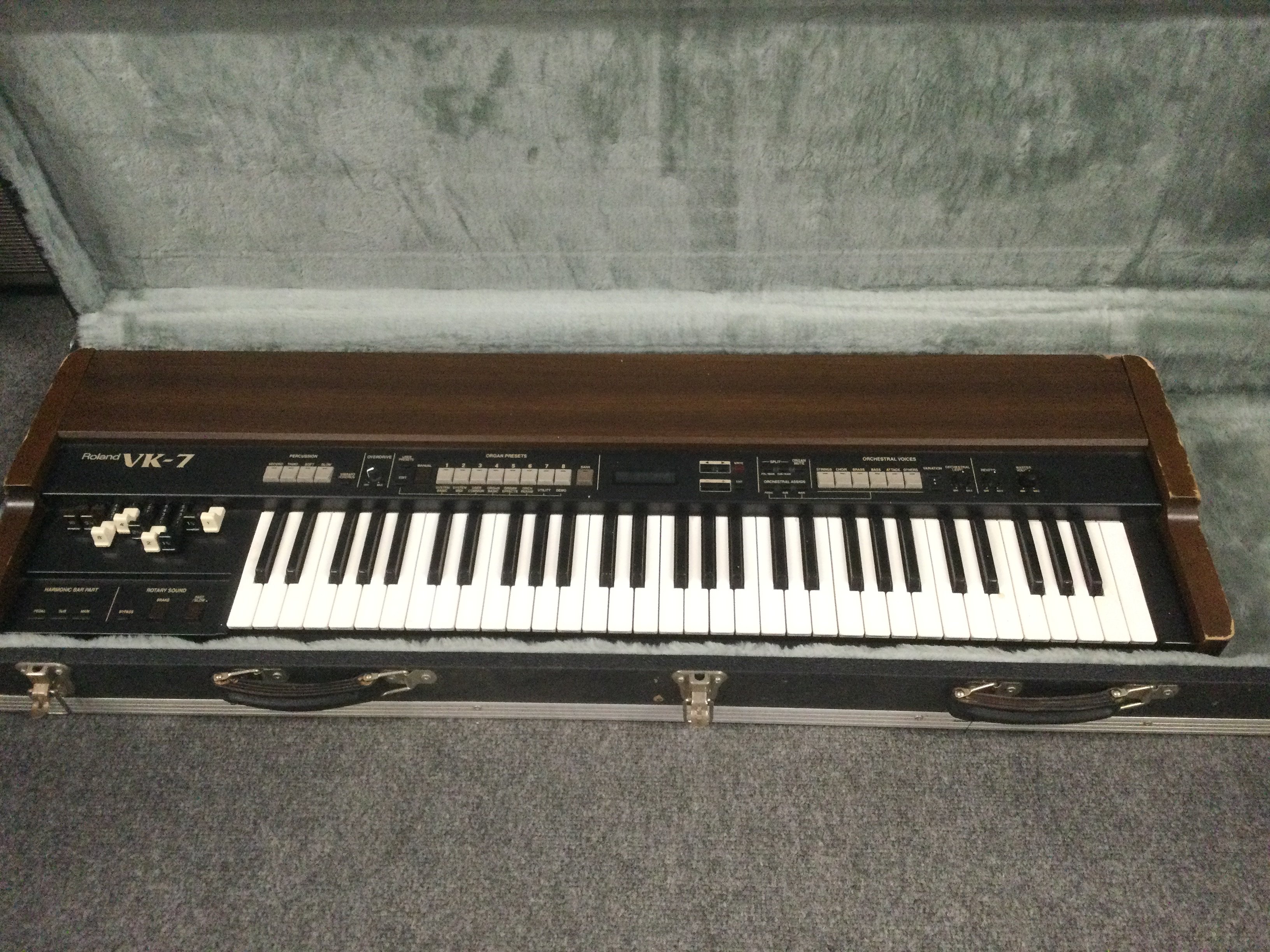 A 1998 Roland VK-7 tonewheel organ with a hard carry case (not original).