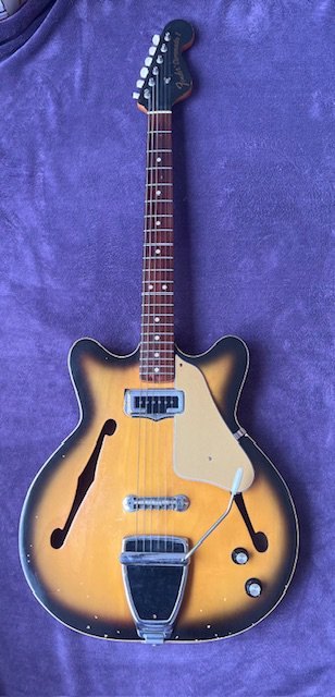 A 1966 Fender Coronado I semi solid electric guitar with original parts plus added 1960's Stratocaster Tremolo Arm and modified tailpiece. Overall in very good condition with light play wear consistent with age and use. Light marking and paint chips to the back otherwise very good overall. Light fret wear. No case.