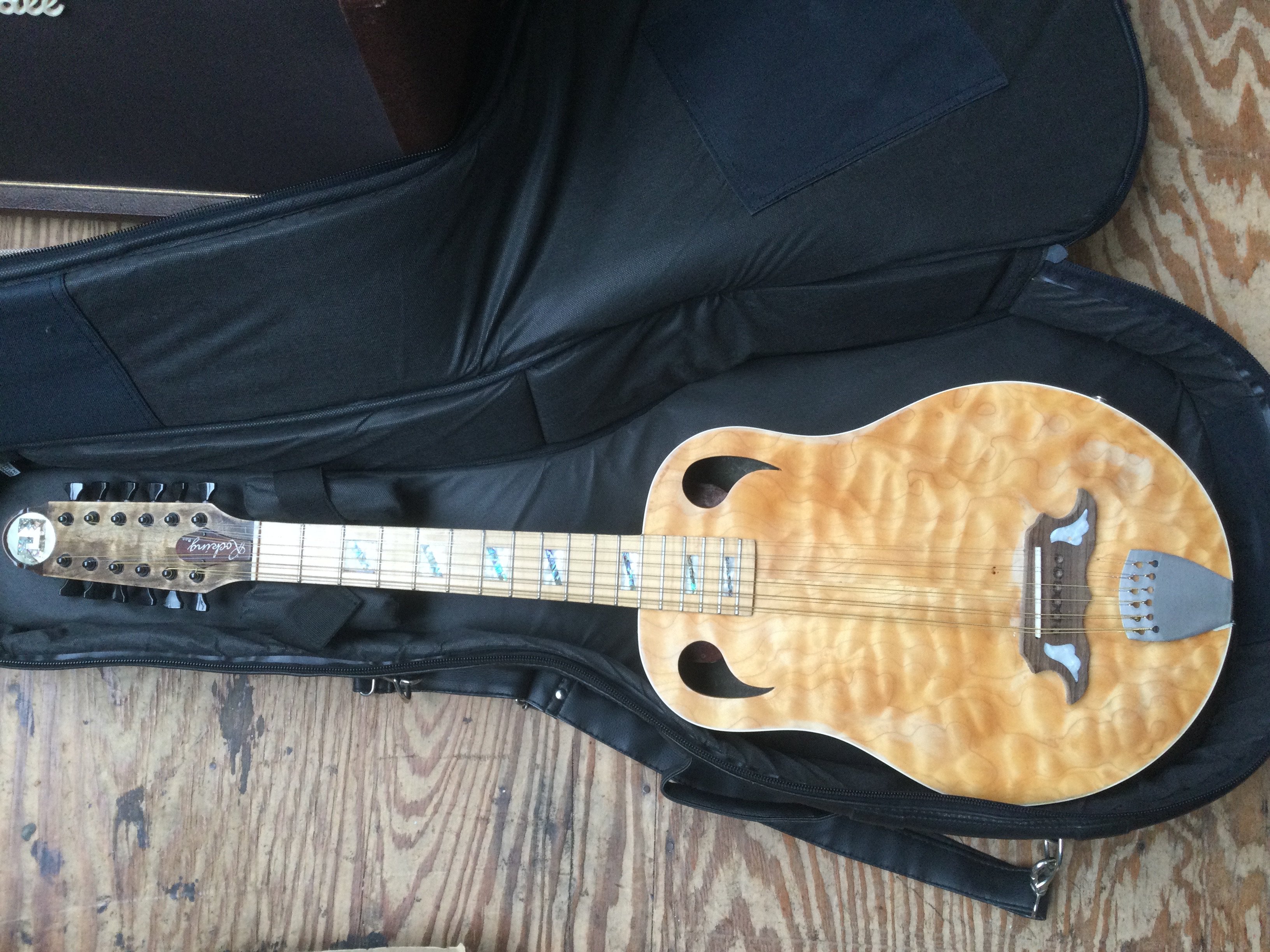 A hand built 12 string acoustic guitar with a maple top, back and sides. Comes supplied with a soft padded carry case.