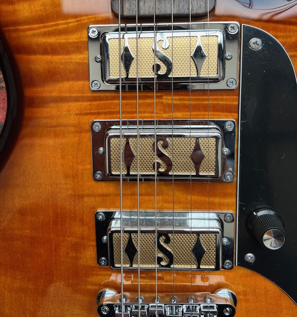 This is a Supro Hampton Flamed Maple Electric Guitar from 2017 in very good condition - largely unplayed with the factory plastic on the pickguard, the very light marking in the cutaways suggests very light playwear. Comes with Supro Branded GigBag