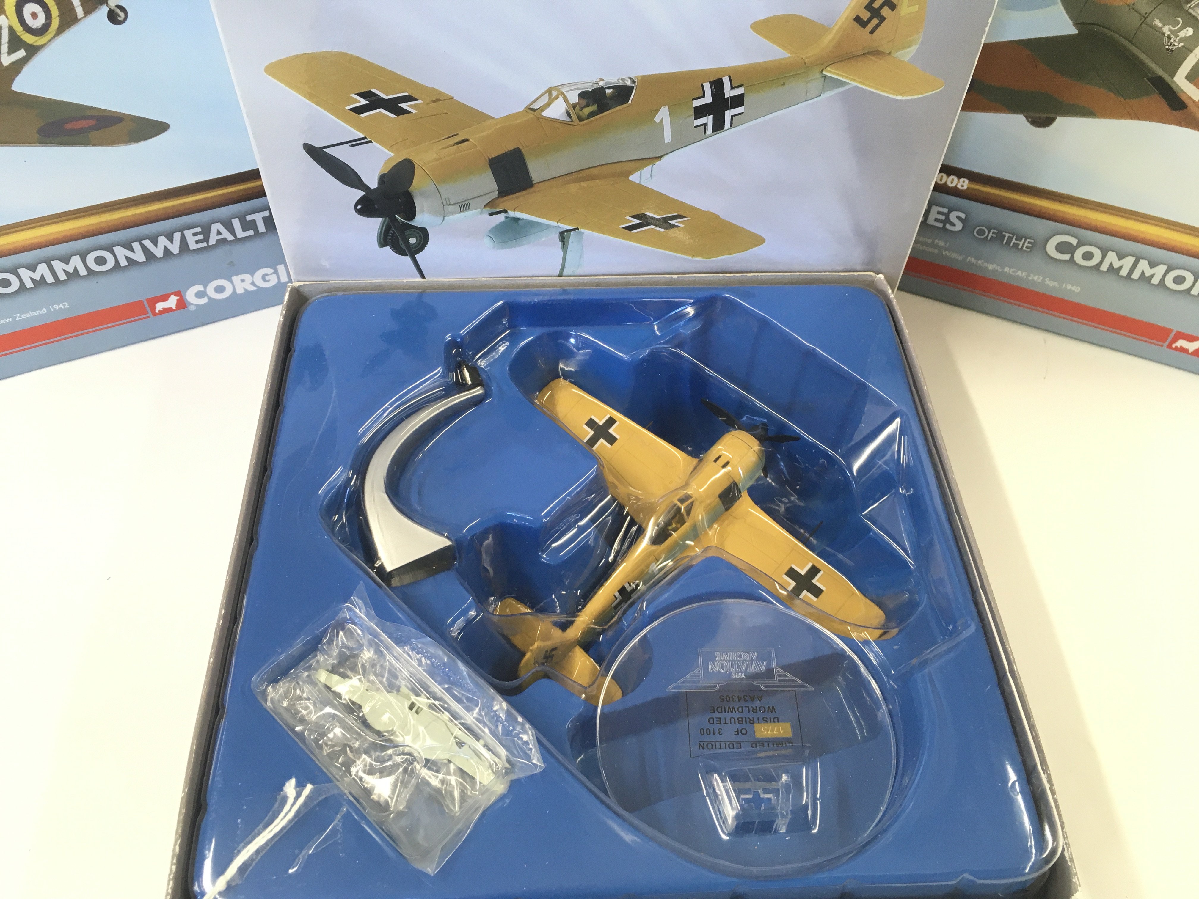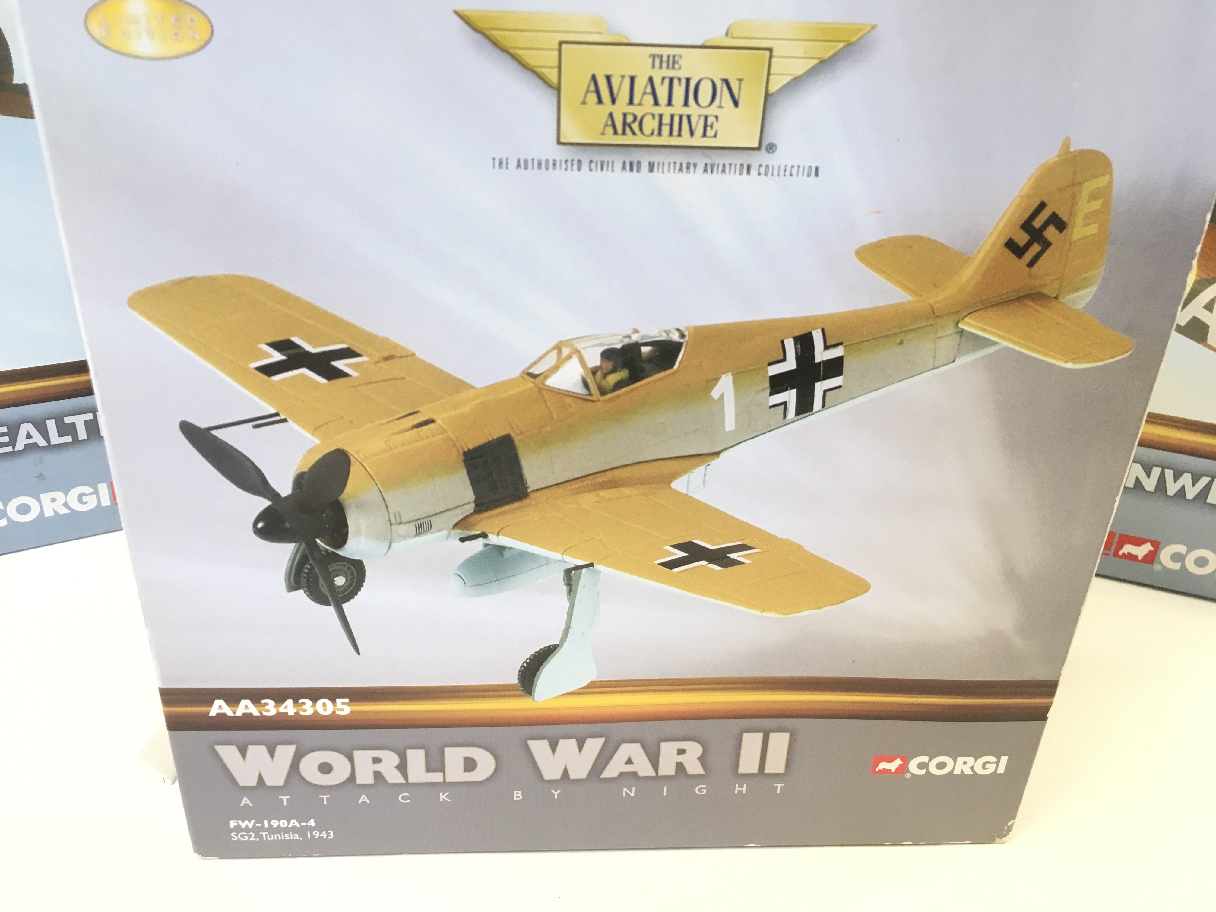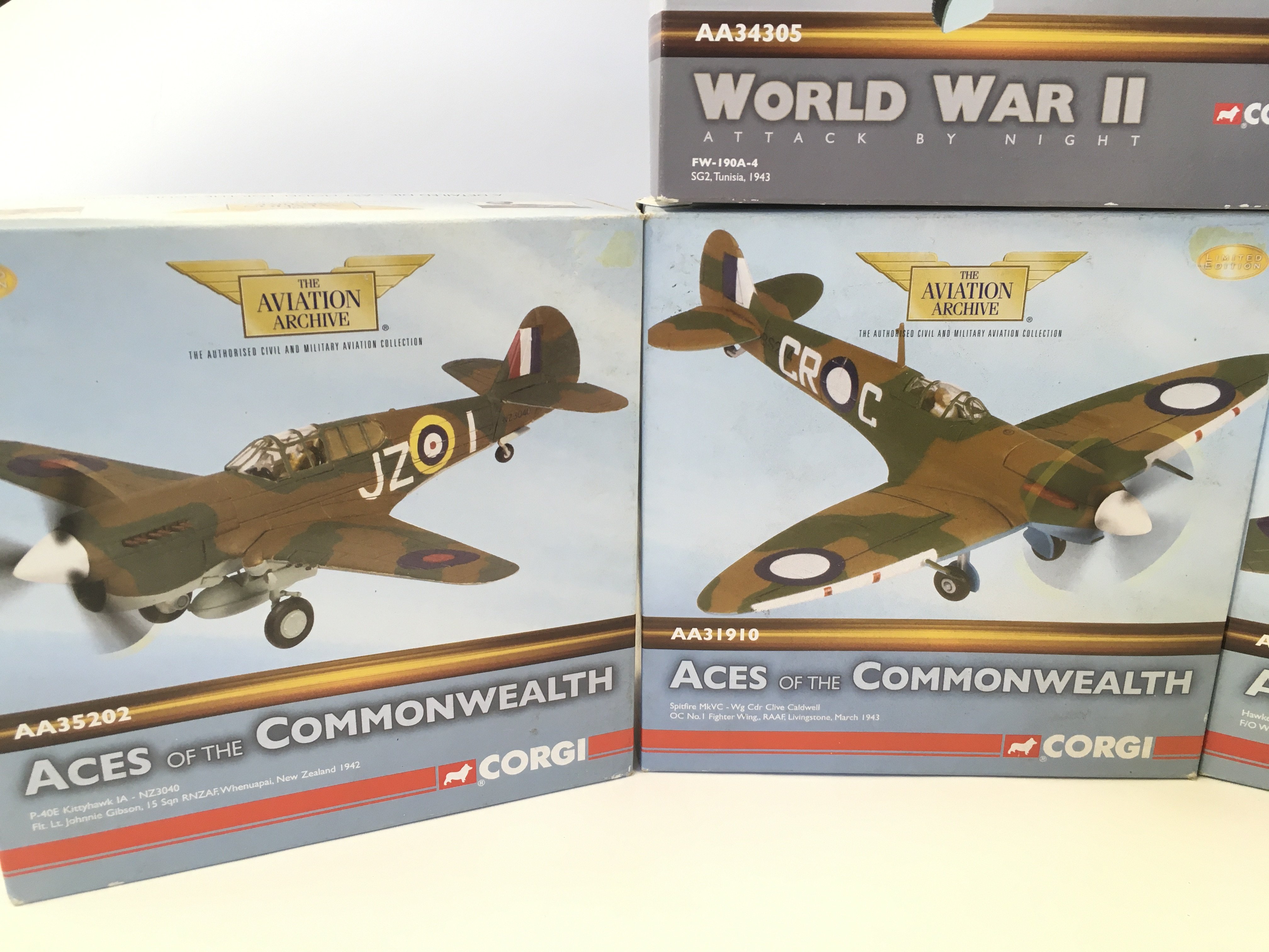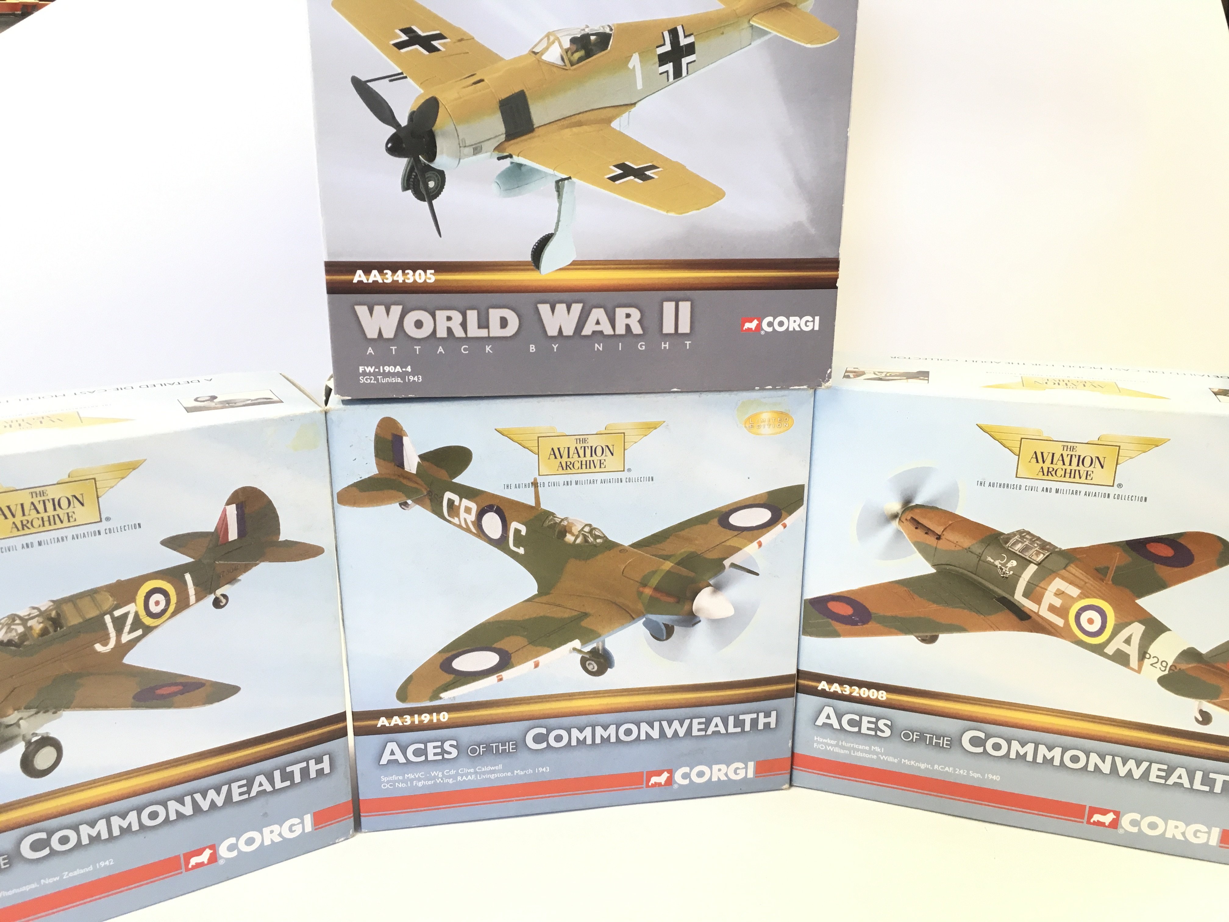 4 X Boxed Corgi Aviation Archive Aircraft including A Spitfire. A P-40E Kittyhawk. A Hawker Hurricane and a FW-190A-4.