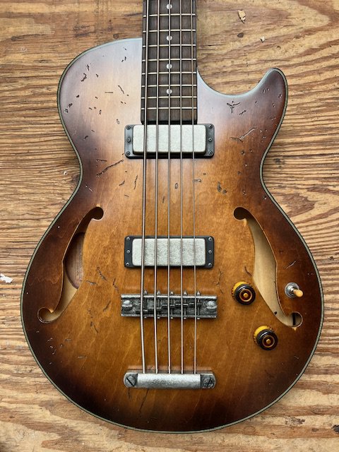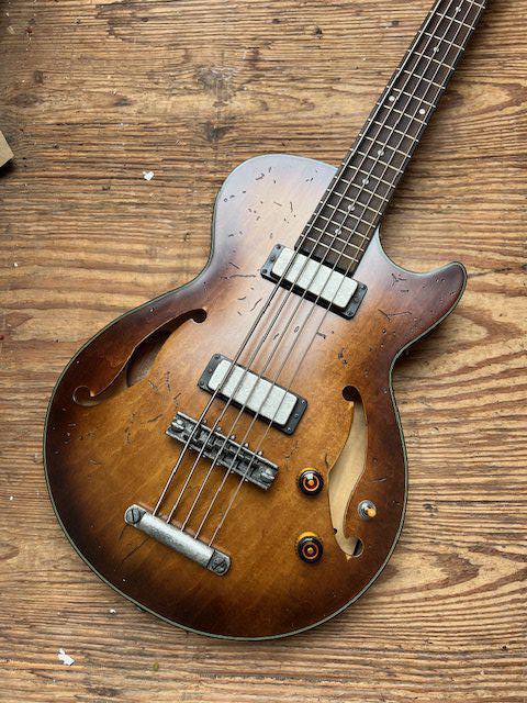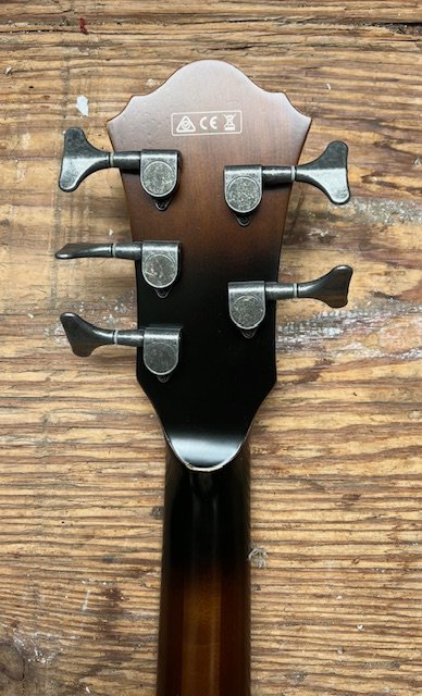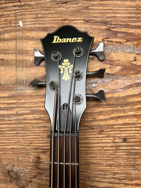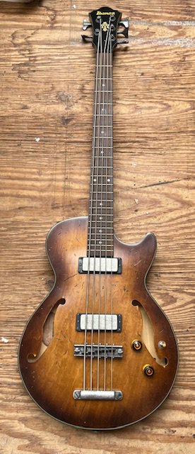 An Ibanez Artcore 5 String Bass Guitar with distinctive Ibanez finish in non original case - condition very good.