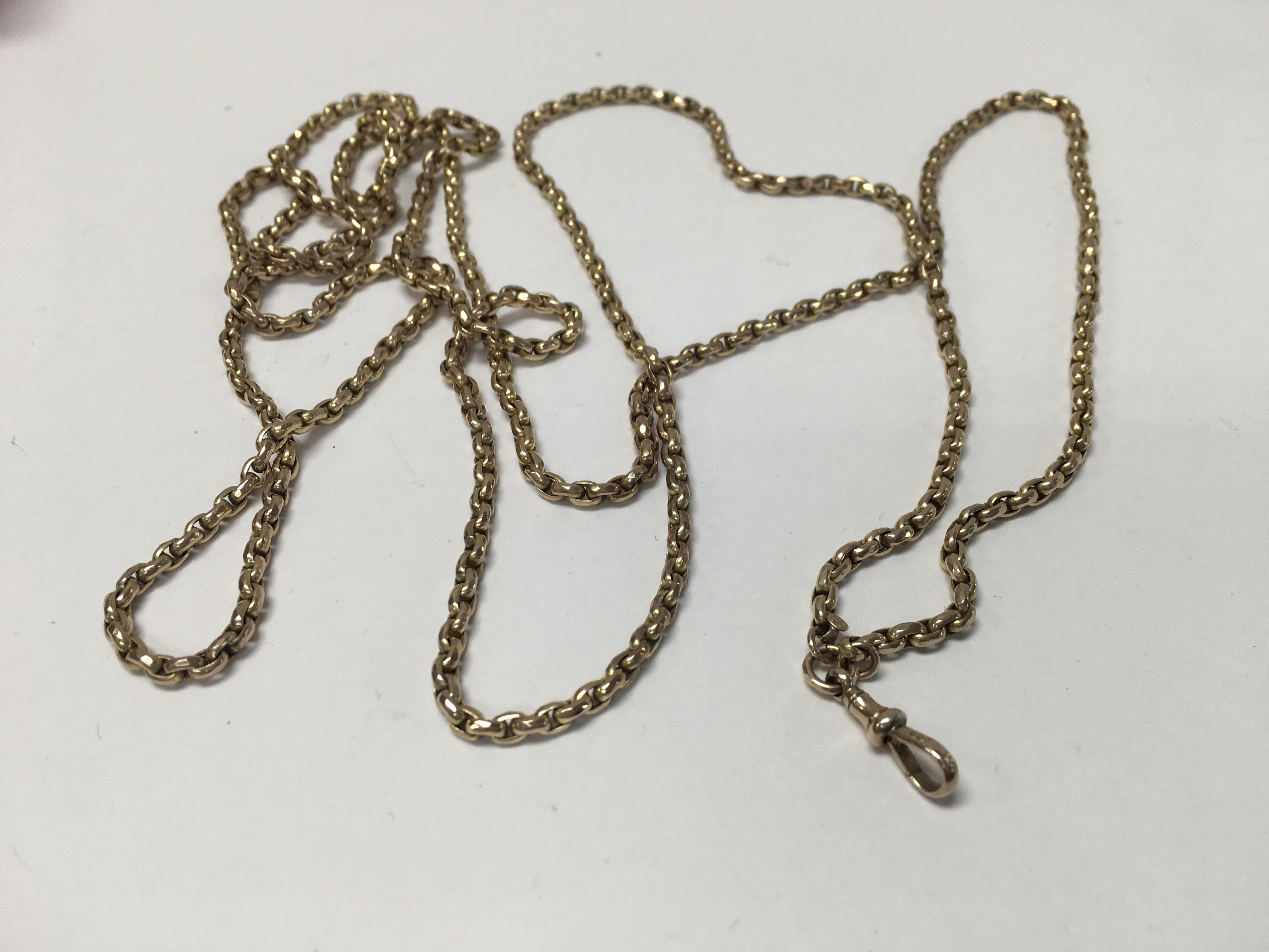 A 9ct gold long guard chain, approx weight 32.73 grams. Approx length 76cm.