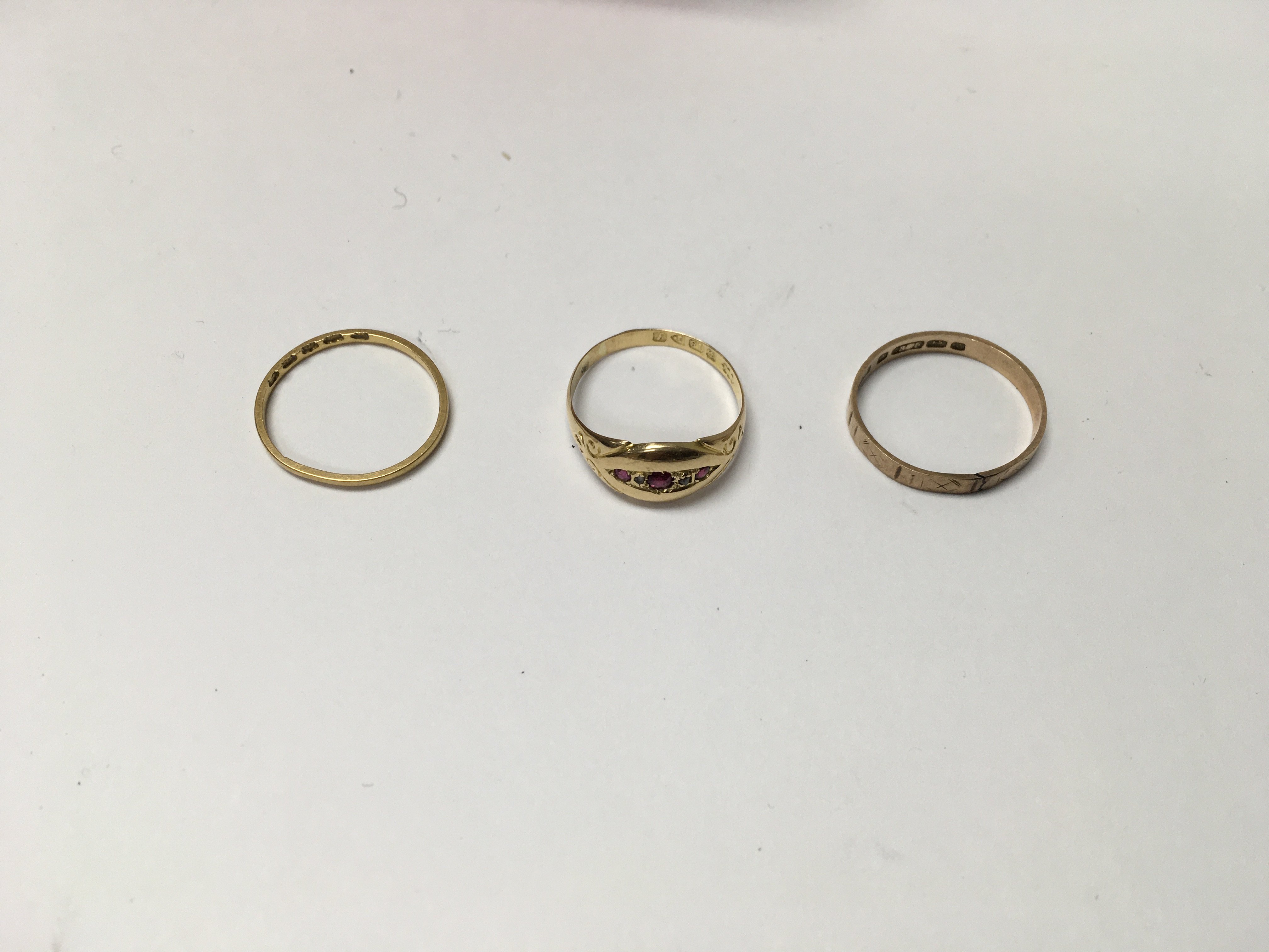 Three gold rings , including one 9ct gold ring, one 18ct told ring and another 22ct gold band.