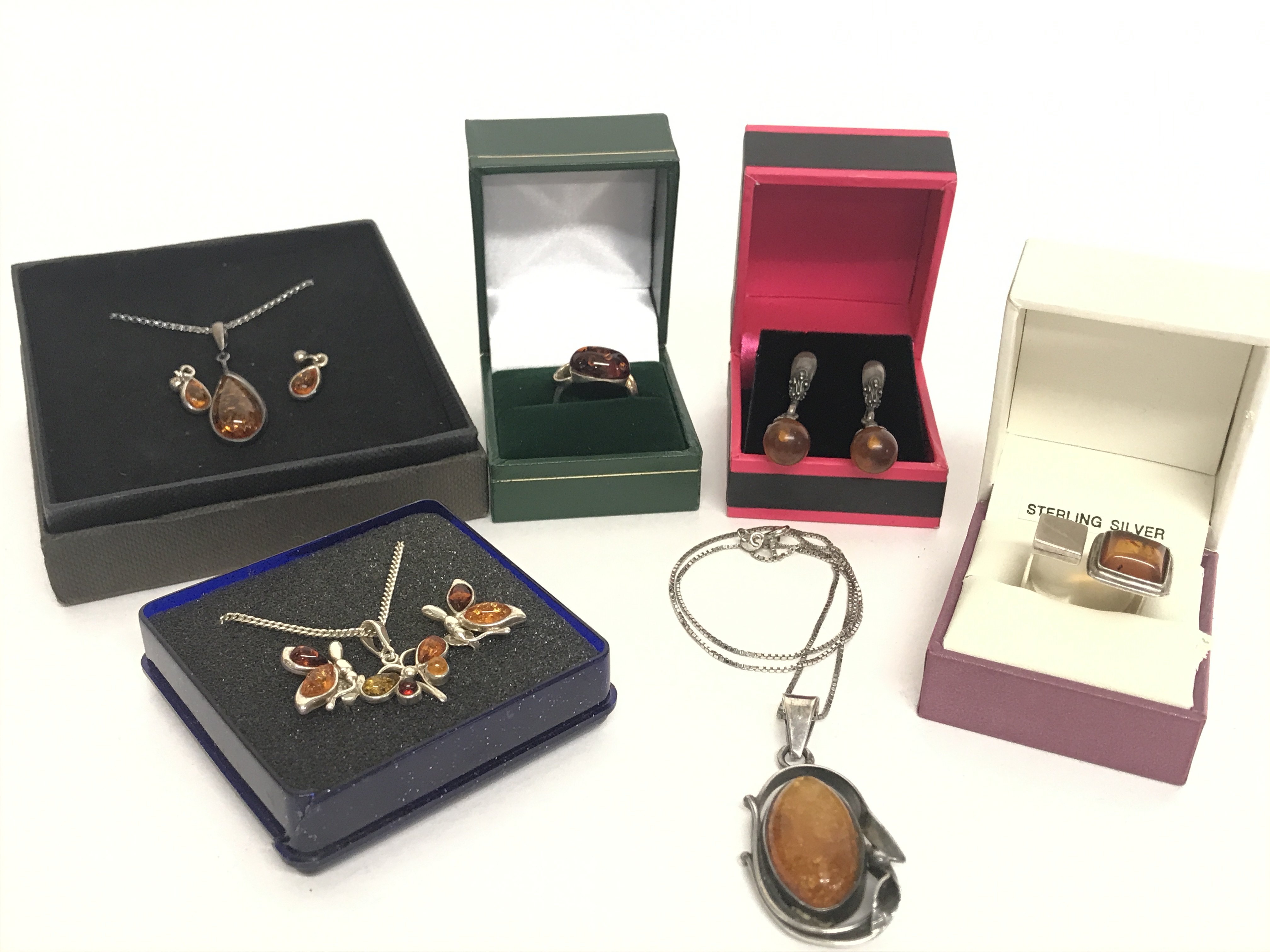 A Collection of silver and amber jewellery including necklaces, rings and earrings. Postage category B