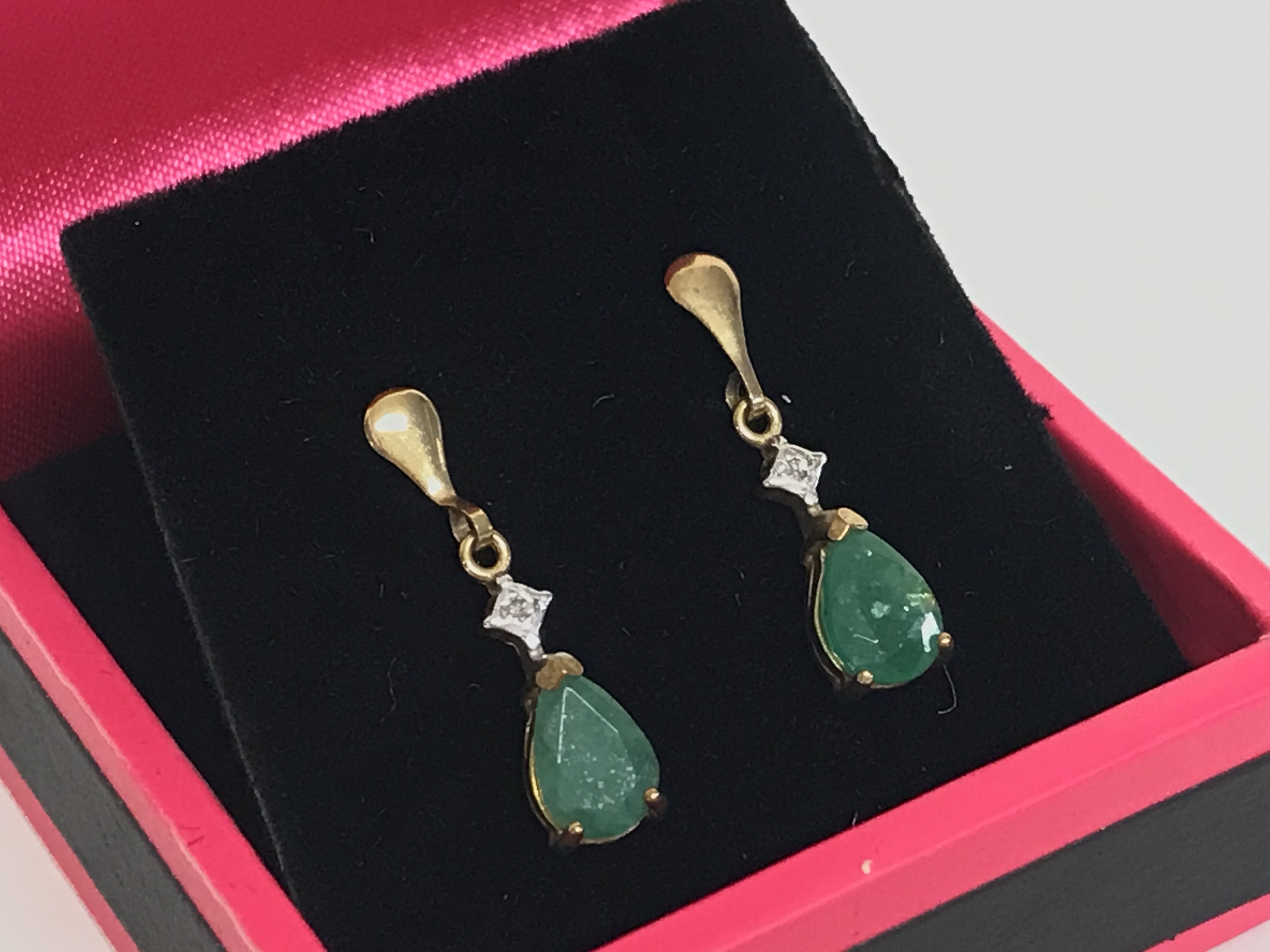 A pair of 9 carat gold and emerald drop earrings, total weight 1.2g postage category A