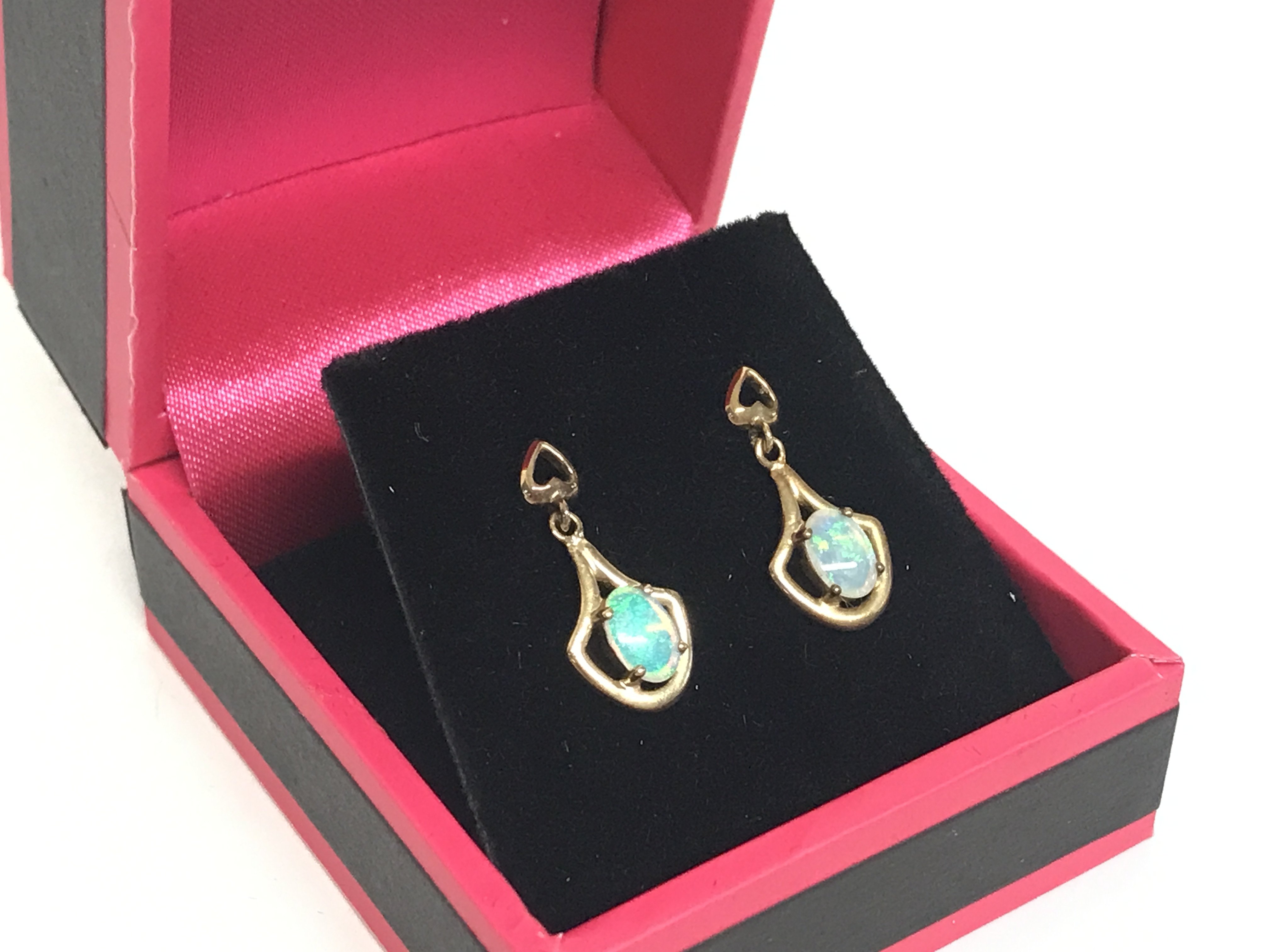 A pair of 9 carat gold and Opal drop earrings, 1.4g. Postage category A