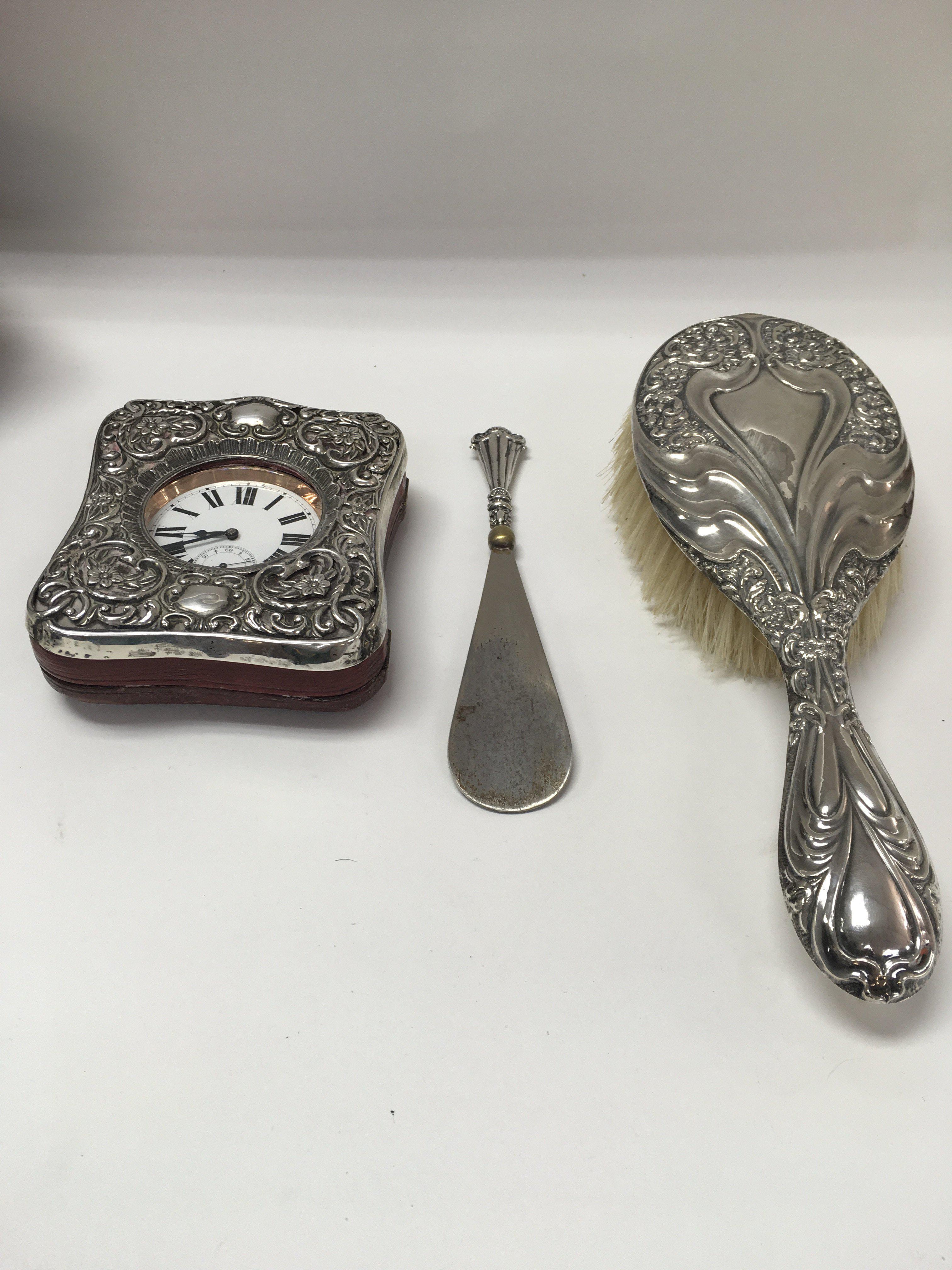 A collection of silver items including a hair brush, a shoe horn and a clock case.