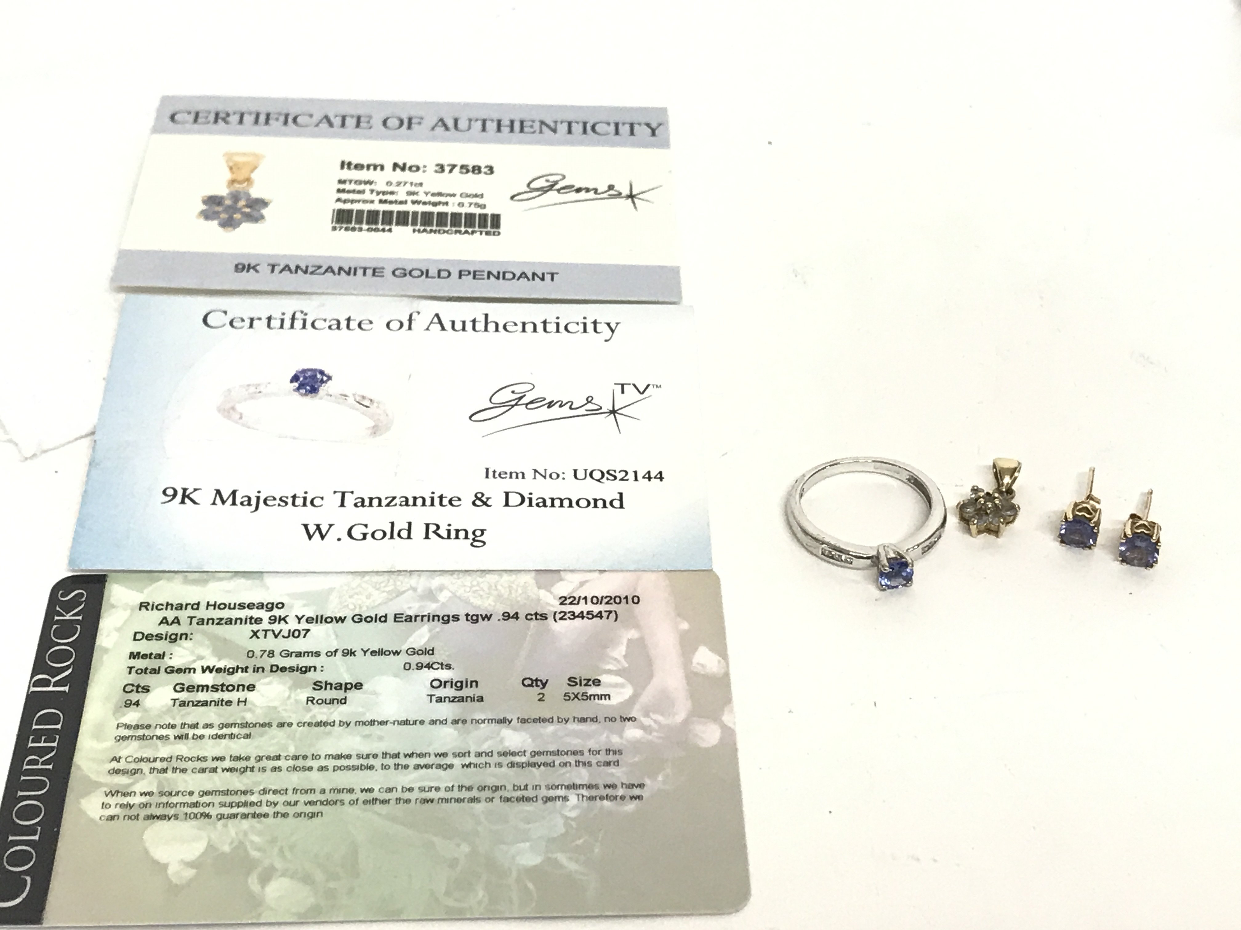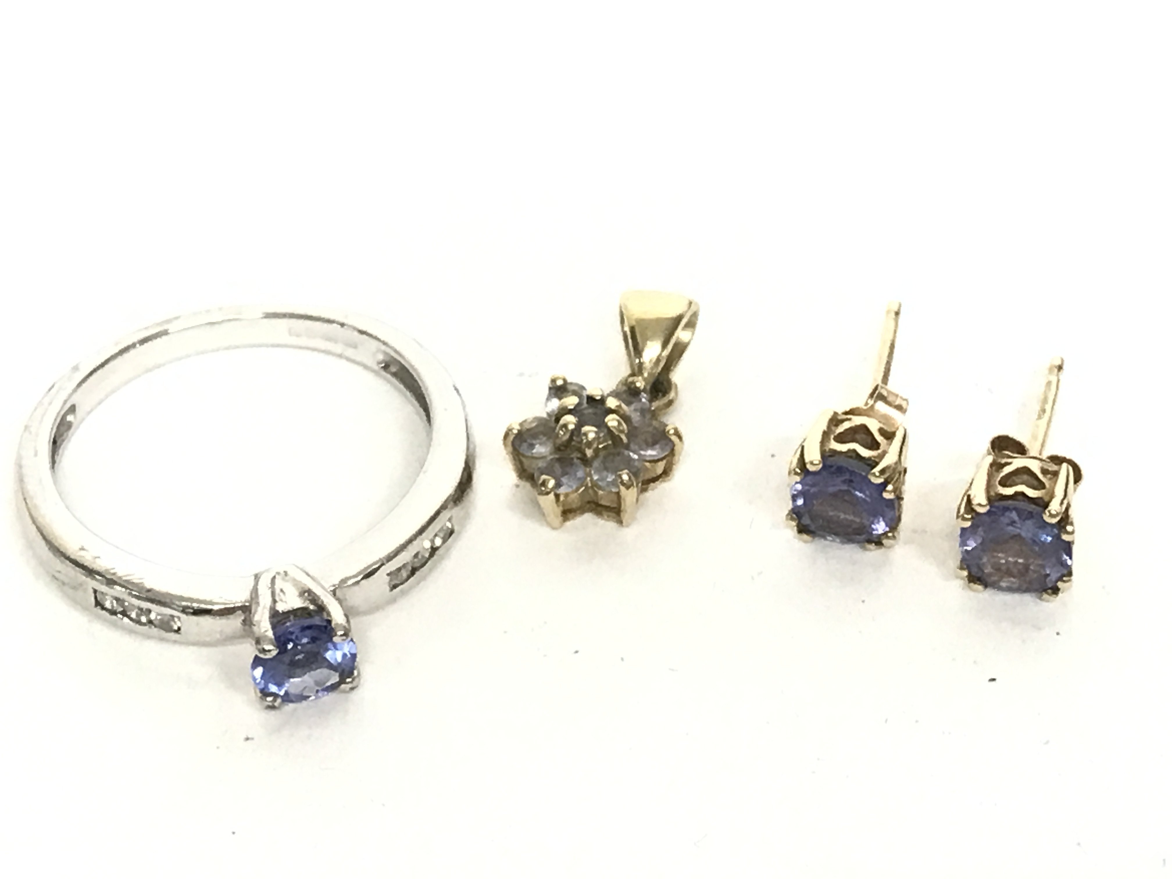 9 carat yellow gold Tanzanite set pendant, 9 carat yellow gold Tanzanite earrings, a 9 carat majestic tanzanite & diamond white gold ring. Total weight 4.2g Postage category A