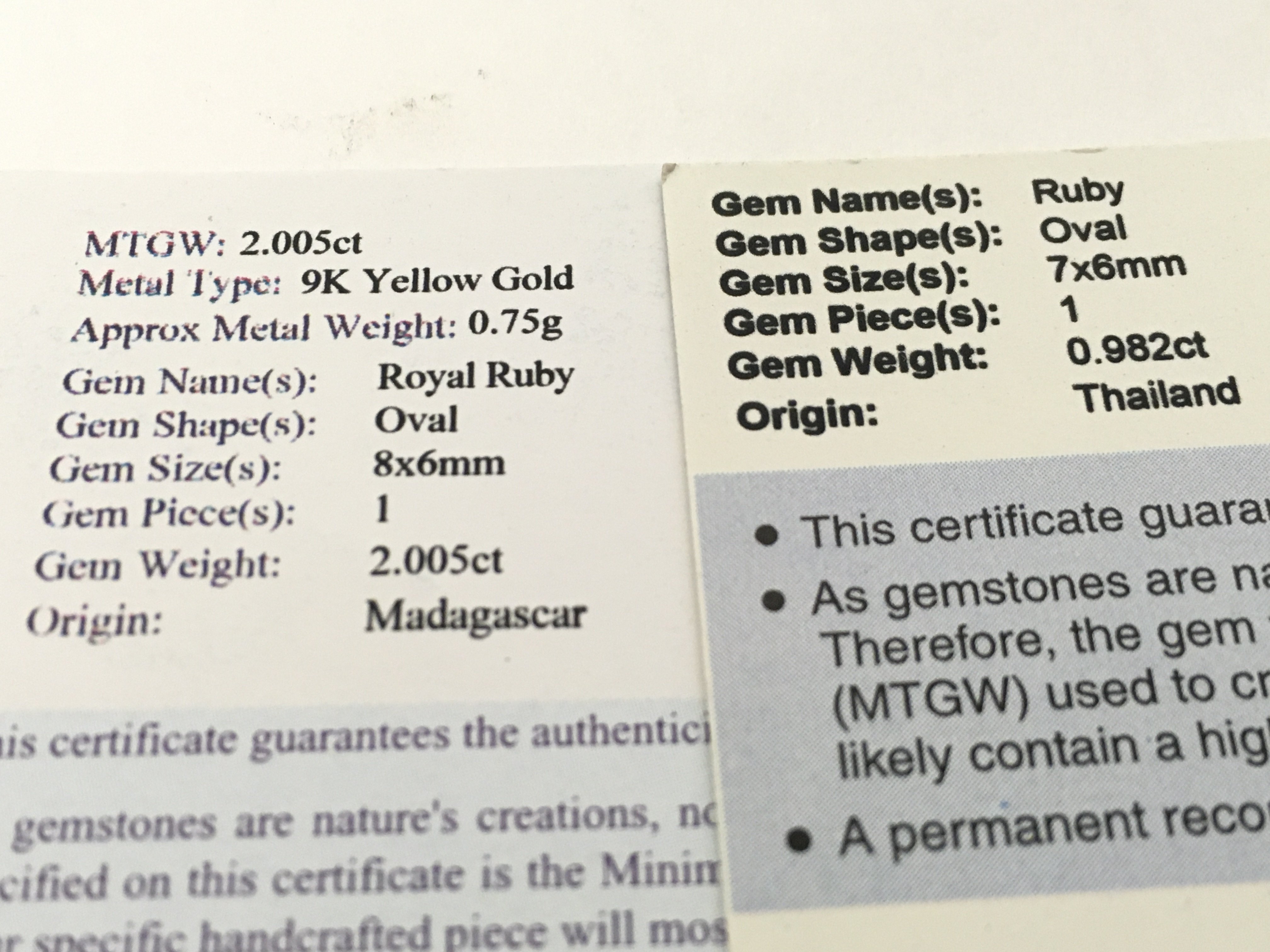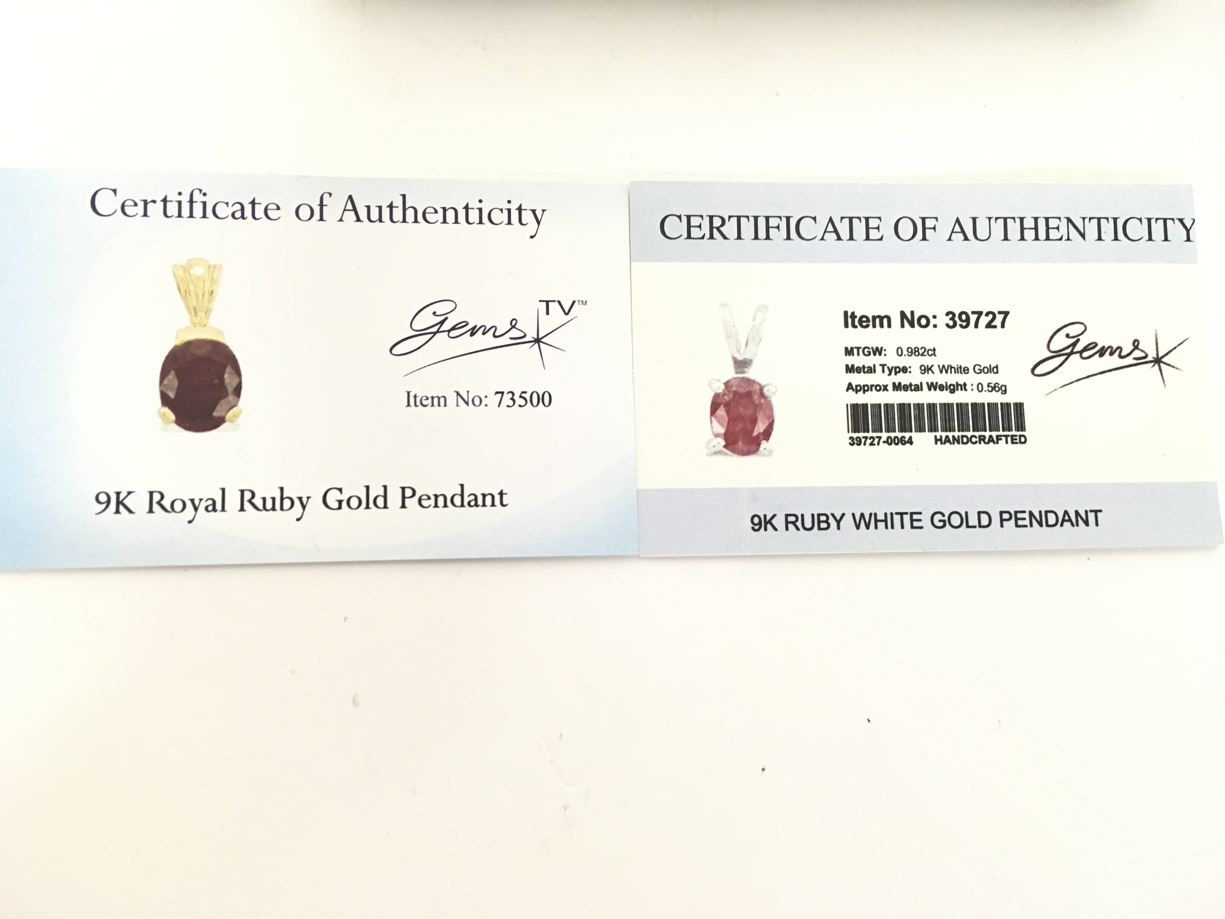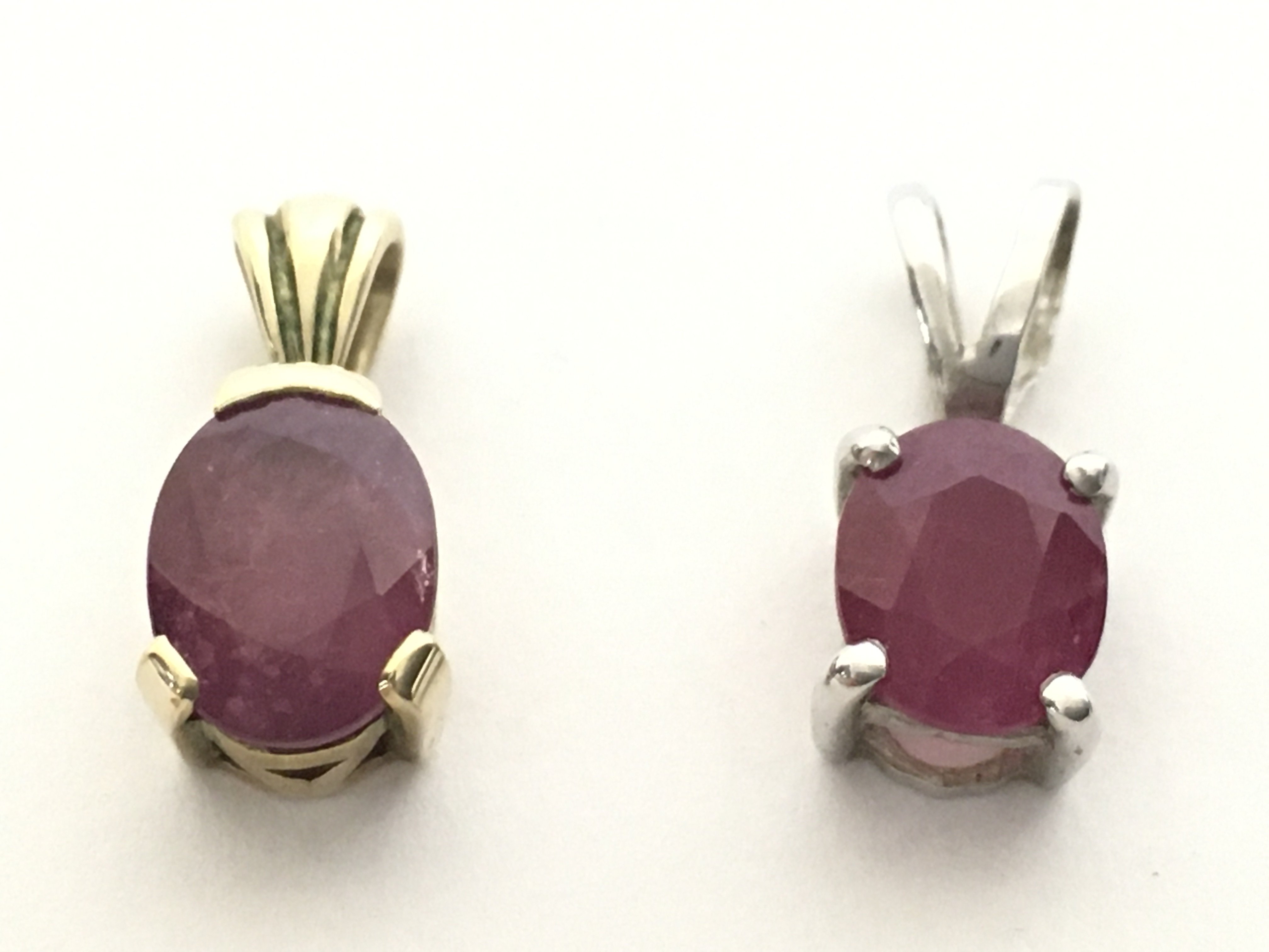 A 9ct white gold ruby pendant and a 9ct yellow gold ruby pendant. With certificates. Total weight 2g Postage category A