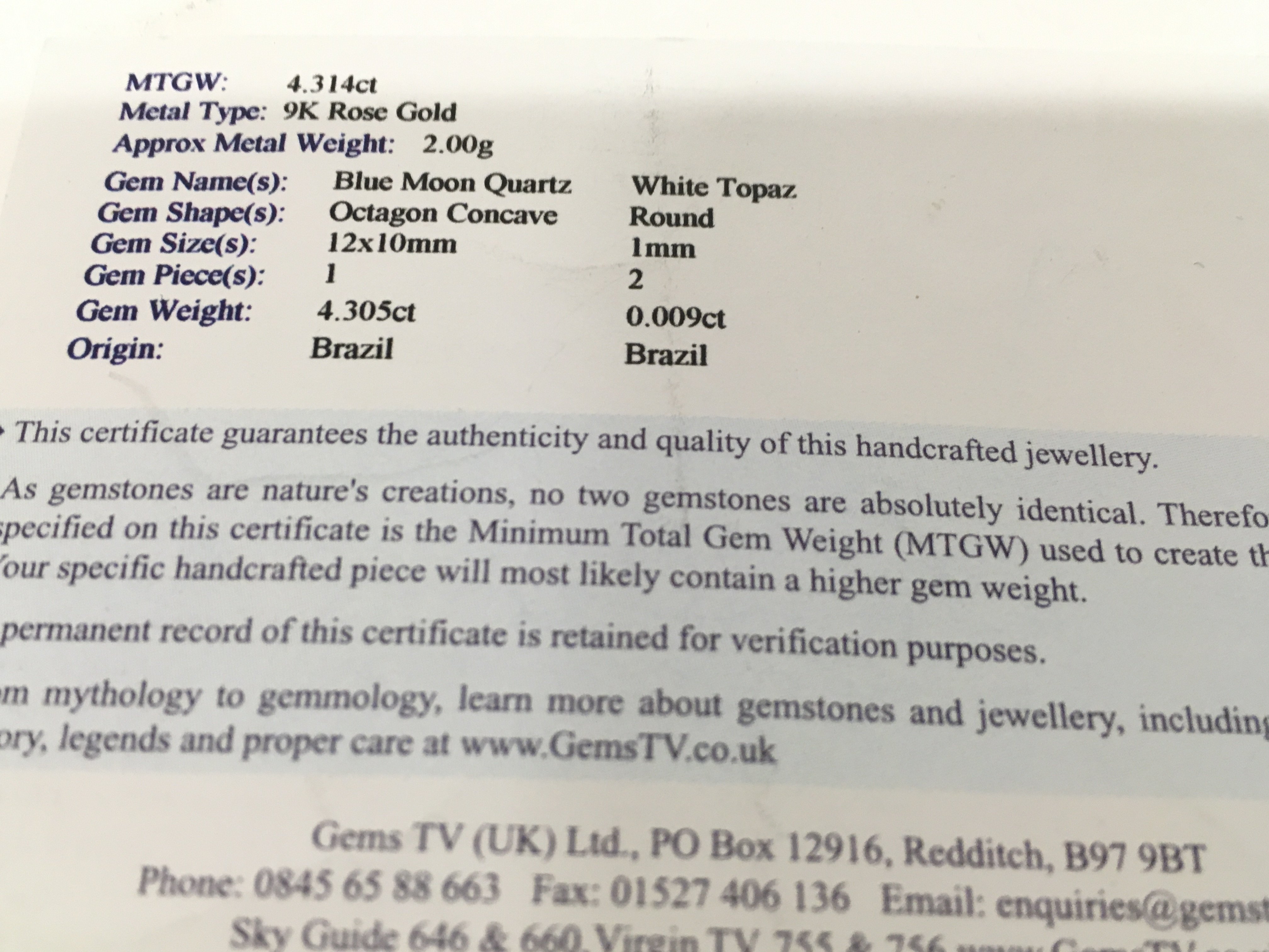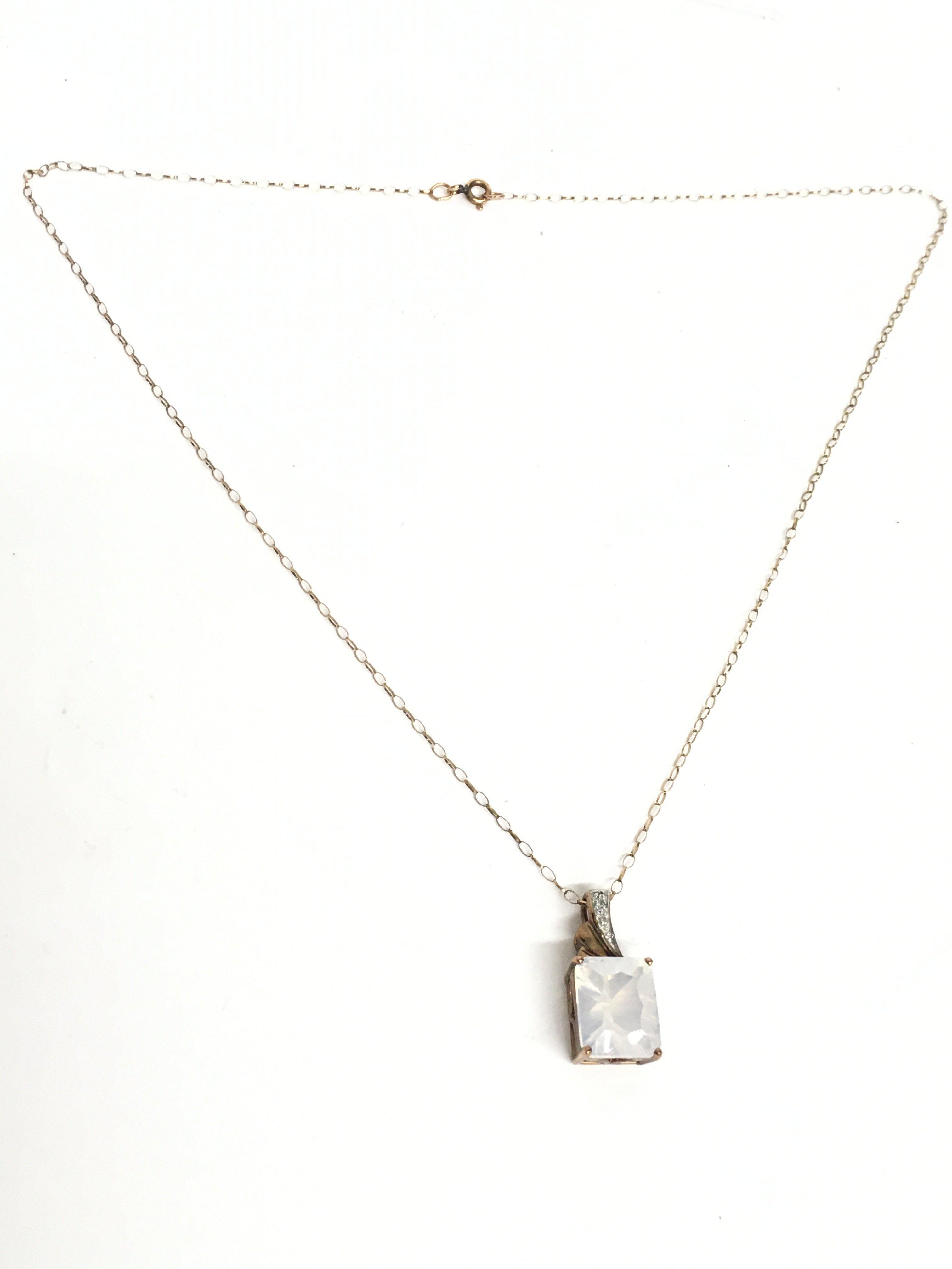 A 9 carat rose gold blue moon quartz pendant and chain. Overall weight 3.6g. With certificate. Postage category A