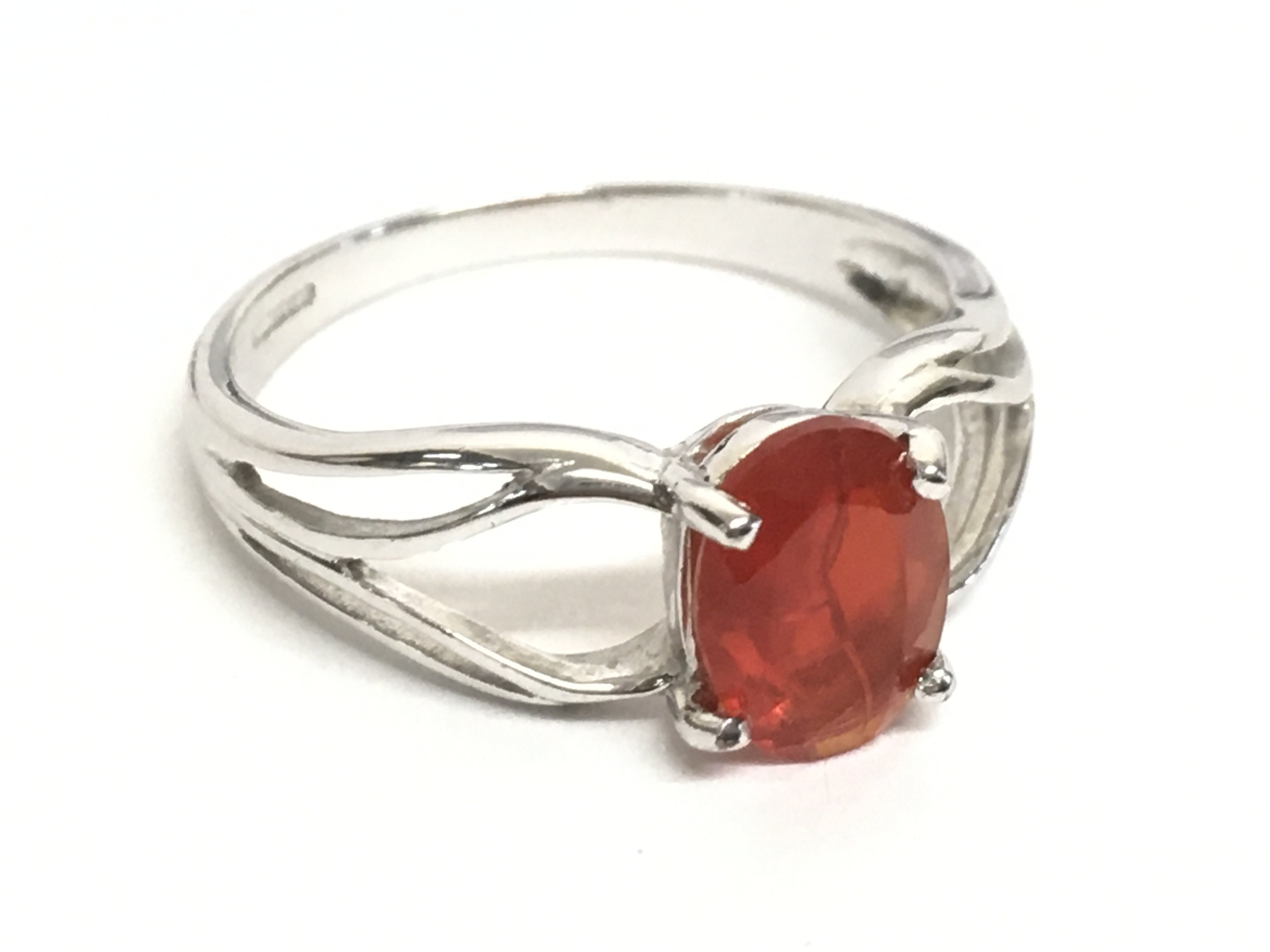A 9 carat white gold fire opal stone set ring, size N/O. 2.2g. Postage category A
