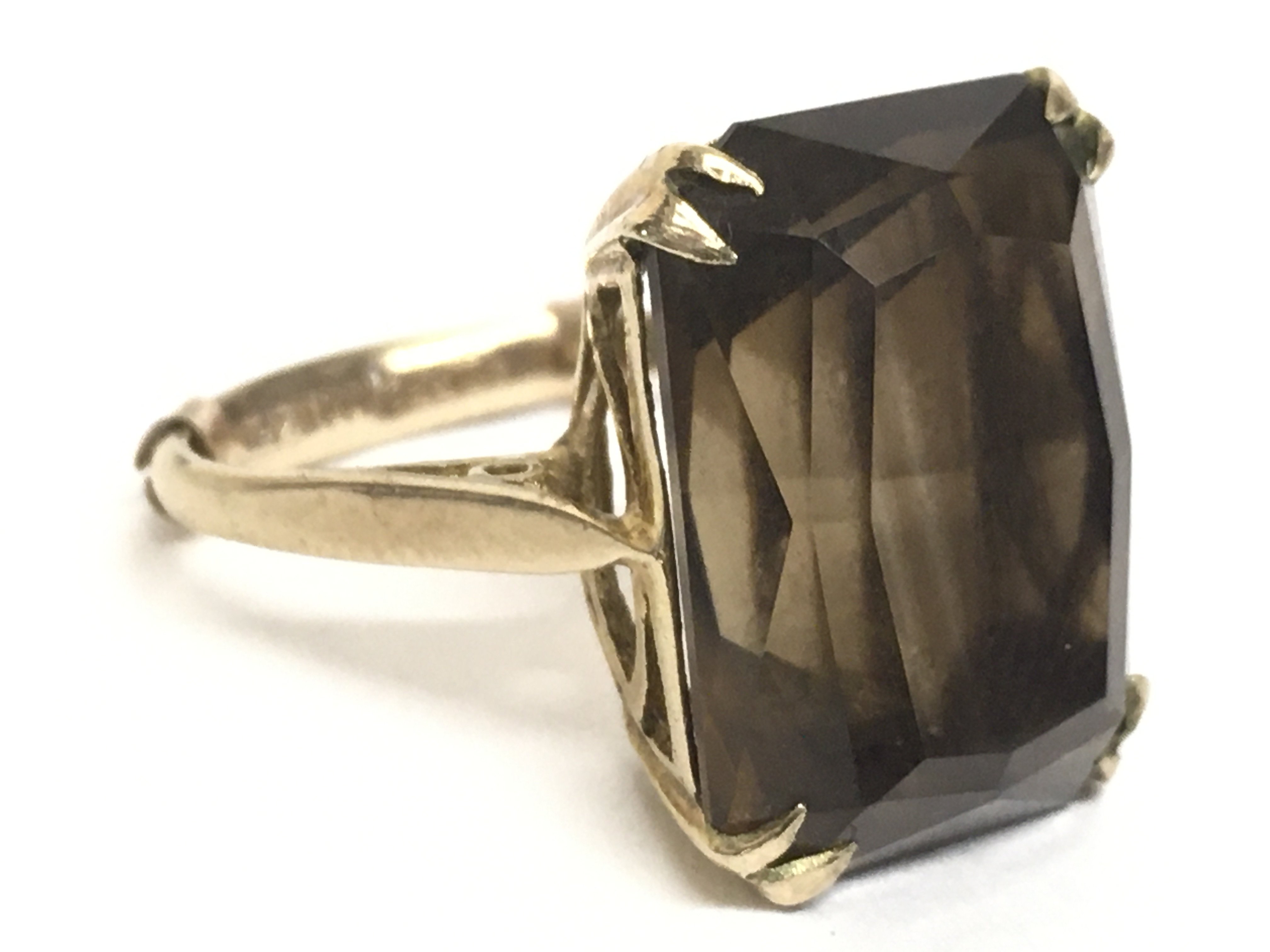 A 9 carat yellow gold ring set with a smoky citrine stone. 6g. Postage category A