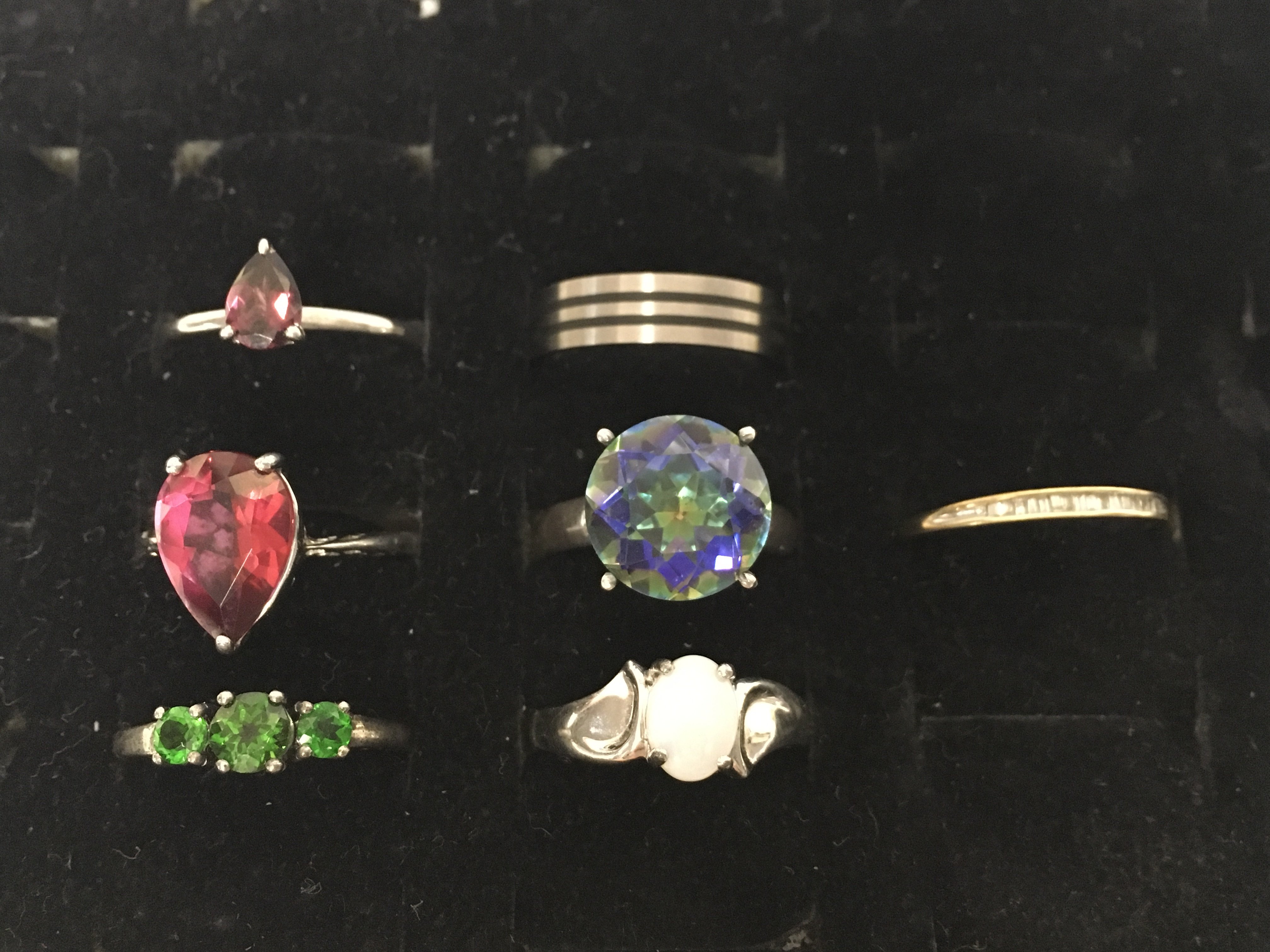 A collection of silver rings including amethyst, opal etc set and a 9 carat gold ring set with diamond shards. Postage category A