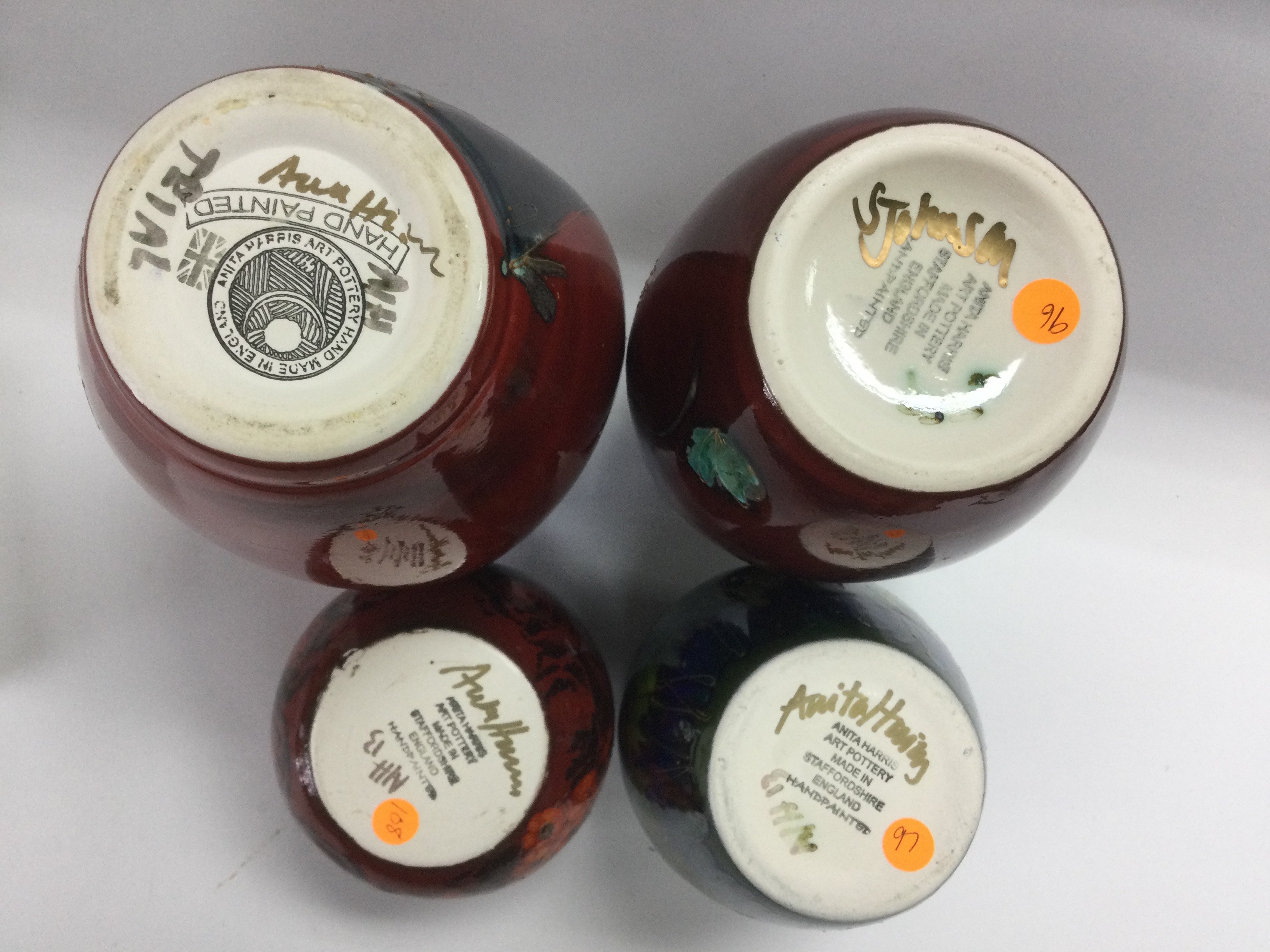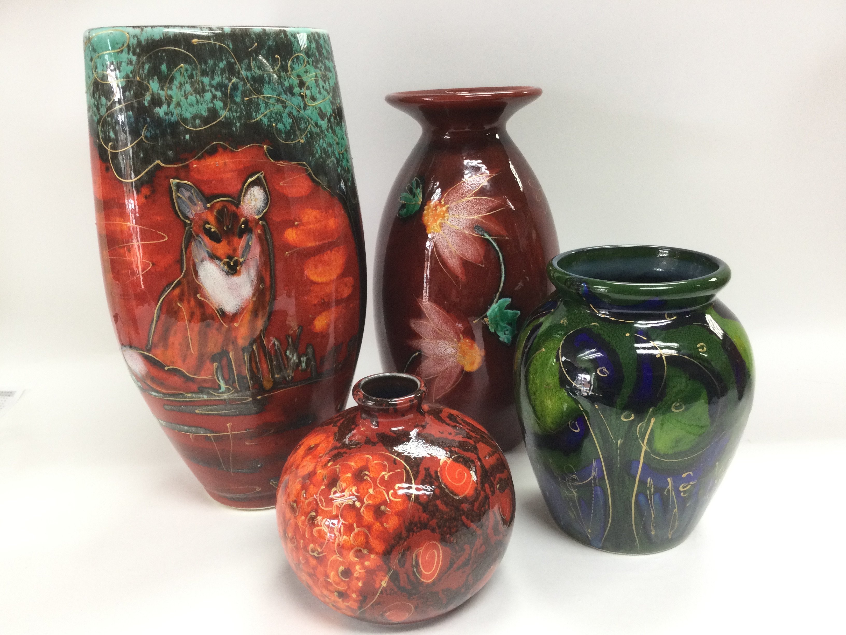 Four Anita Harris pottery vases comprising signed examples including a tall vase with fox, approx 24cm, a Marrakesh vase, Daisy chain and Ali Baba. Shipping category D.