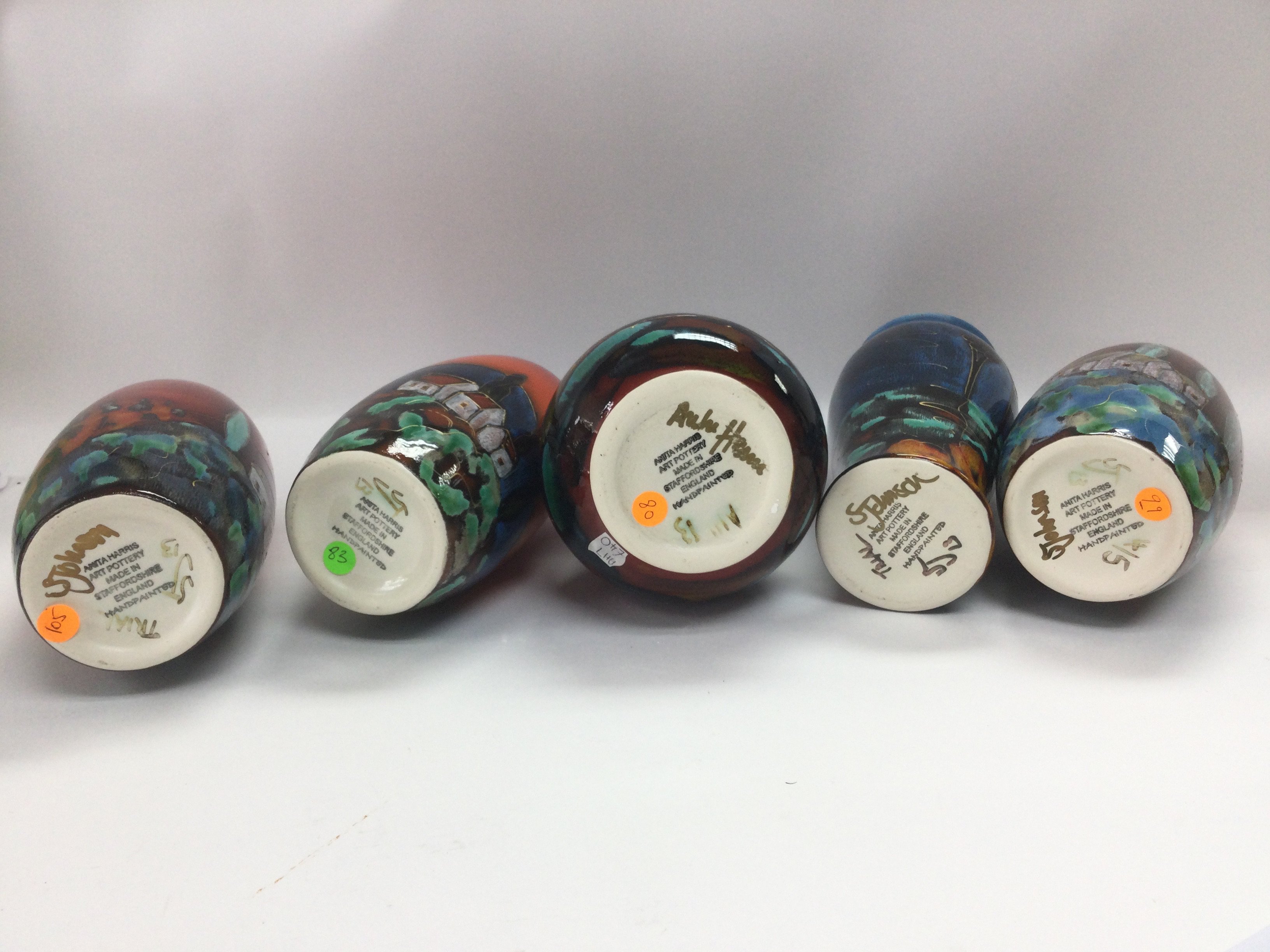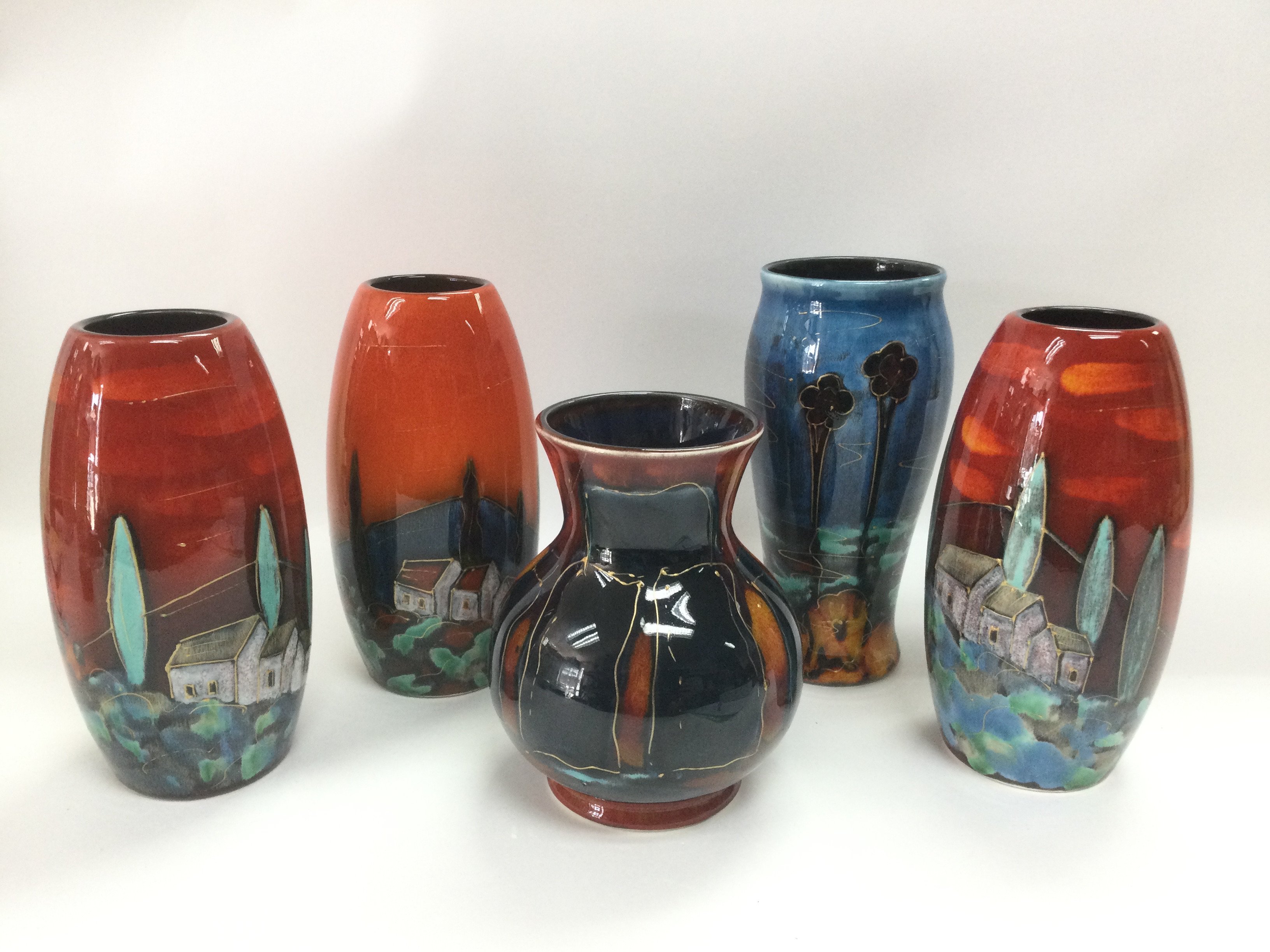 Five Anita Harris vases comprising limited edition examples and a trial vase, signed to base. Tallest approx 18cm. Shipping category D.