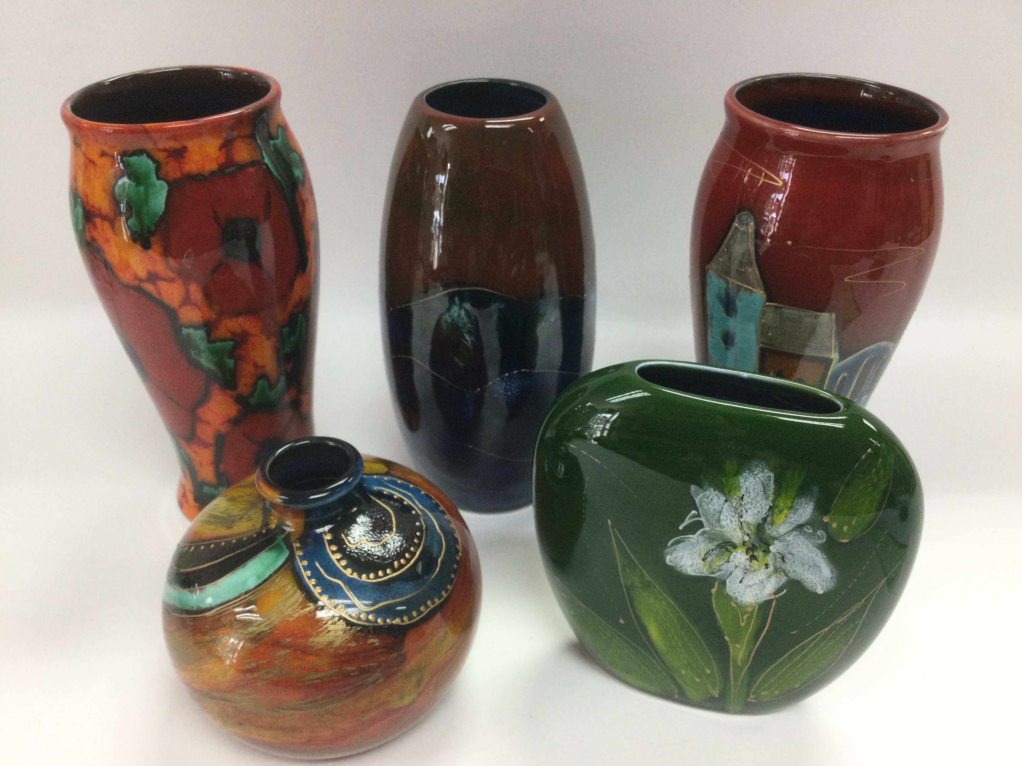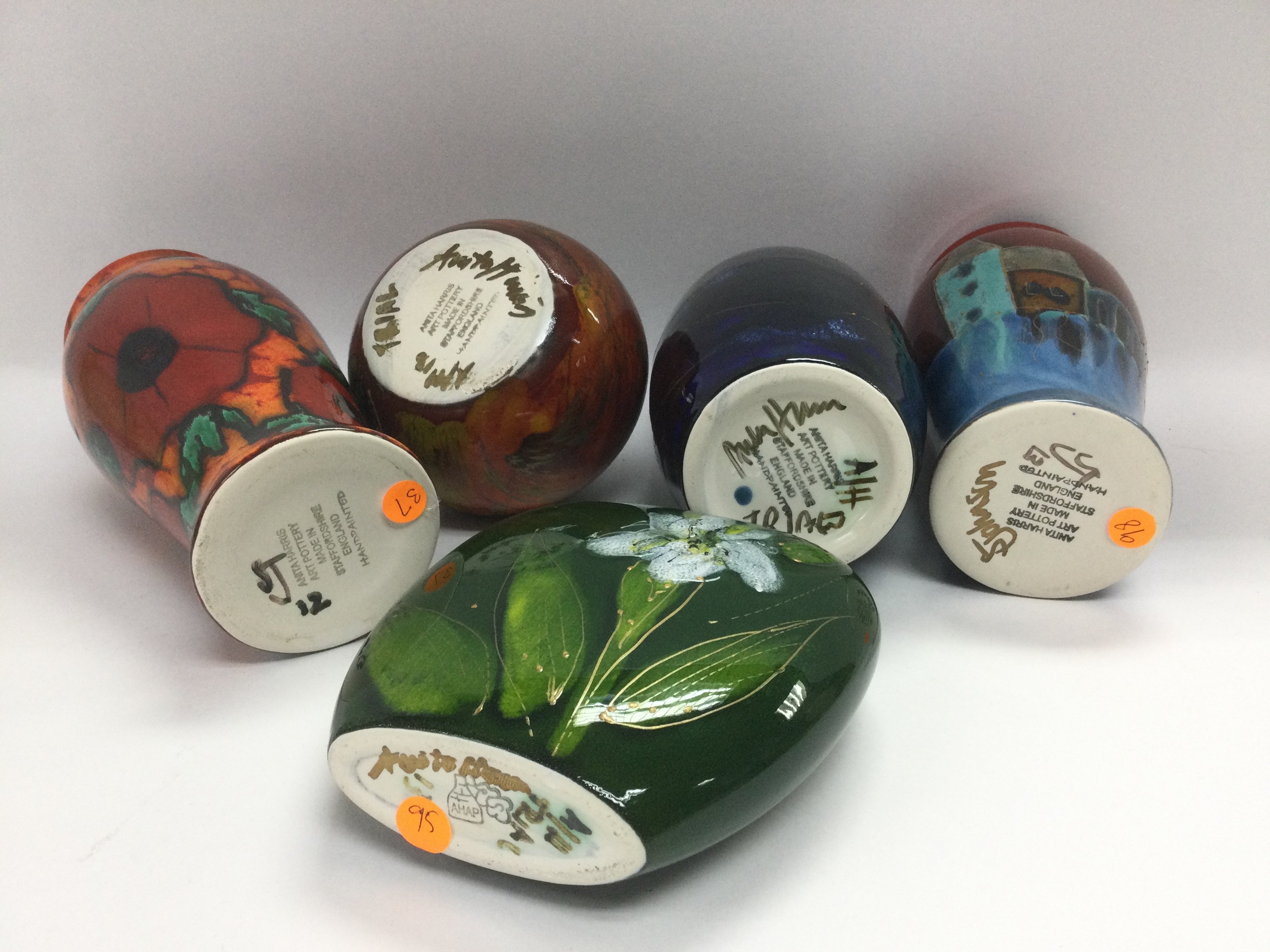 Five Anita Harris pottery vases including trial vase and limited edition examples, signed to base, tallest approx 18cm. Shipping category D.