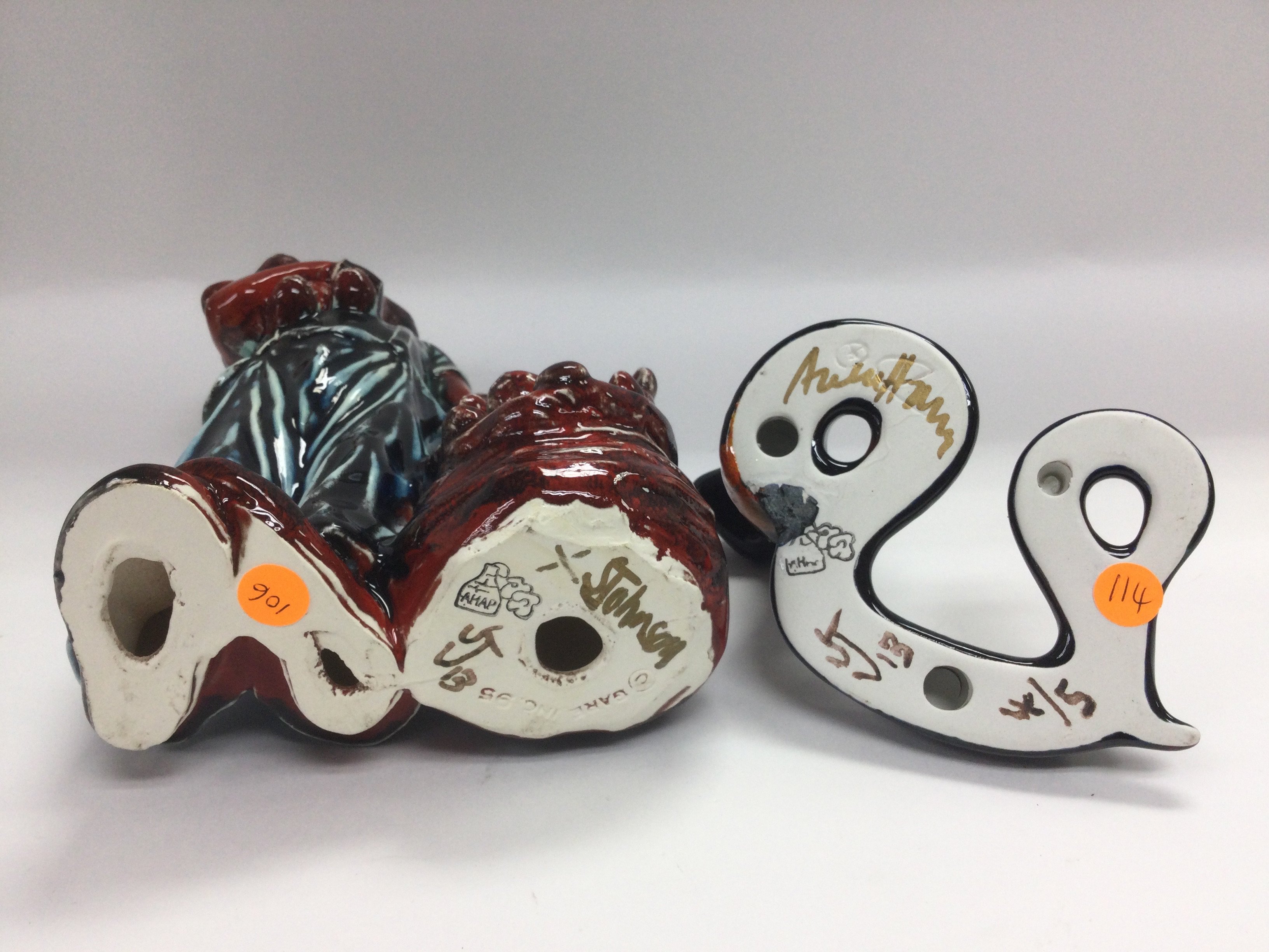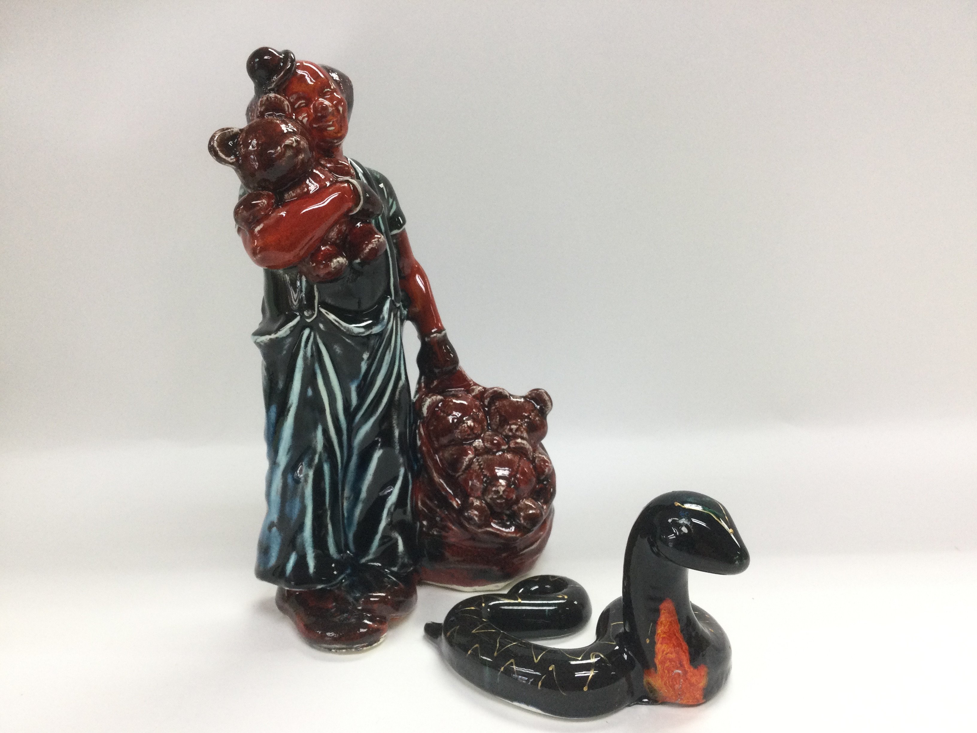Two Anita Harris pottery figures comprising a unique 1 of 1 'Clown and teddies', approx height 22.5cm plus a rare figure of a snake, approx height 8cm (2). Signed to base. Shipping category D.