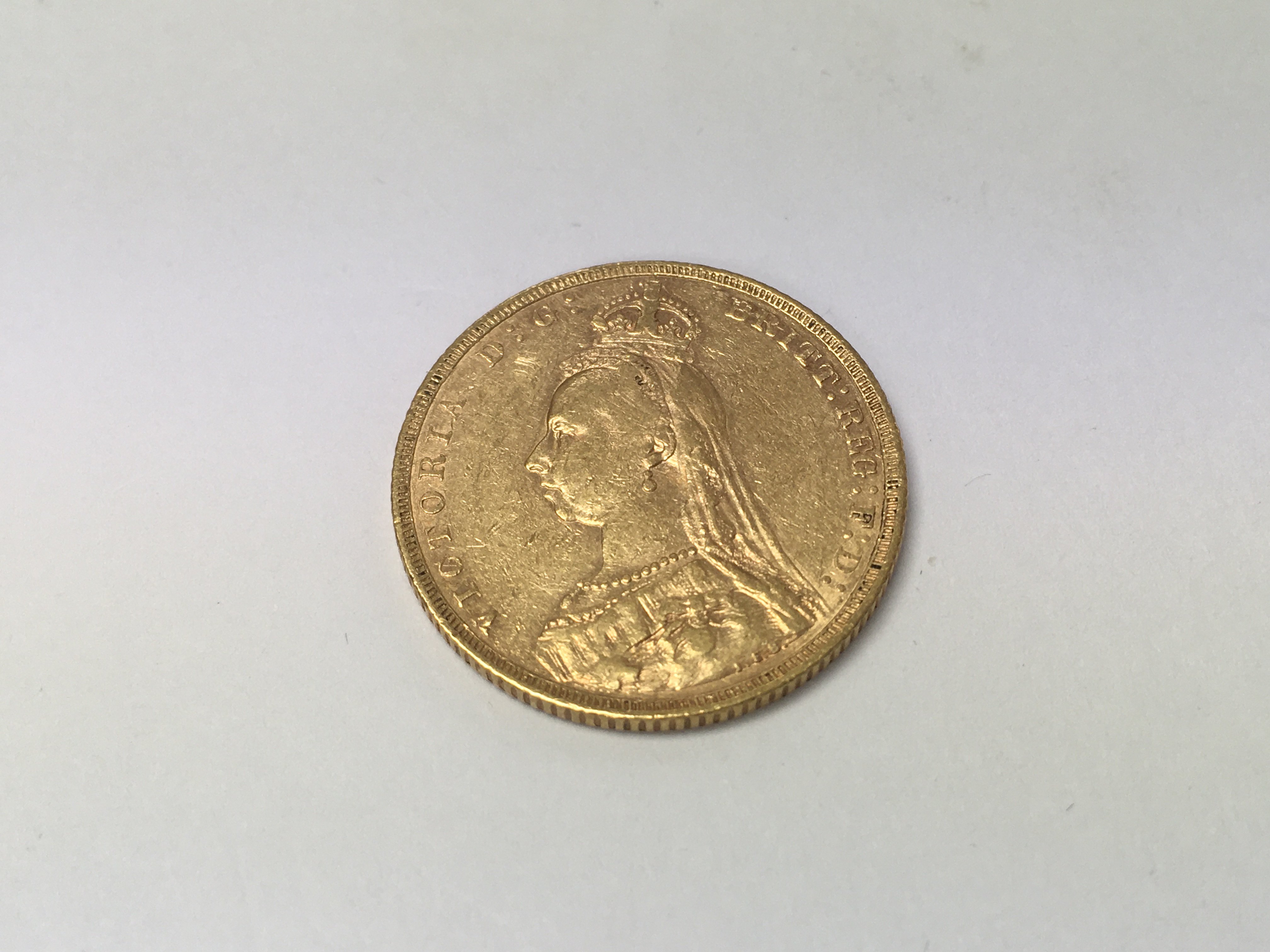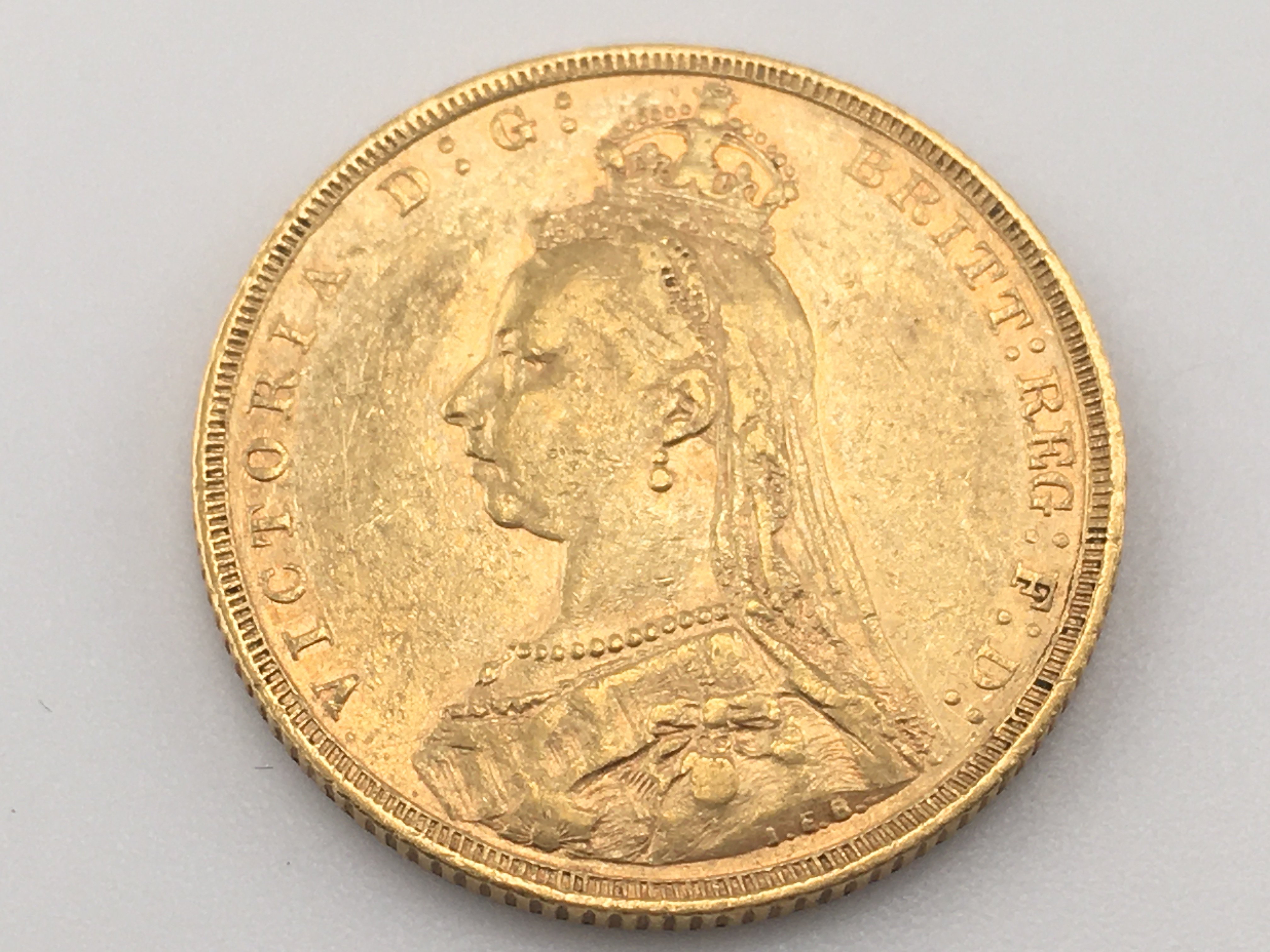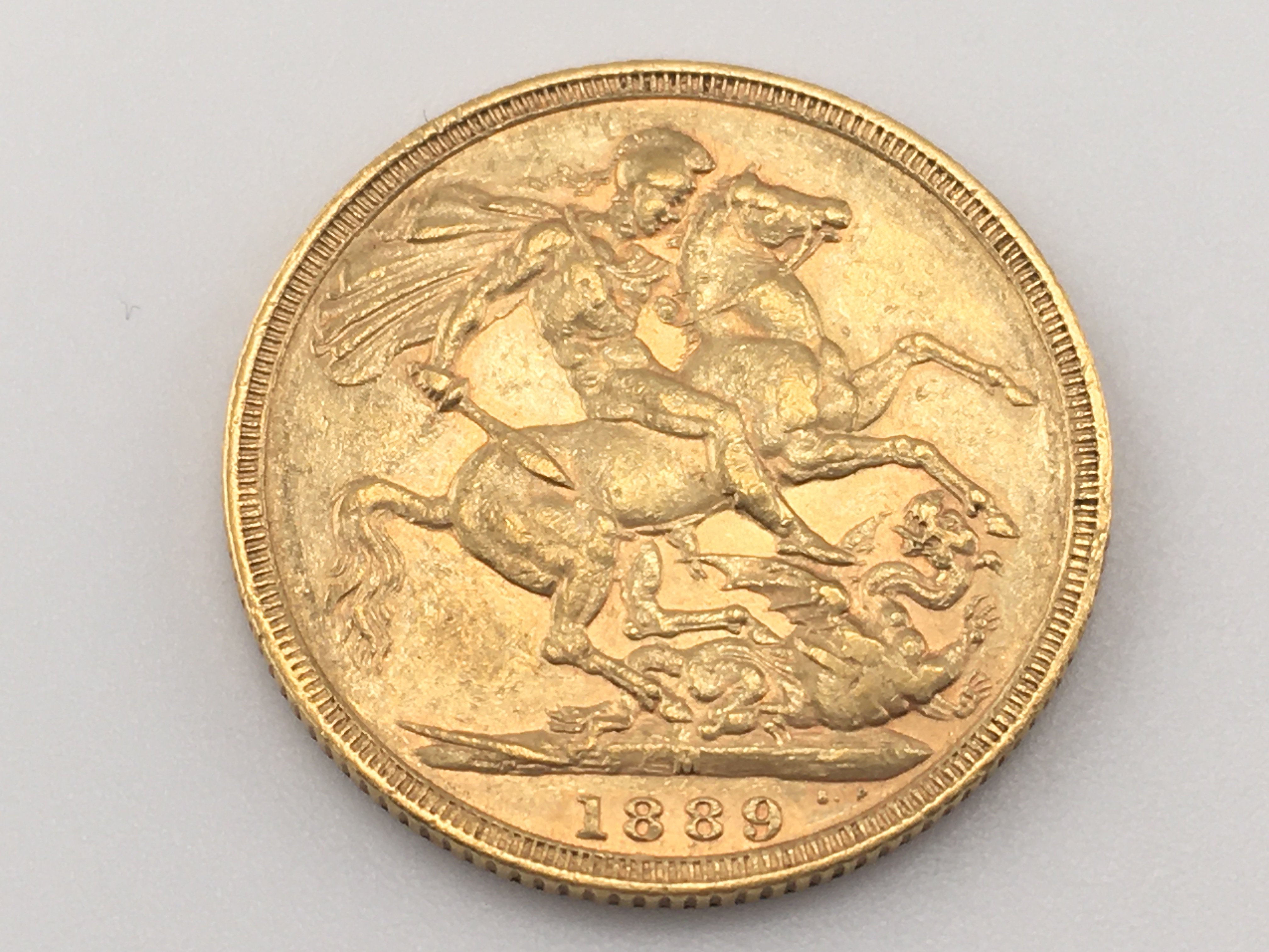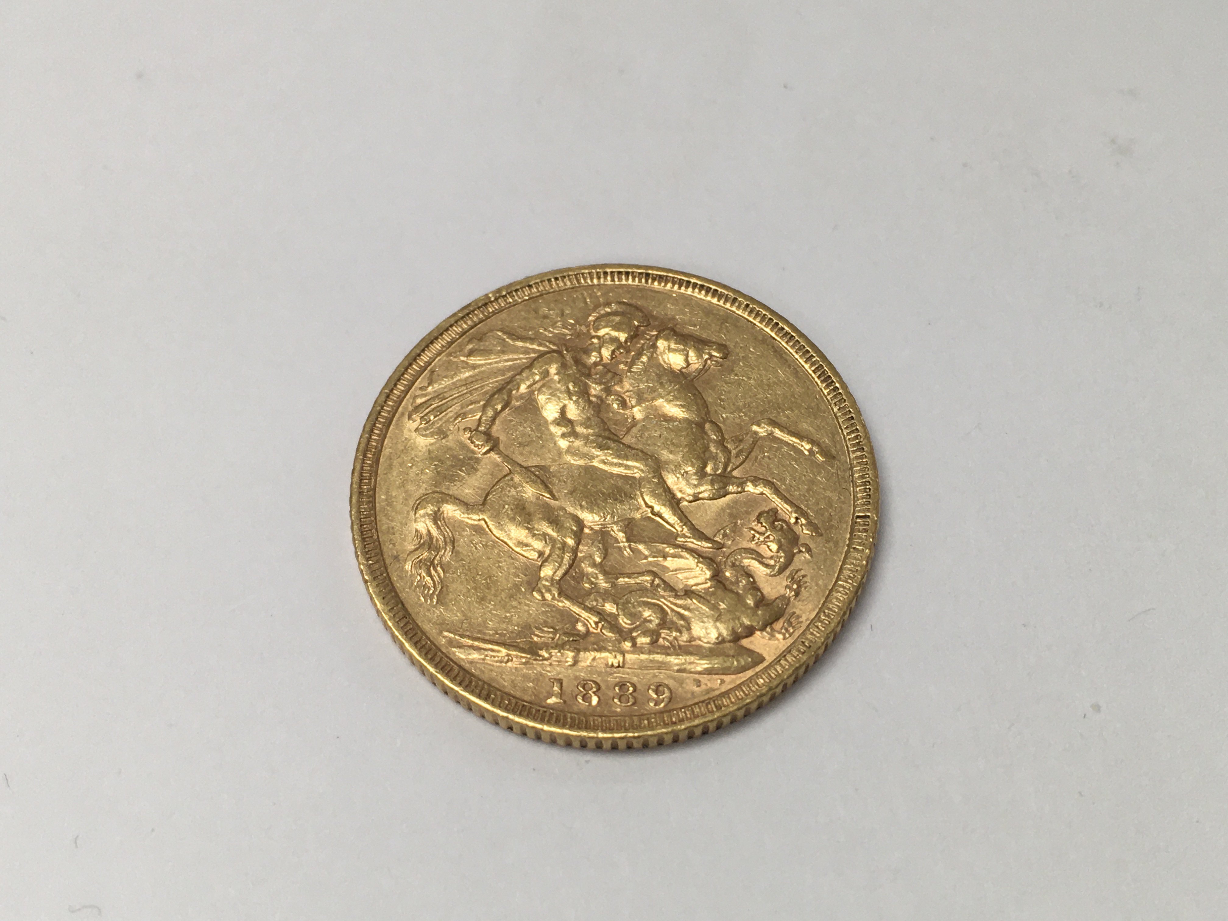An 1889 full sovereign with Melbourne mint mark. Postage cat A.