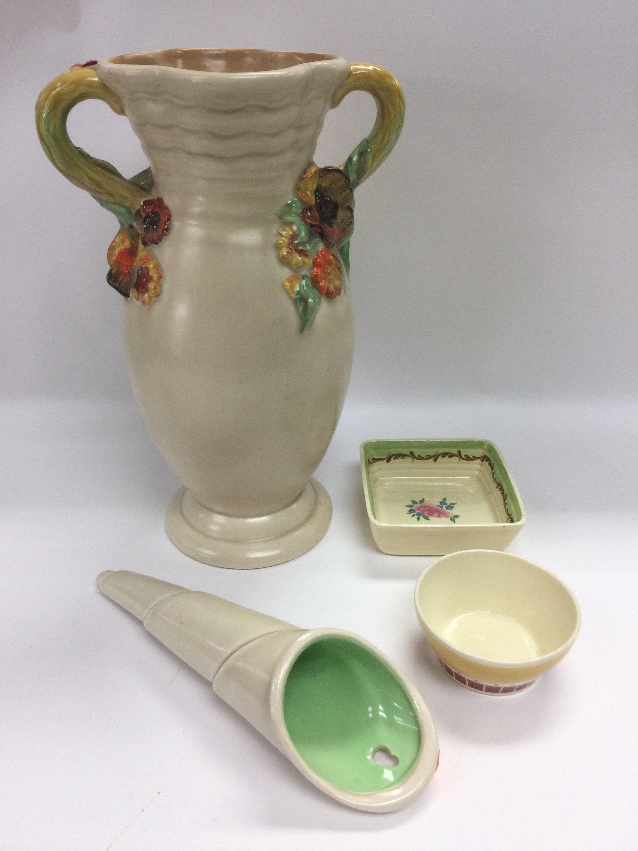 Three Clarice Cliff items comprising a two handled vase, approx height 30cm, a conical wall vase and a square dish plus a small Susie Cooper dish (4). Shipping category D.