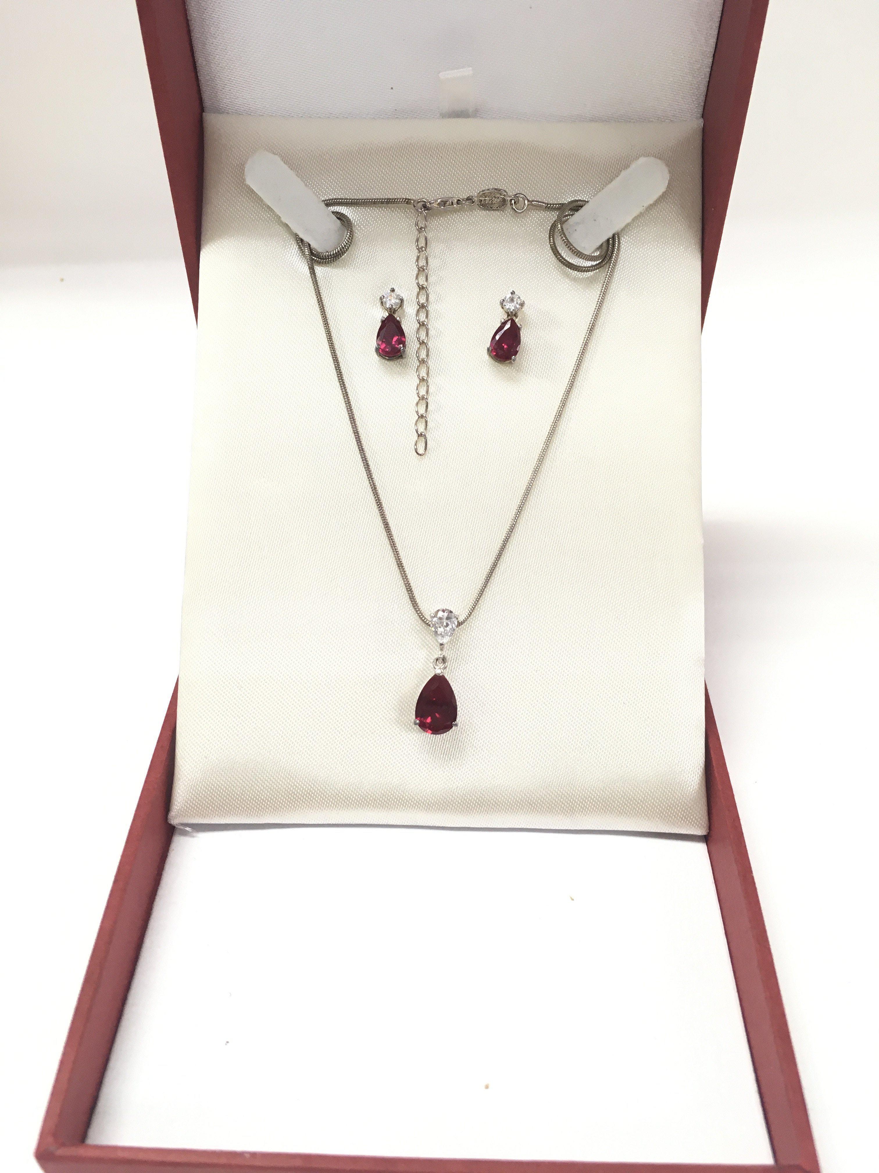 A sterling silver necklace set with simulated rubys and cz with a matching pair of earrings.