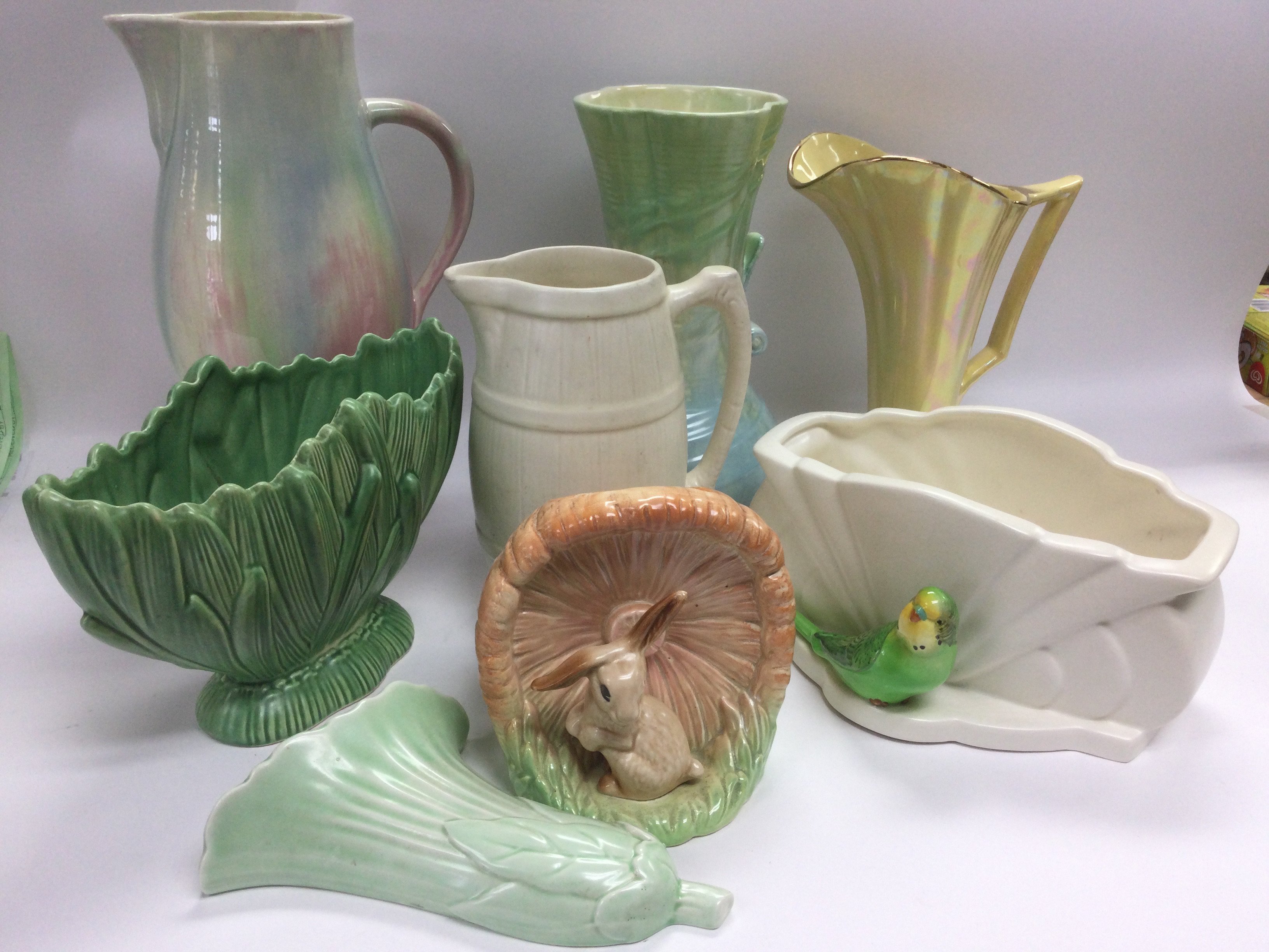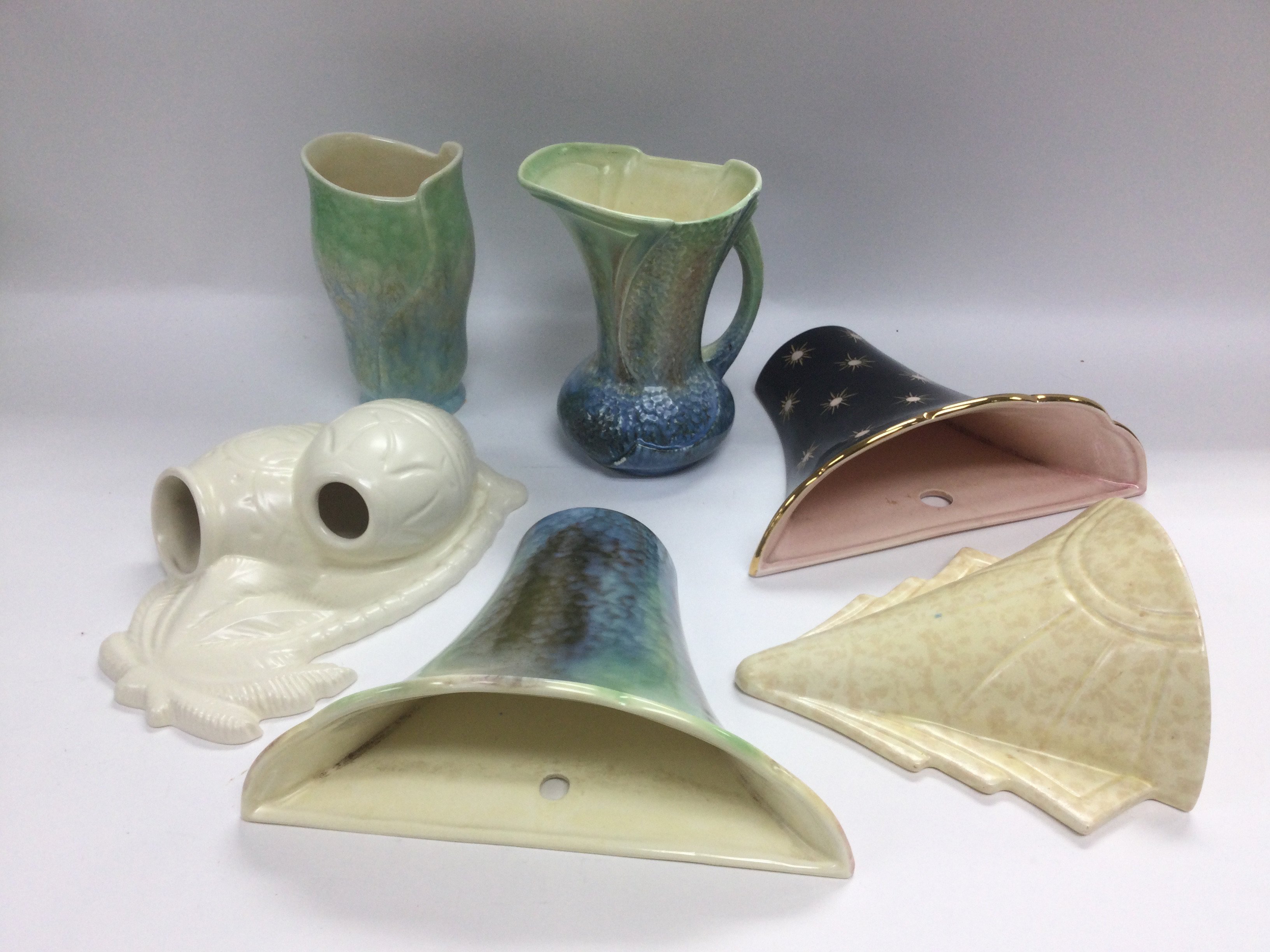A collection of Art Deco and vintage vases and wall pockets comprising Sylvac and Beswick examples. Shipping category D.